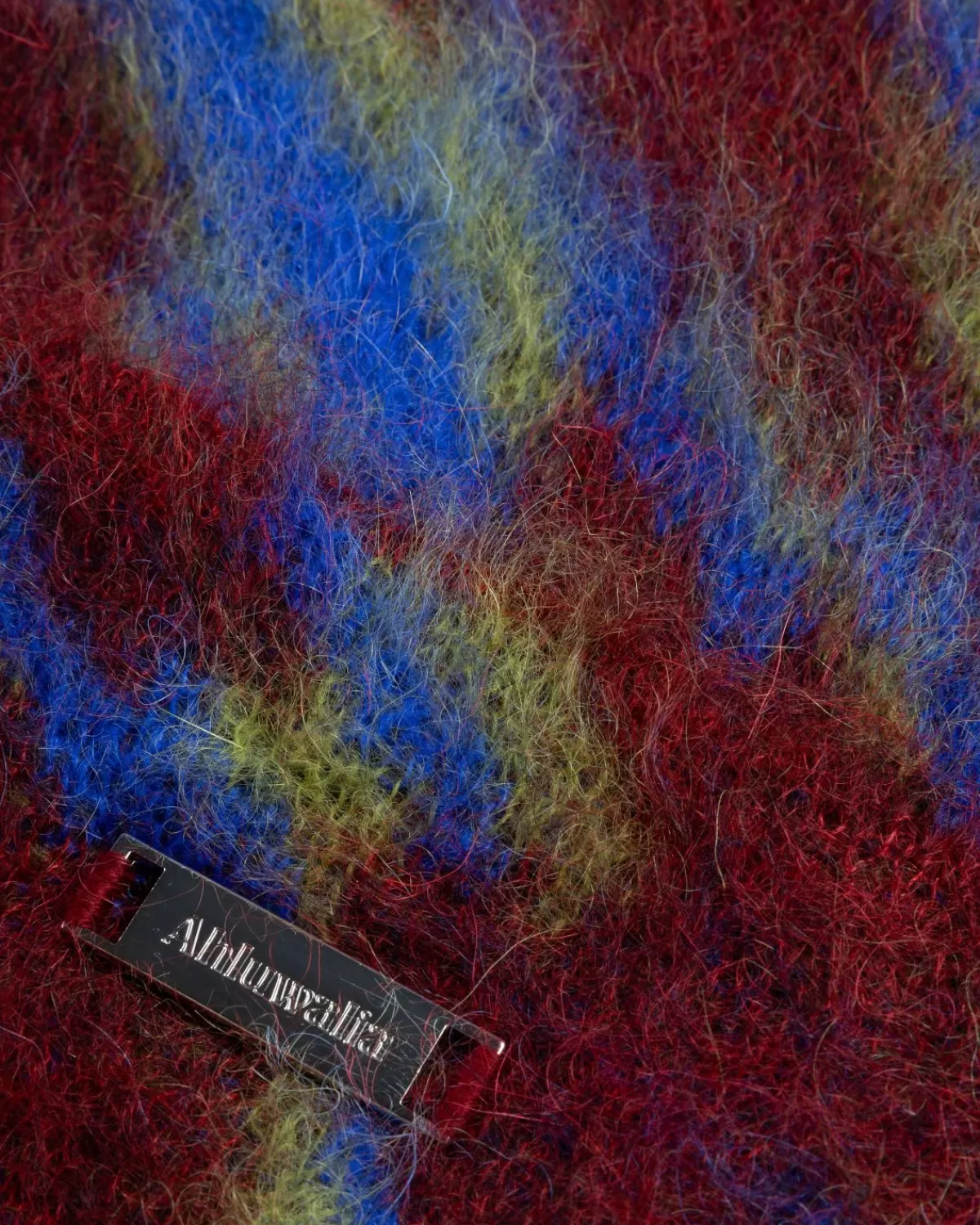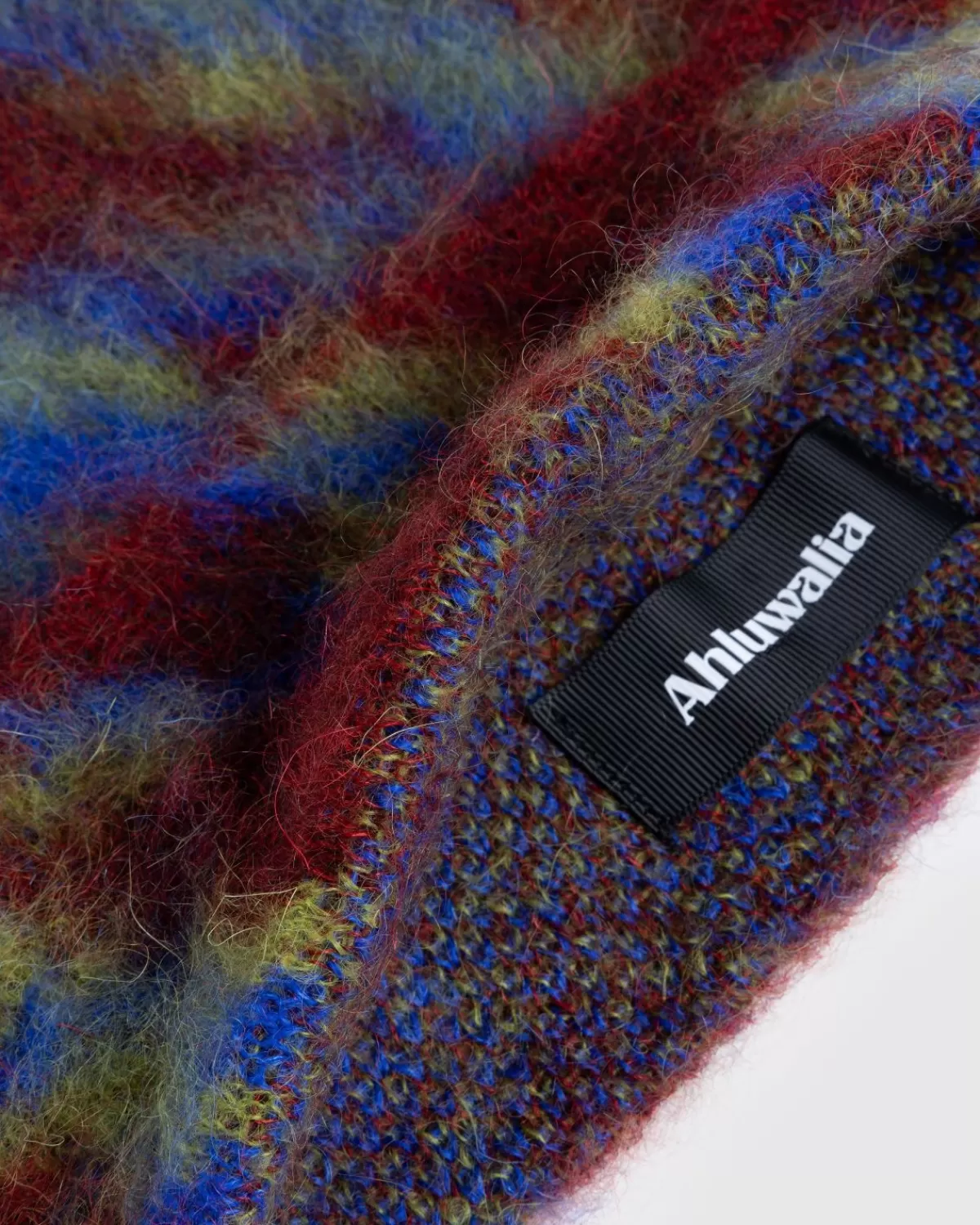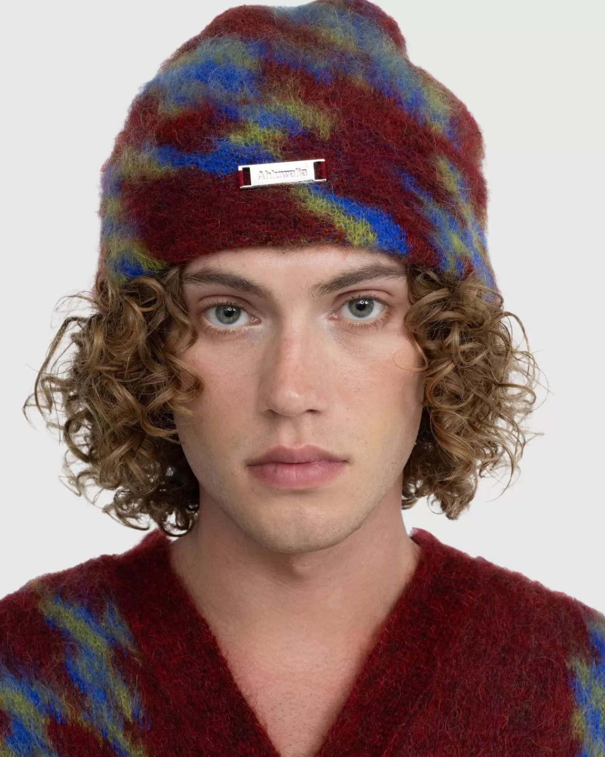 De Ongoye Beanie Is Een Speelse Variant Op Een Klassieke Hoofddekselstijl En Heeft Een All-Over Motief Met Accenten Van Maagdenpalmblauw En Tropisch Geel Tegen Kastanjebruin Mohairgaren Afkomstig Van Ethische Boeren. Het Heeft Een Traditionele Opstaande Rand, Gedetailleerd Met Merkhardware.