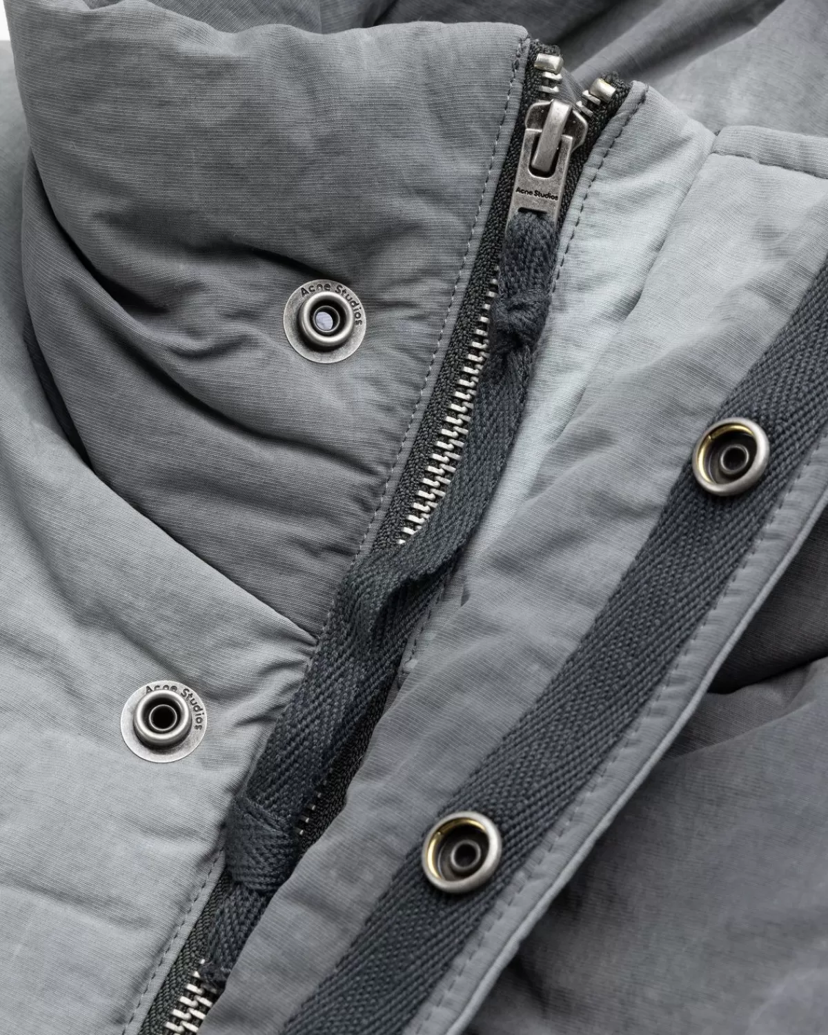 Het Padded Nylon Jacket Van Acne Studios Is Zowel Gezellig Als Stijlvol En Is Een Volledig Gevoerd Unisex-Model, Gemaakt Van Nylon En Polyester. Het Is Uitgerust Met Een Ritssluiting Middenvoor En Een Klittenbandsluiting, Een Hoge Kraag, Elastische Manchetten En Zoom En Een Trekkoord In De Onderste Band. De Acne-Buitenkledingstijl Heeft Een Relaxte Pasvorm Die Geschikt Is Voor Zware Laagjes Eronder En Is Afgewerkt In Een Tonale Grijze Kleurstelling