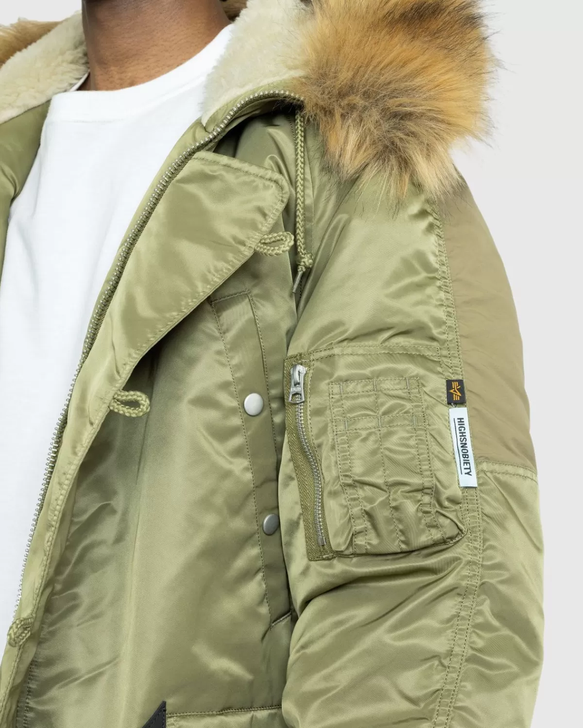 De N3B-Parka, Oorspronkelijk Geproduceerd In De Jaren Vijftig Voor Het Amerikaanse Leger, Is Een Van De Twee Stijlen Uit Onze Nieuwste Samenwerking Met Alpha Industries. De Vernieuwde Parka Heeft Een Boxy, Oversized Pasvorm Met Verlaagde Schouders En Is Geverfd Met Onze Op Maat Gemaakte Flight-Beits. Het Volledig Gevoerde Jack Is Gedetailleerd Met Een Met Imitatie-Mouton Gevoerde Capuchon En Een Afneembare Rand Van Imitatiebont En Heeft Een Dubbele Borstzak En Paspelzakken Met Drukknopen Onderaan. Merklogo’S Zijn Te Vinden Op De Stormflap Aan De Binnenkant En De Ritssluiting Aan De Voorkant, Terwijl De Onderarmpanelen Worden Geaccentueerd Met Tonaal Mat Nylon. Op De Kenmerkende Praktische Zak Op De Mouw Zit Een Speciaal Geweven Highsnobiety-Vlaglabel.