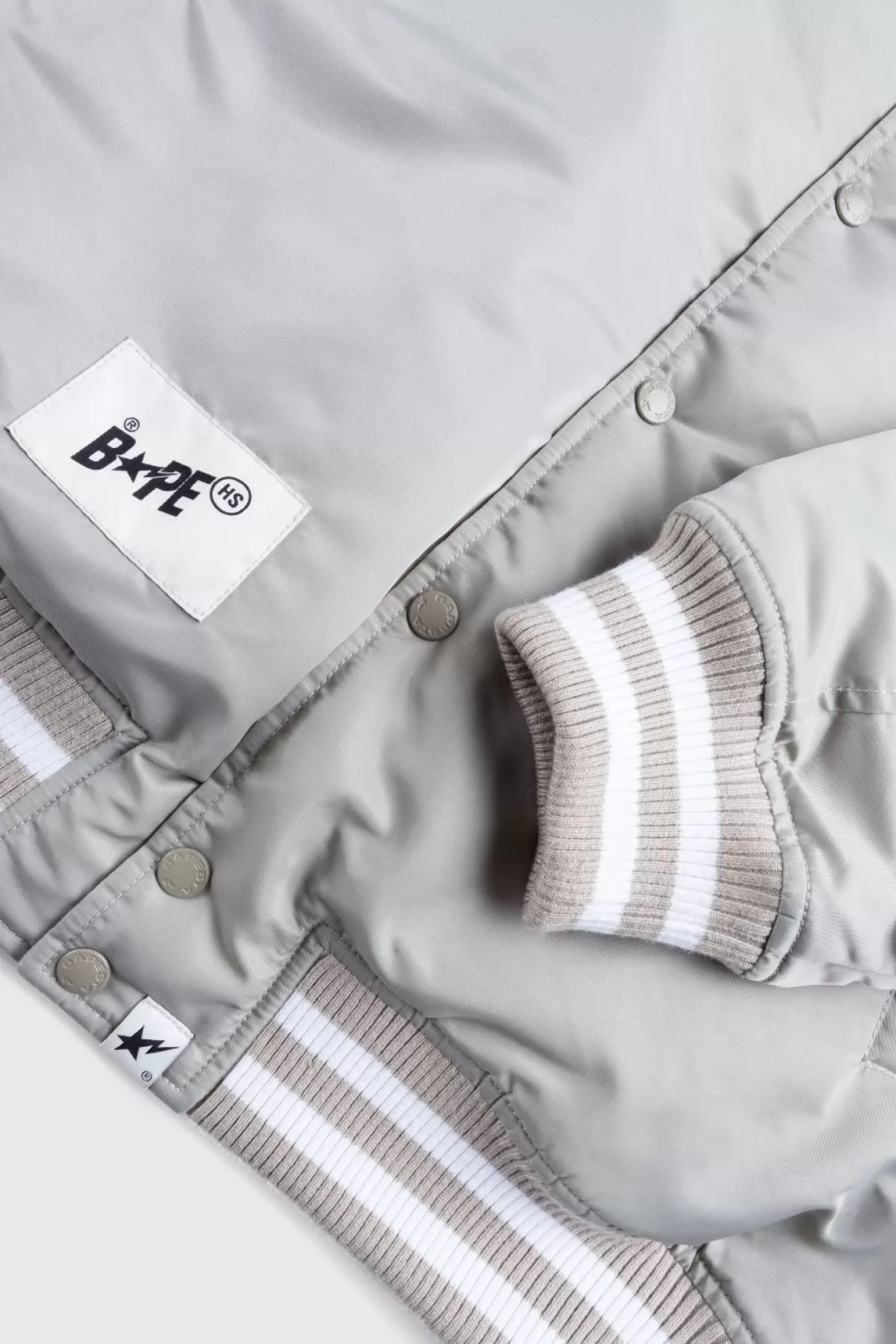 Voor Onze Vierde Samenwerking Met Bape Werkten We Samen Met Het Baanbrekende Merk Aan Een Reeks Hoogwaardige Essentials In Drie Verschillende Tinten. Het Nylon Varsity-Jack Is Een Klassieke Bovenkledingstijl In Een Monochrome Kleurstelling Met Gestreepte, Tonale Tinten Aan De Kraag, Zoom En Manchetten. Op De Borst Is Een Applicatie Van Sta Te Vinden, Samen Met Een Co-Branded Logo Aan De Achterkant, Beide Gedetailleerd Met Ingewikkelde Randstiksels. Het Jack Is Afgewerkt Met Een Knoopsluiting, Paspelzakken Aan De Voorkant En Een Geweven Merklabel Boven De Zoom.