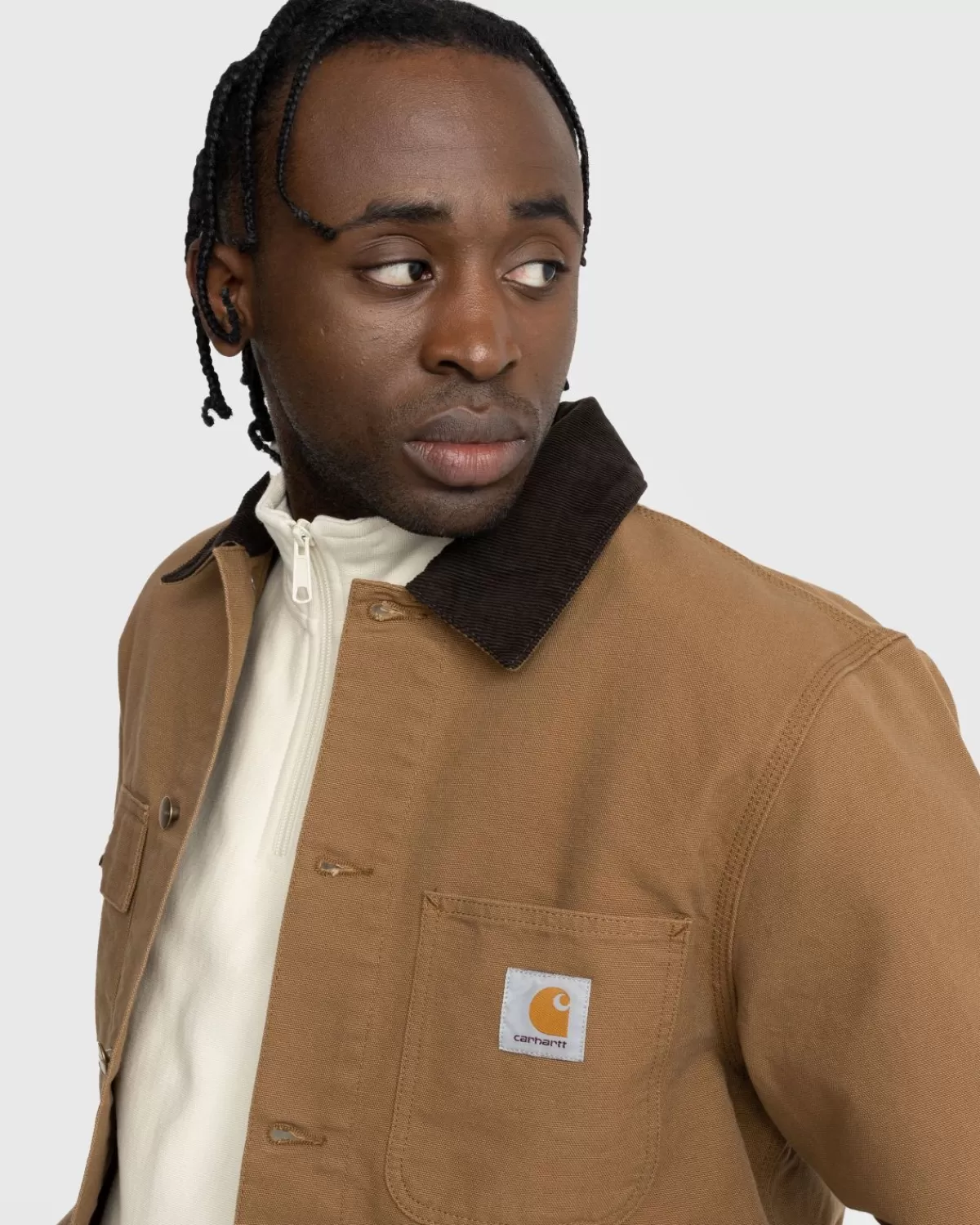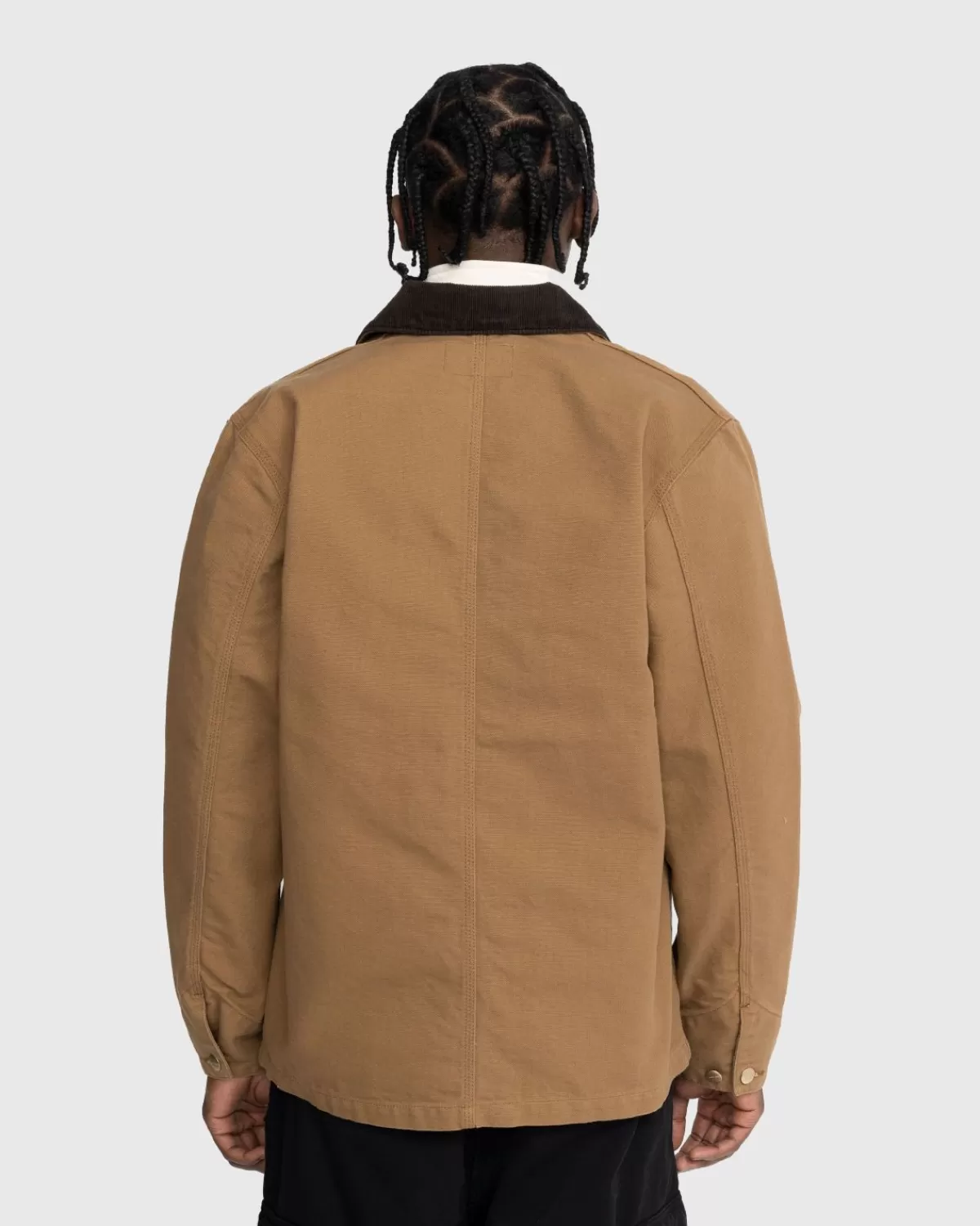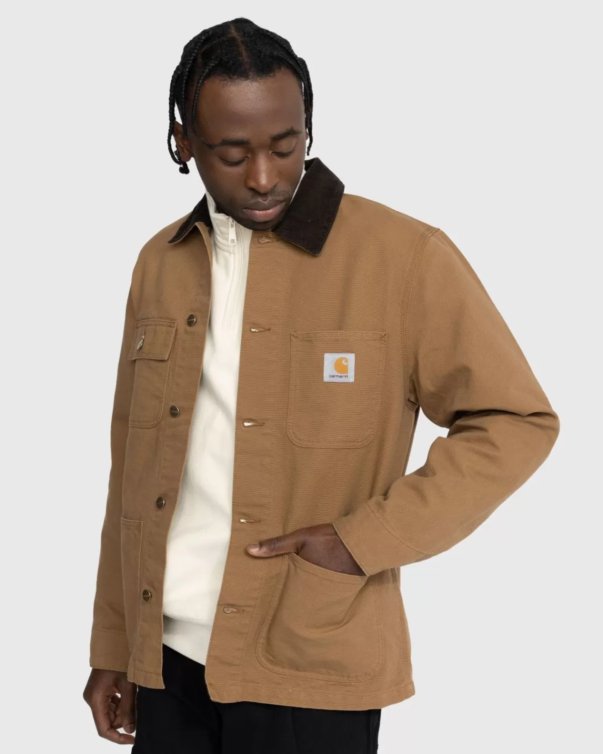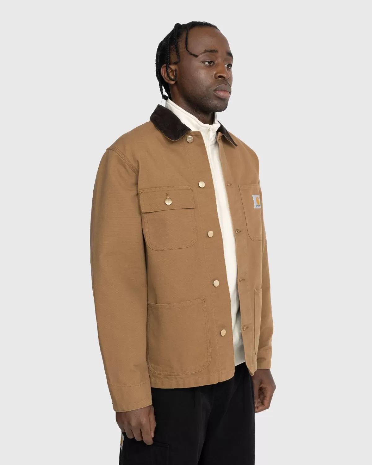 De Michigan Is Een Klassiek Karweijassilhouet En Is Gemaakt Van Carhartt’S 12Oz Biologisch Katoenen Dearborn-Canvas. Het Kledingstuk Is Ongevoerd, Waardoor Het Iets Lichter En Ademender Is. Het Heeft Een Kraag Van Corduroy, Een Gepersonaliseerde Knoopsluiting, Verstelbare Manchetten Met Knopen En Opgestikte Zakken Aan De Voorkant Voor Een Tastbare Touch. Een Geweven Vierkant Logolabel Is Op De Voorkant Verwerkt Om Het Ontwerp Compleet Te Maken.