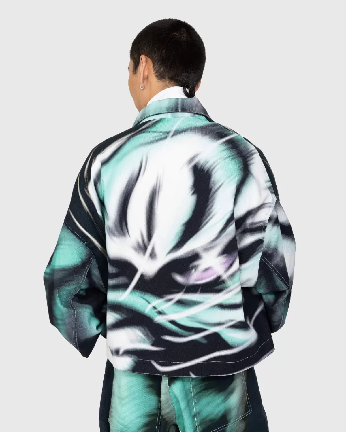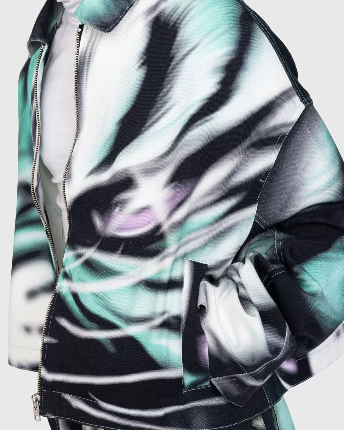 Met Een Smaakvol Oog Voor Unieke Graphics En Esthetiek Is De Gelijknamige Lijn Van Gerrit Jacob Snel Gestegen Onder De Bloeiende Ontwerpers Van Deze Generatie. Het Merk Biedt Verschillende Silhouetten Uit Zijn Confectiecollecties, Maakt Gebruik Van Beelden En Motieven Uit Het Duitse Erfgoed Van De Ontwerper En Herschept Deze In Levendige Collecties Die Kitsch Combineren Met Hedendaagse Luxe. Het Bedrukte Spijkerjack, Een Essentieel Onderdeel Uit De Tweede Collectie Van Het Merk, Is Hier Te Zien In Een Reeks Groene, Zwarte En Witte Tinten Met Een Metgezel Met Bakkebaarden, Klaar Voor Actie.