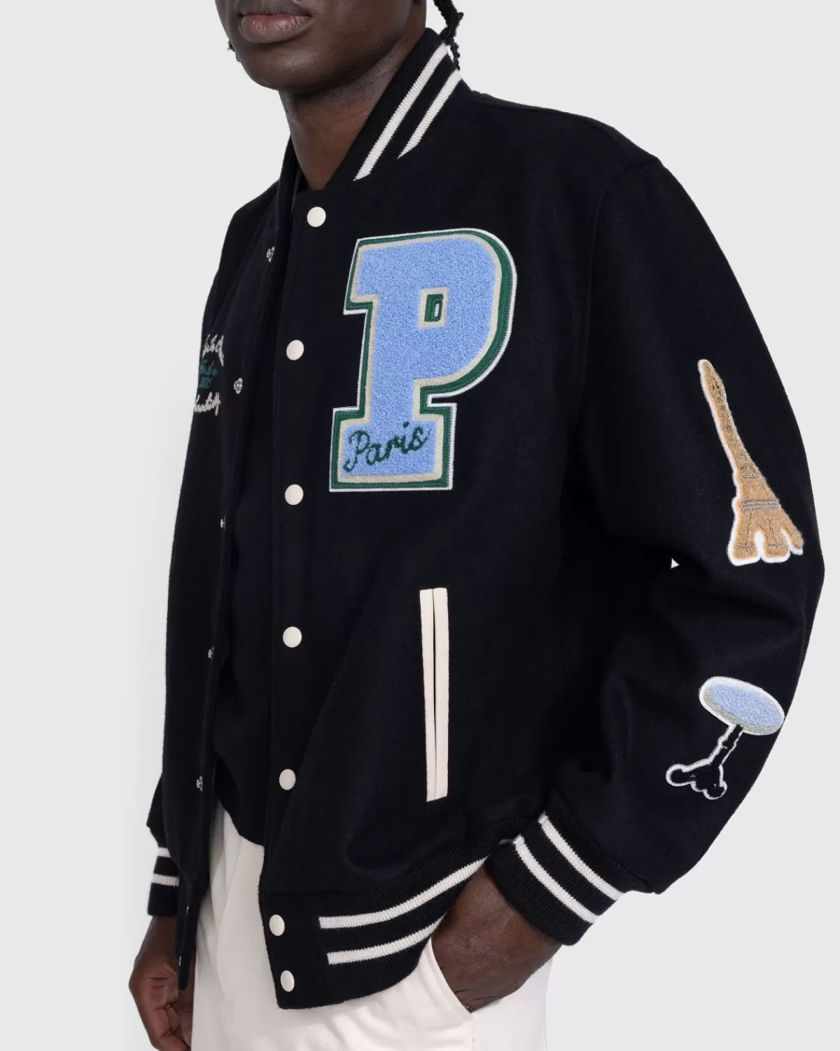 Dit Grafische Varsity-Jack Is Een Ode Aan Alles Wat Parijs Is, Met Patches Op De Mouwen, Waaronder Illustraties Van De E…