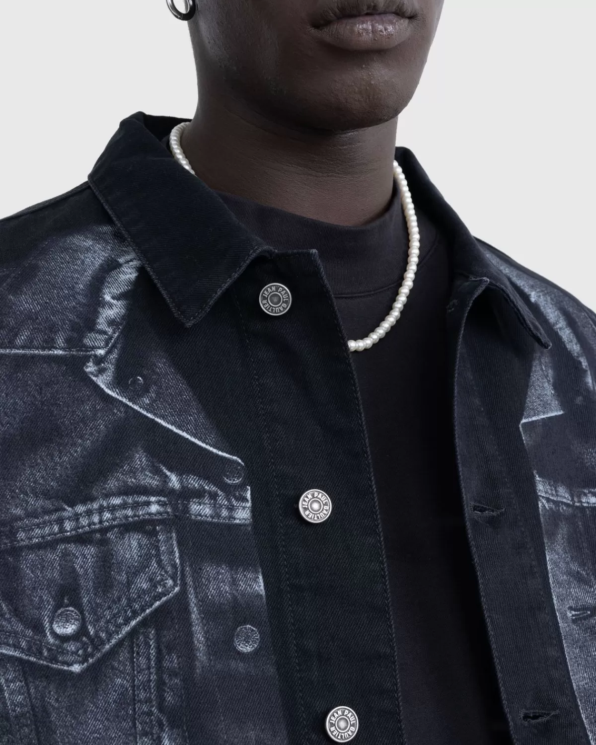 Deze Opvallende Jean Paul Gaultier-Stijl Is In Wezen Een Spijkerjasje Dat Op Een Spijkerjasje Is Gedrukt. Het Kledingstuk Is Gemaakt Van Non-Stretch Denim En Heeft Een All-Over Trompe L’Œil Grafische Print Die De Look Van Een Spijkerjasje Nabootst. Het Kledingstuk Heeft Een Gespreide Kraag, Een Knoopsluiting Aan De Voorkant, Manchetten Met Knopen En Knoopsluitingen Aan De Achterkant Van De Zoom. Op De Achterzoom Is Een Logopatch Verwerkt Om Het Kledingstuk Te Markeren.