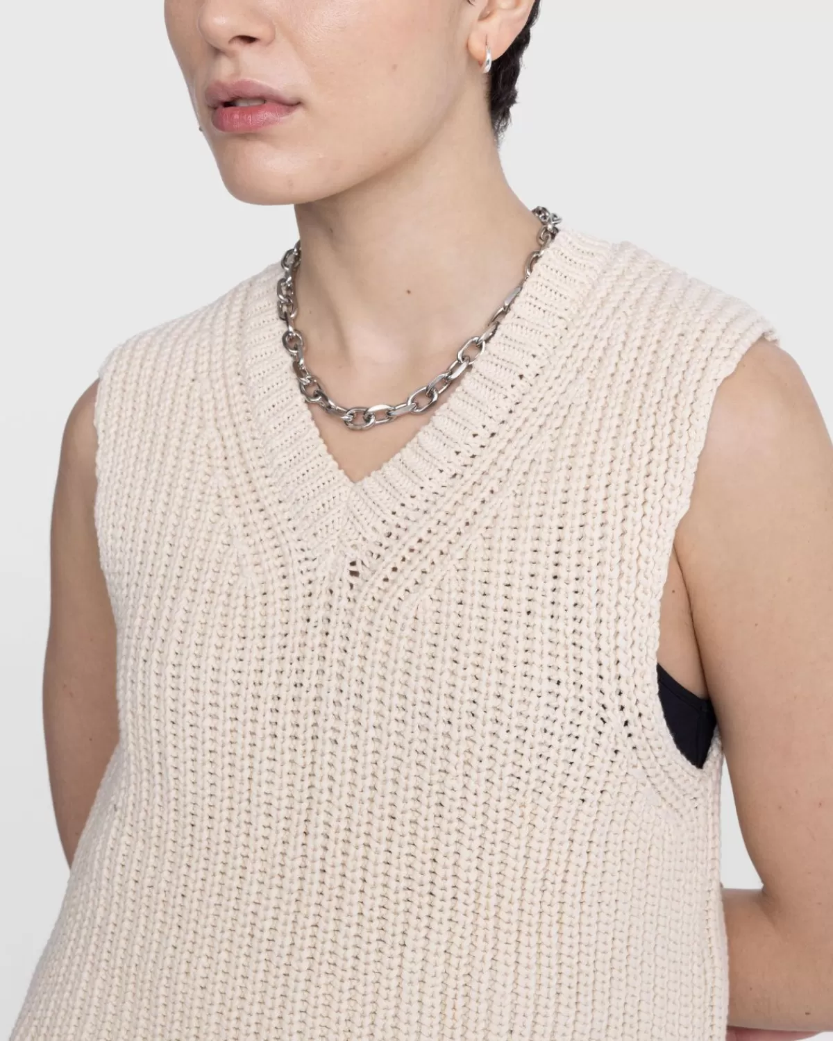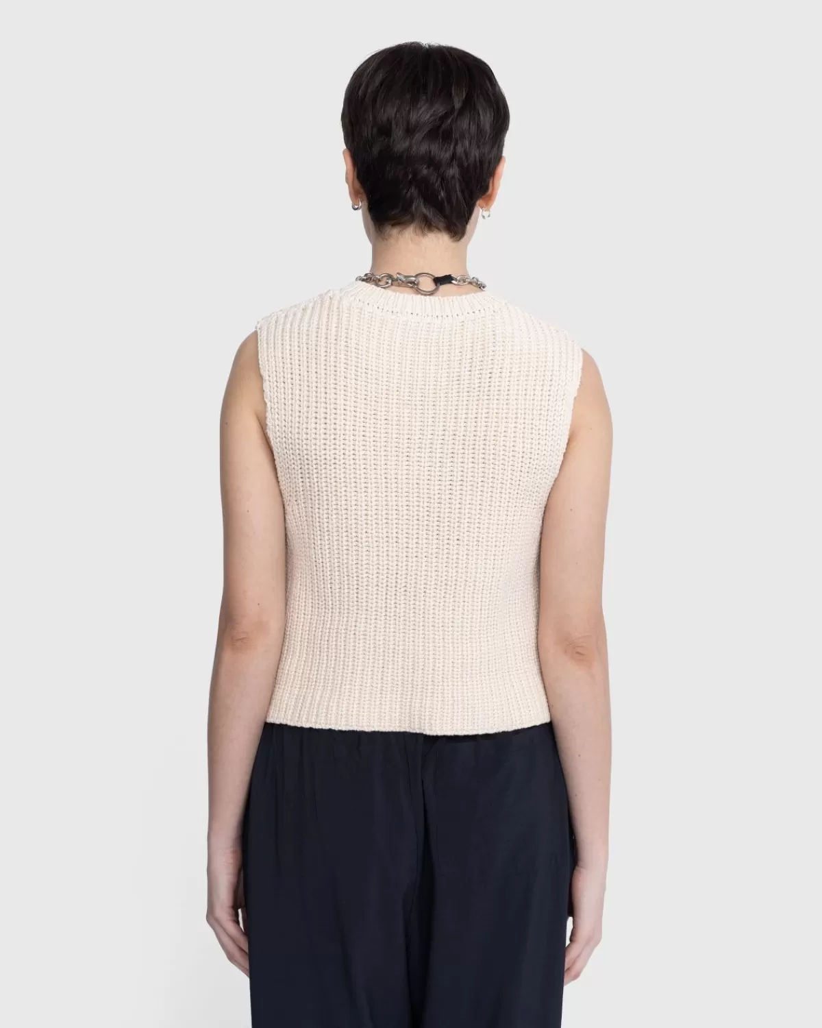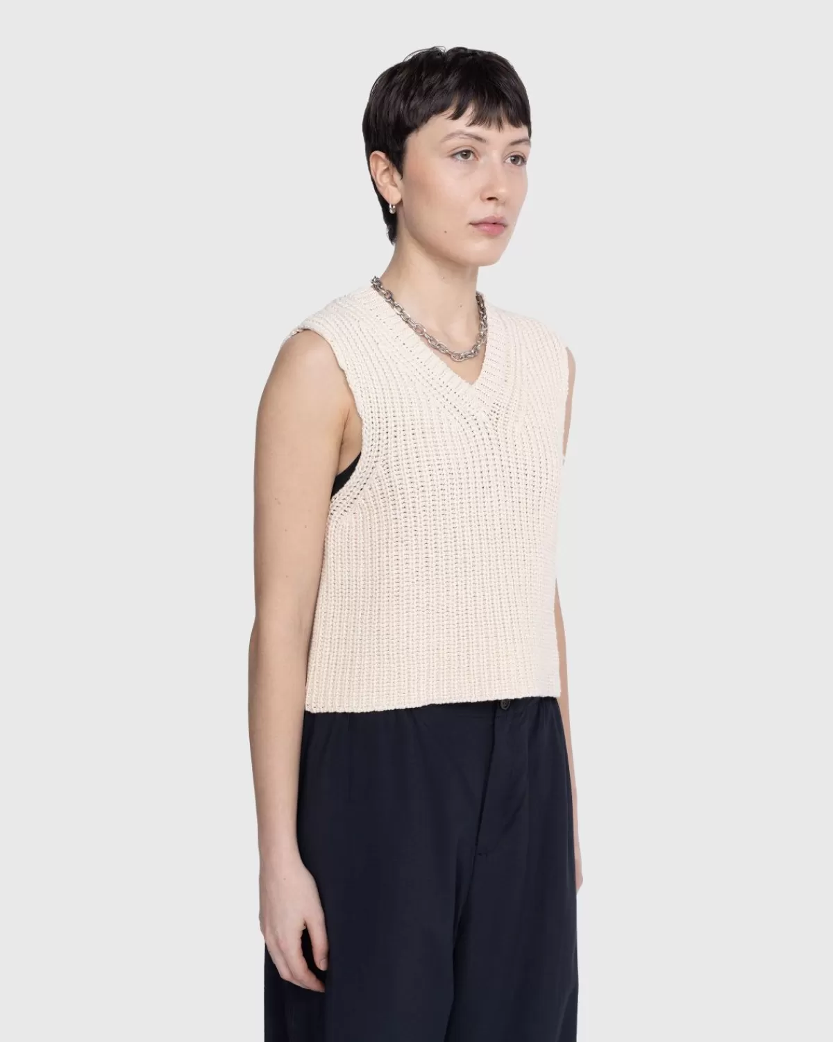 Het Intact Vest Is Een Kenmerkende Our Legacy-Stijl Met Een Slanke, Cropped Pasvorm Die Geschikt Is Voor Avontuurlijke Laagjes. Het Mouwloze Kledingstuk Is Gemaakt Van Een Grof Geribd Katoenen Breisel En Zal Zich Naar De Drager Vormen En Na Verloop Van Tijd Op Natuurlijke Wijze Slijten. Het Is Gedetailleerd Met Een Geribbelde Kraag Met V-Hals, Aangeboden In Een Neutrale Witte Kleurstelling Voor Moeiteloze Matching Van Seizoen Tot Seizoen.
