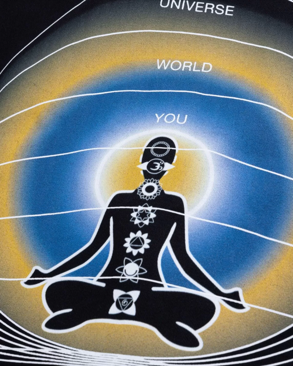 Het Utopia Work Jacket Is Gemaakt Van Upcycled Katoen En Gerecyclede Gebroken Keperstof, Met Resten En Twill Afkomstig Van Kledingfabrieken In Indonesië. Het Is Versierd Met Meditatiespecifieke Afbeeldingen, Uitgevoerd In Inkt Op Waterbasis. Het Bijbehorende Swinglabel Van Het Jasje Is Gemaakt Van Gerecycled Plastic En Kan Worden Hergebruikt Als Onderzetter Of Als Decoratief Bureauobject.