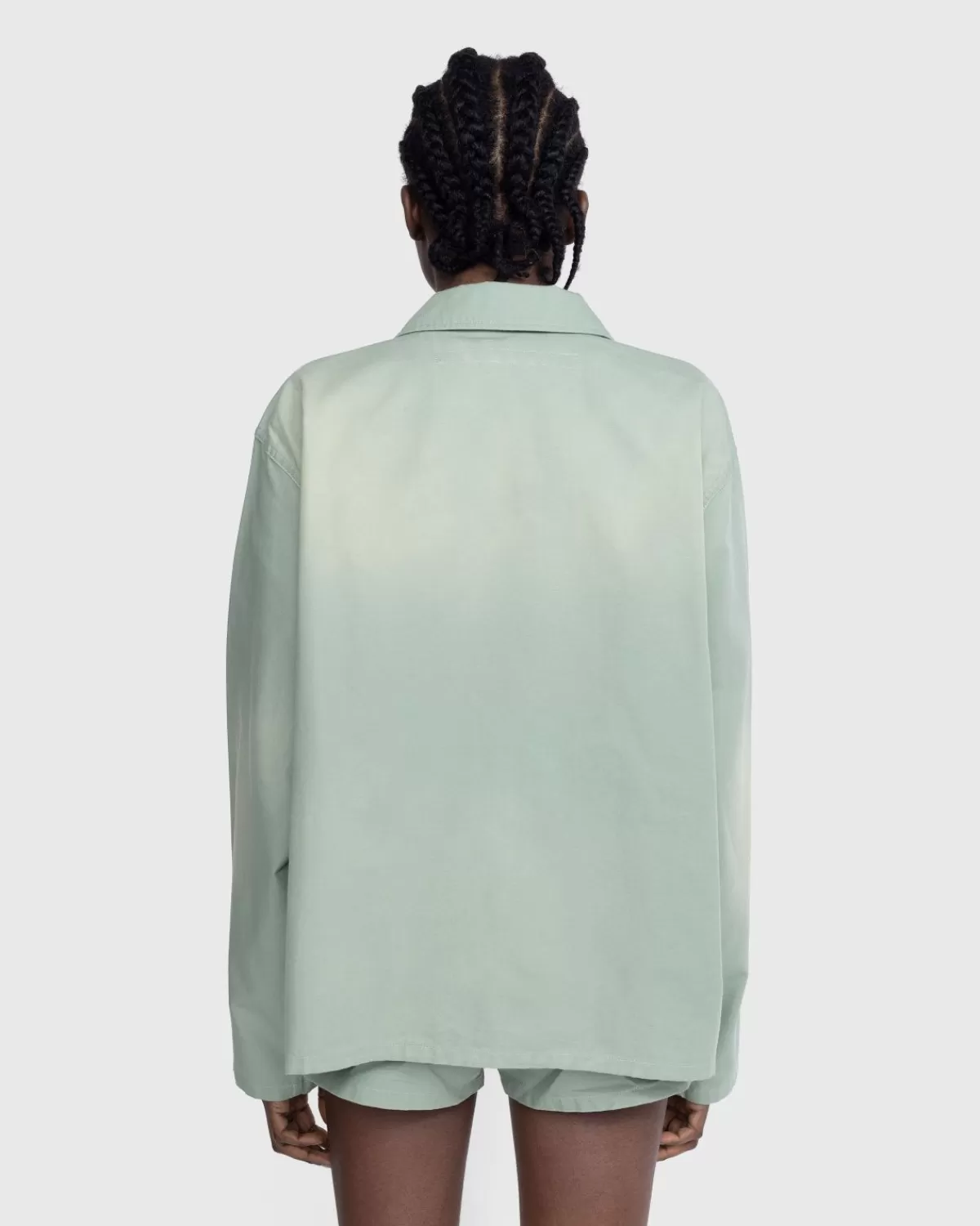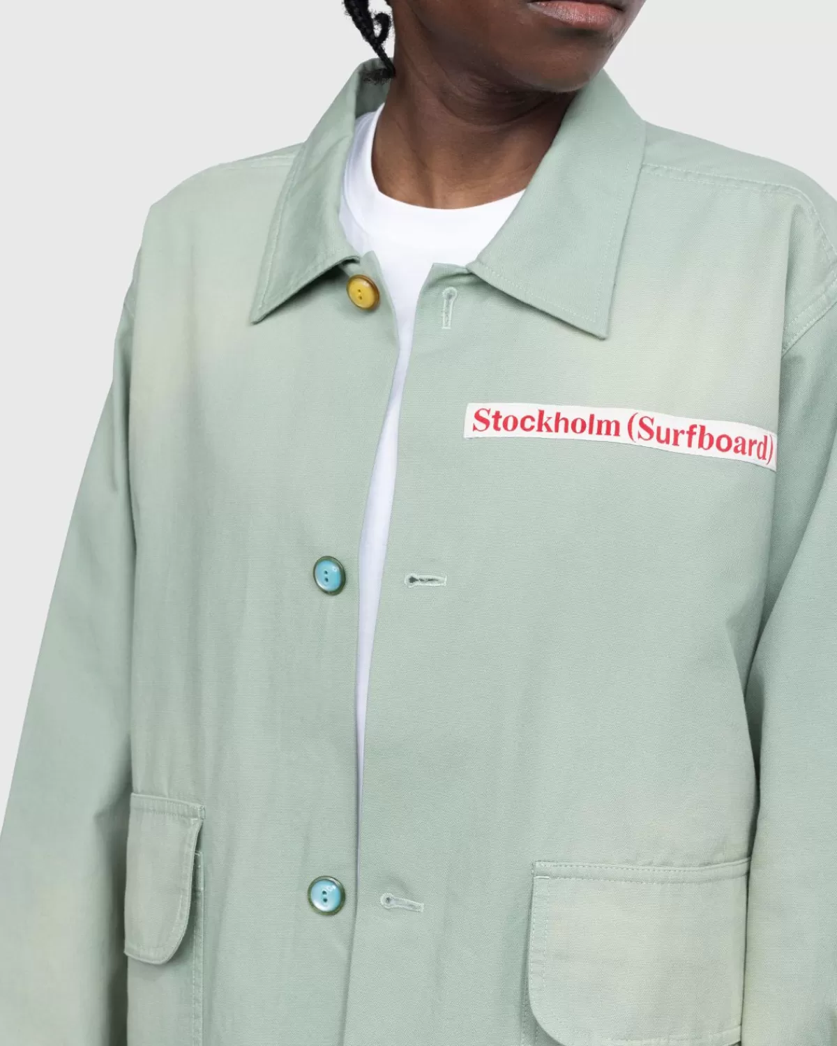 Stockholm Surfboard Club Vernieuwt Het Klassieke Coachjack En Voert Het Basiskledingstuk Uit In Lichtgewicht Katoenen Canvas. Het Wordt Geleverd In Een Neutrale Salie-Kleurstelling Met Fel Contrasterende Knoppen In Het Midden. Aan De Voorkant Zijn Grote Klepzakken Verwerkt En Het Model Is Afgewerkt Met Een Geweven Logolabel Op De Borst.