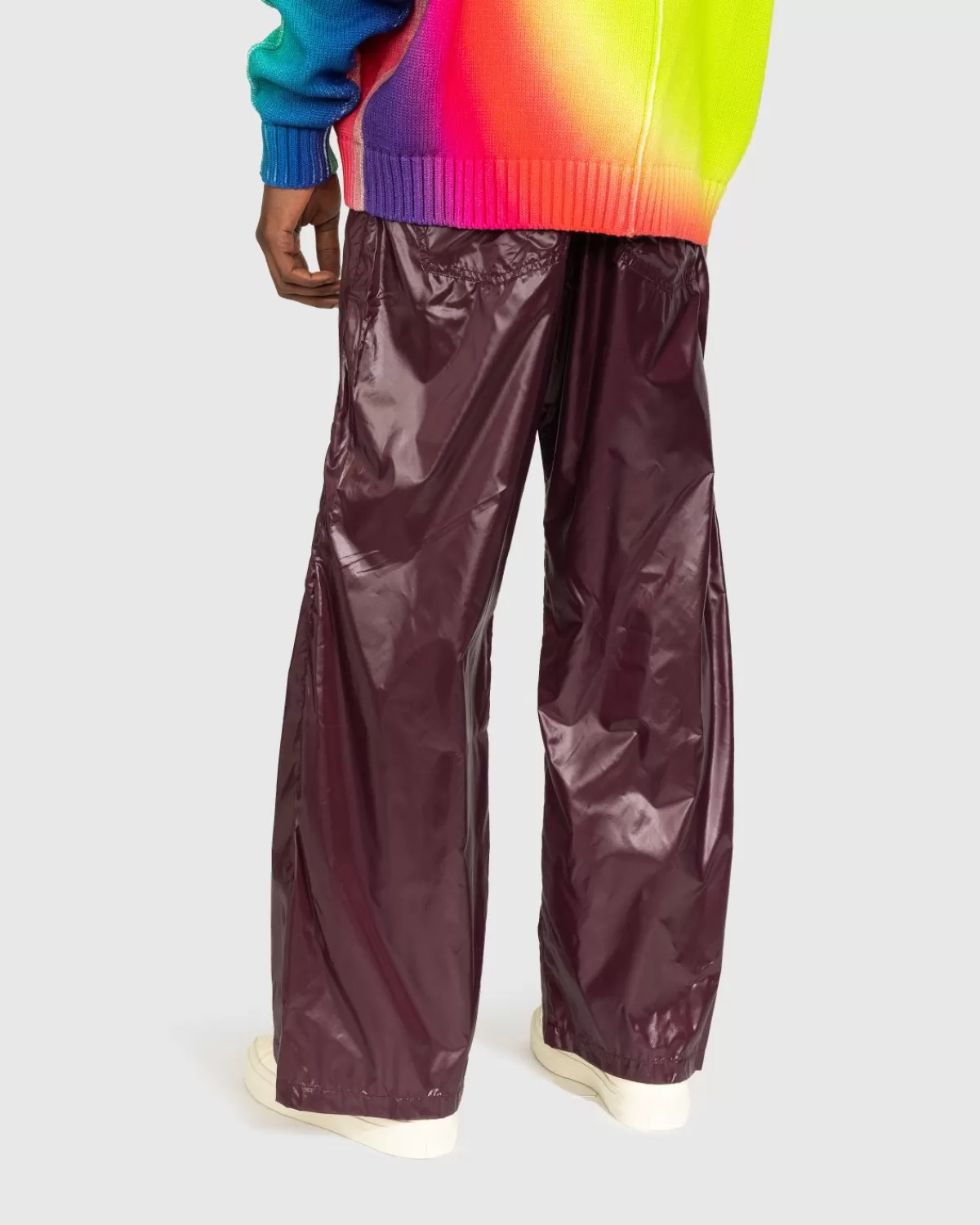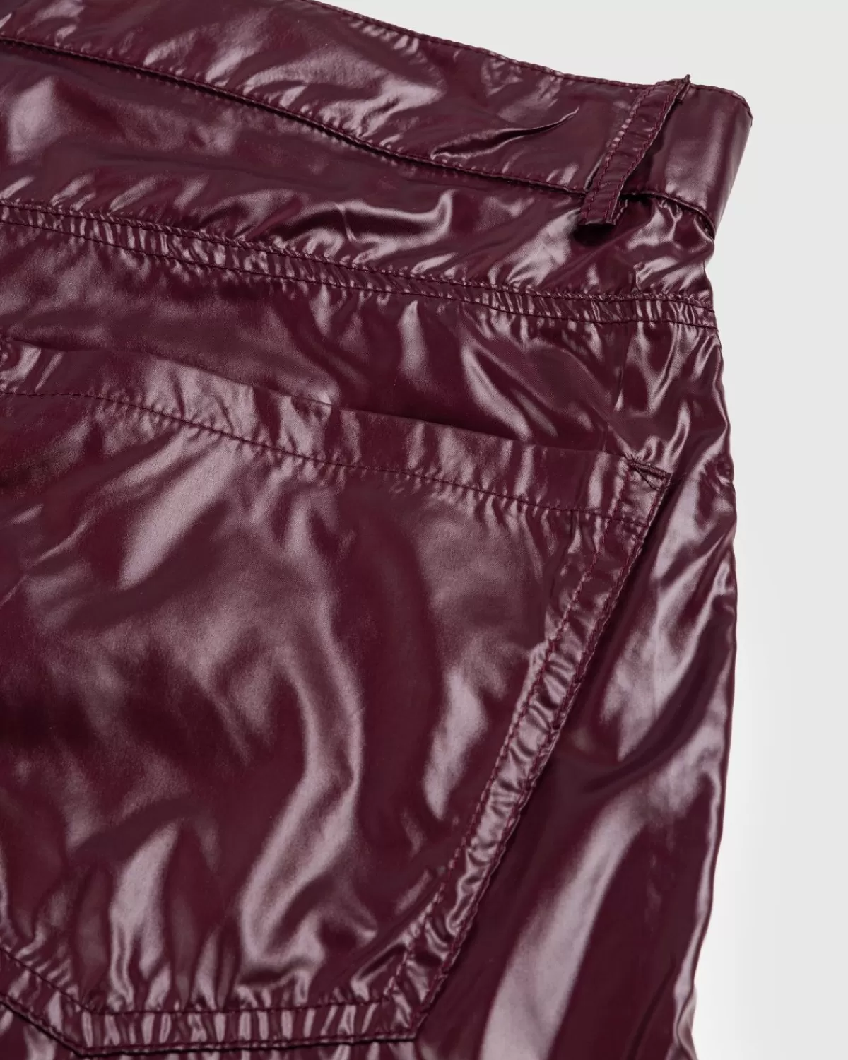 Het Glanzende Nylonmateriaal Van Deze Broek Vertaalt Zich In Een Leerachtige Look Voor Een Opvallende Stijl. De Broek Is Verkrijgbaar In Een Paarse Kleurstelling En Heeft Een Traditionele Vijfpocketconstructie, Met Knoopsluiting, Een Ritssluiting En Riemlussen Langs De Taille. De Pasvorm Is Op Maat Gesneden Met Wijde Pijpen.