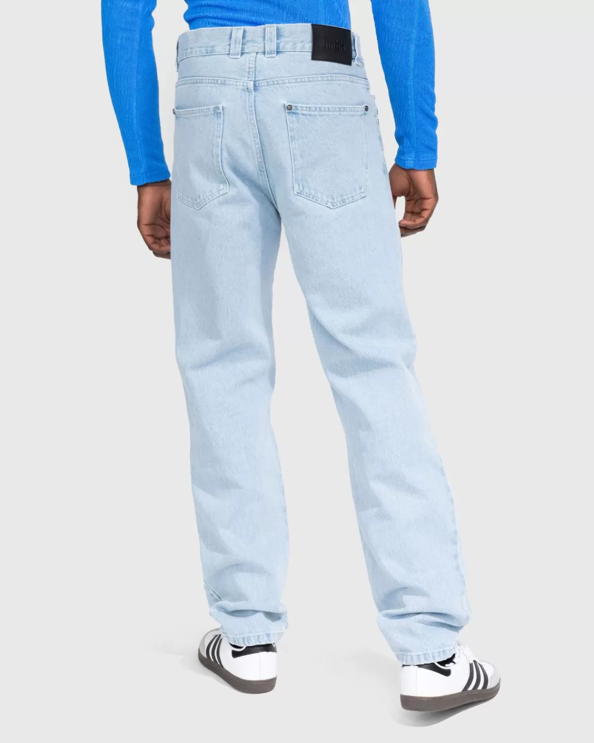 Deze Unisex Denimstijl Van Gmbh Kiest Voor Een Enkele Ritssluiting Aan De Voorkant In Plaats Van De Kenmerkende Dubbele Ritssluiting Van Het Merk. Het Paar Is Gemaakt Van 100% Biologisch Katoen En Heeft Een Normale Pasvorm, Een Hoge Taille En Rechte Pijpen. Het Heeft Een Klassieke Vijfpocketconstructie En Is Gedetailleerd Met Hardware En Knopen In Dezelfde Kleur In Reliëf, Evenals Een Leren Logopatch Achter Op De Taille.