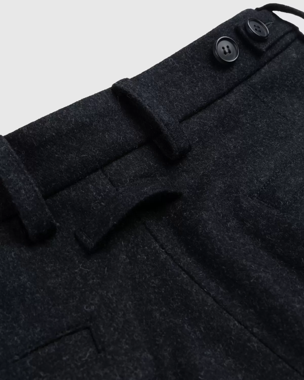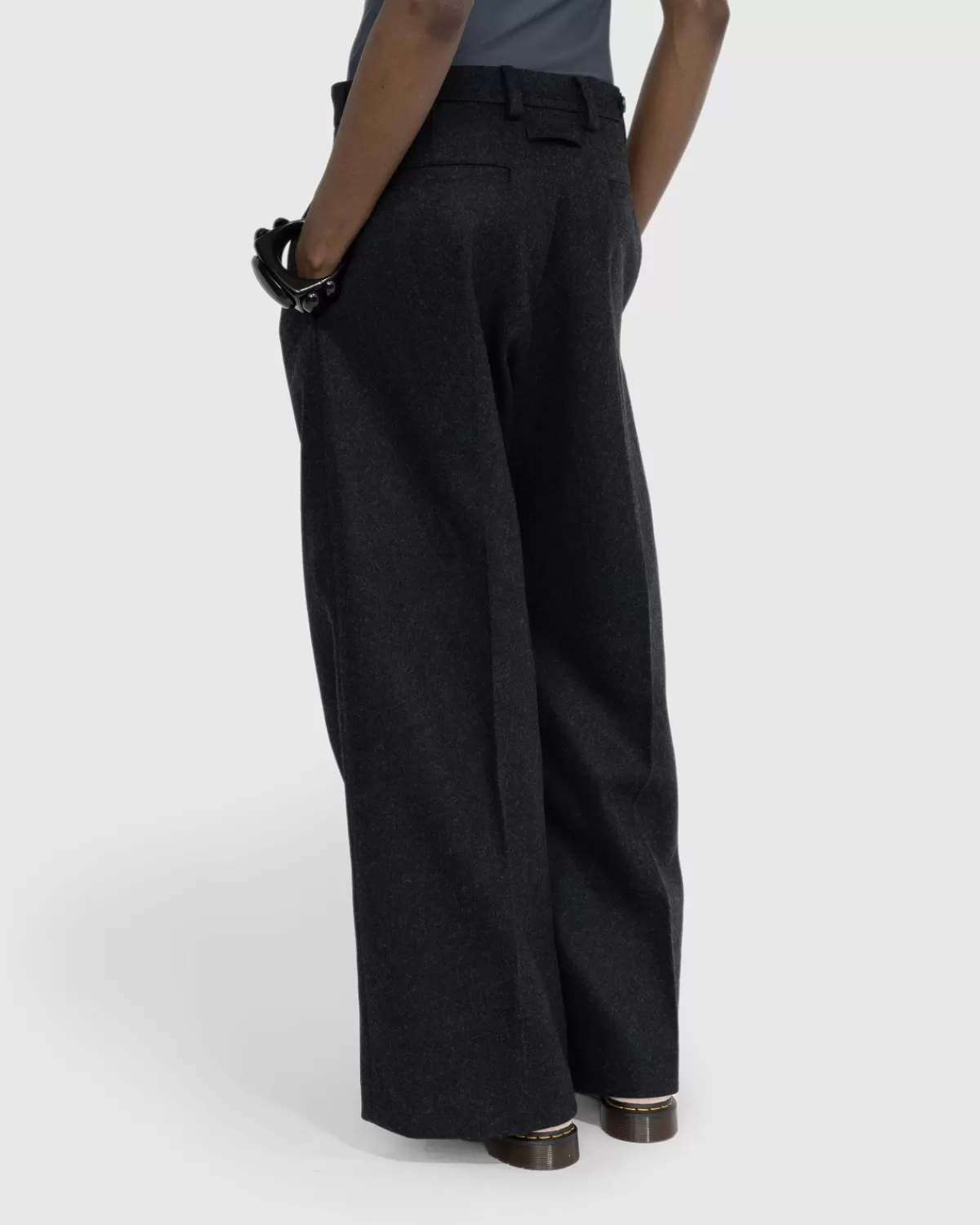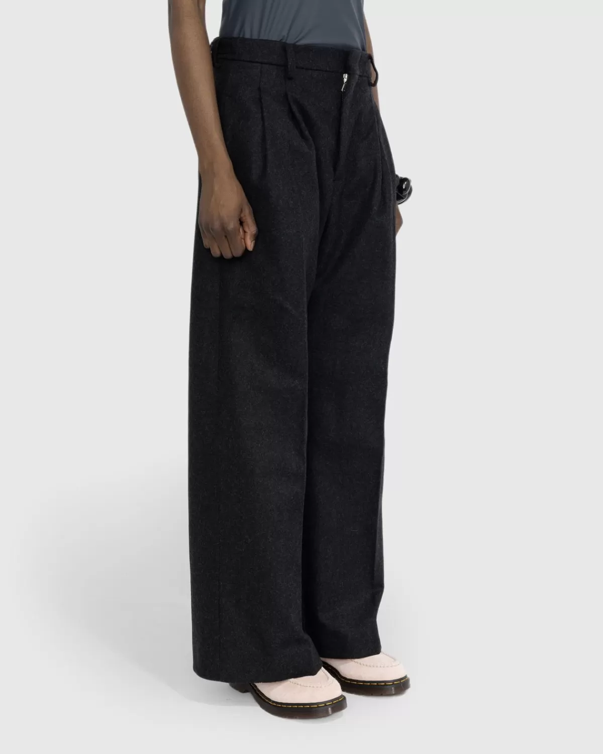 De Felted Wool Suit Pants Is Opgenomen In De Retro-Futuristische Cyber-Collectie Van Jean Paul Gaultier, Die Bestaat Uit Polariserende Confectiestijlen Die Verwijzen Naar De Iconische Archieven Uit De Jaren 90 Van Het Huis. Zoals De Naam Al Doet Vermoeden, Is Het Paar Voornamelijk Gemaakt Van Wol, Met Een Wijde Snit En Een Lage Taille. De Donkergrijze Stijl Is Gemaakt Met Plooien Aan De Voorkant, Riemlussen, Zijverstellers En Een Klassiek Ontwerp Met Vier Zakken.