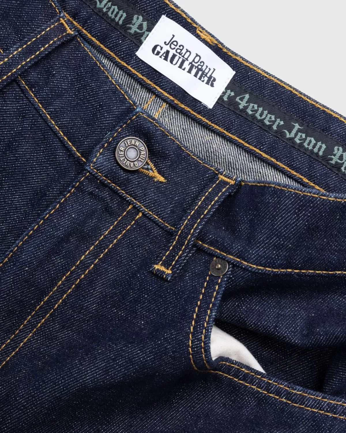 Jean Paul Gaultier Vervormt Het Klassieke Jeanssilhouet Door De Pijpen Binnenstebuiten Te Draaien. Het Paar Met Rechte Pijpen Komt In Een Veelzijdige Indigo Kleurstelling, Met Een Traditionele Five-Pocket-Stijl, Maar Met Een Sluiting En Riemlussen Langs De Taille. Logodetails Zijn Op De Pijpen Gedrukt Om De Polariserende Stijl Definitief Te Benadrukken.