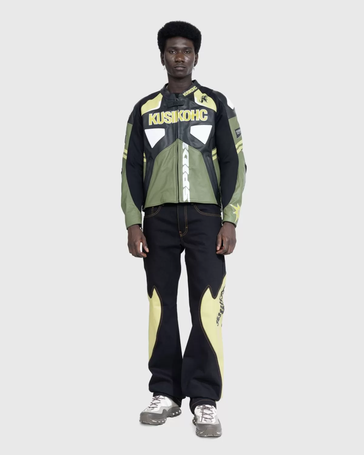 De Rider Pant Is Een Kenmerkende Kusikohc-Stijl. Dit Specifieke Paar Wordt Geleverd In Een Overwegend Zwarte Kleurstelling, Gemaakt Van Katoen Met Olijfkleurige Leren Inzetstukken. De Broek Heeft Een Middelhoge Pasvorm Met Rechte Pijpen En Is Gemaakt In Een Traditionele Five-Pocket-Stijl. Extra Details Zijn Onder Meer Een Knoopsluiting, Een Ritssluiting En Riemlussen In De Taille. Het Paar Is Afgewerkt Met Contrasterend Borduursel Op De Pijp.