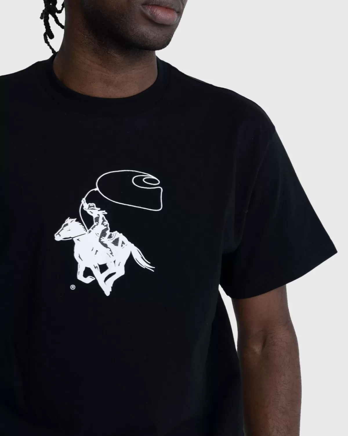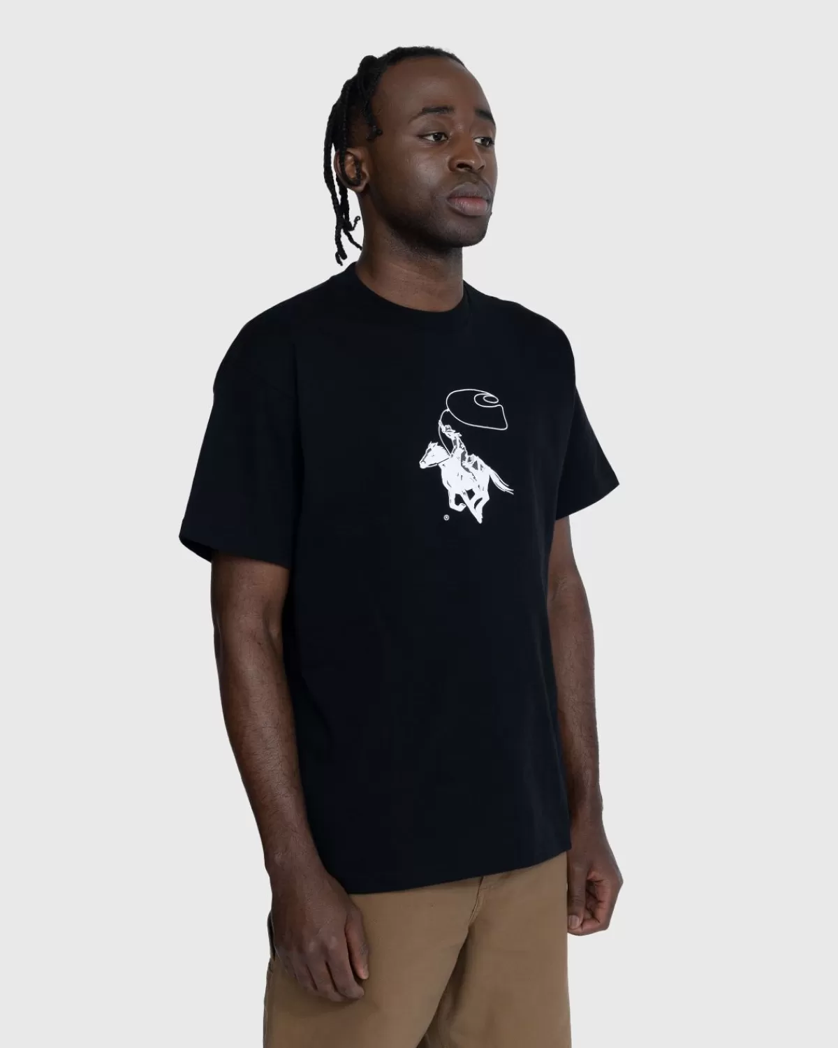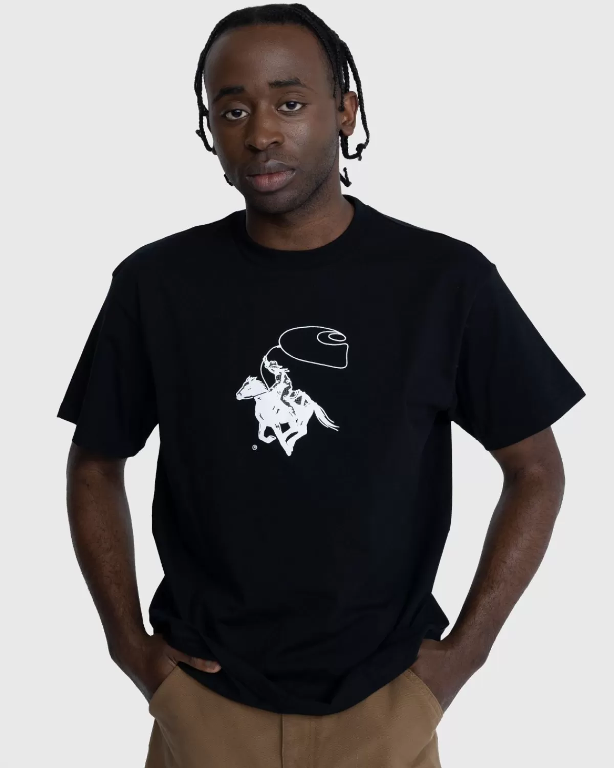 Het Lasso T-Shirt Is Een Nieuwe Seizoensstijl Versierd Met Een Speelse Grafische Print Van Een Cowboy Die Op Een Paard Rijdt En Een Lasso In De Vorm Van Het Carhartt-Logo Boven Zijn Hoofd Zwaait. De Top Is Gemaakt Van Lichtgewicht Single Jersey Van Biologisch Katoen En Heeft Een Losse, Boxy-Pasvorm.