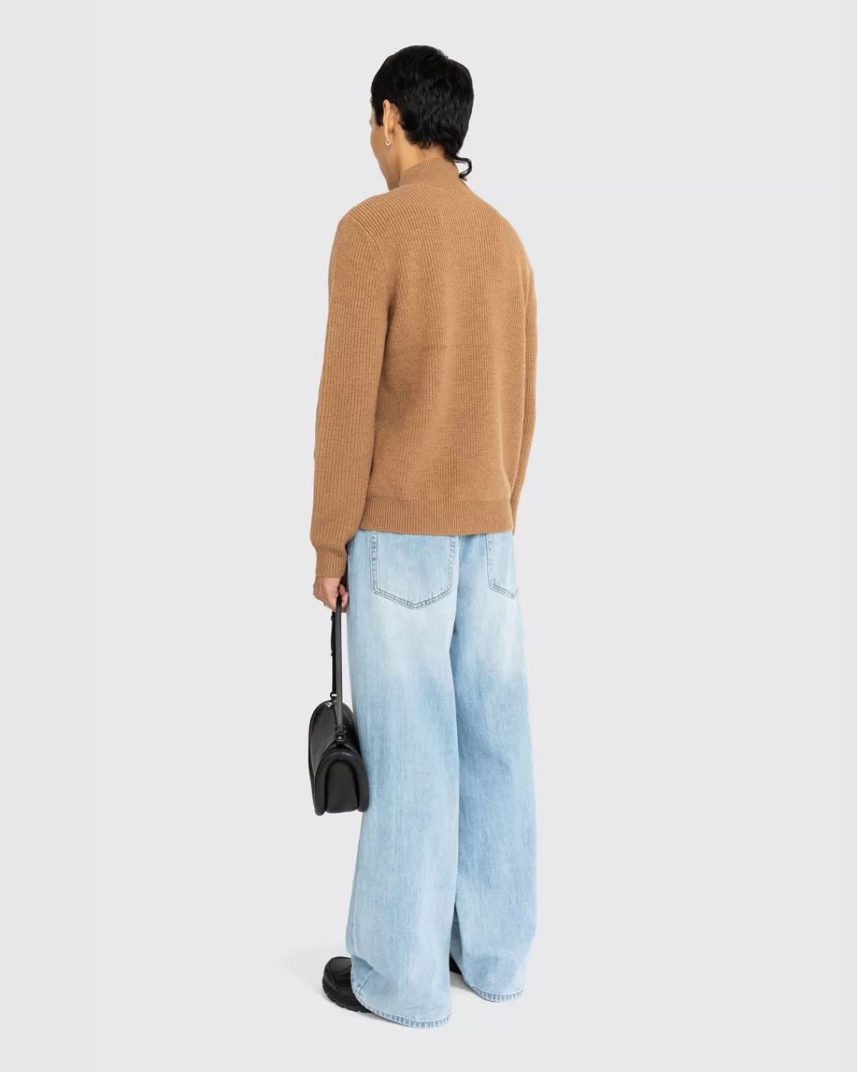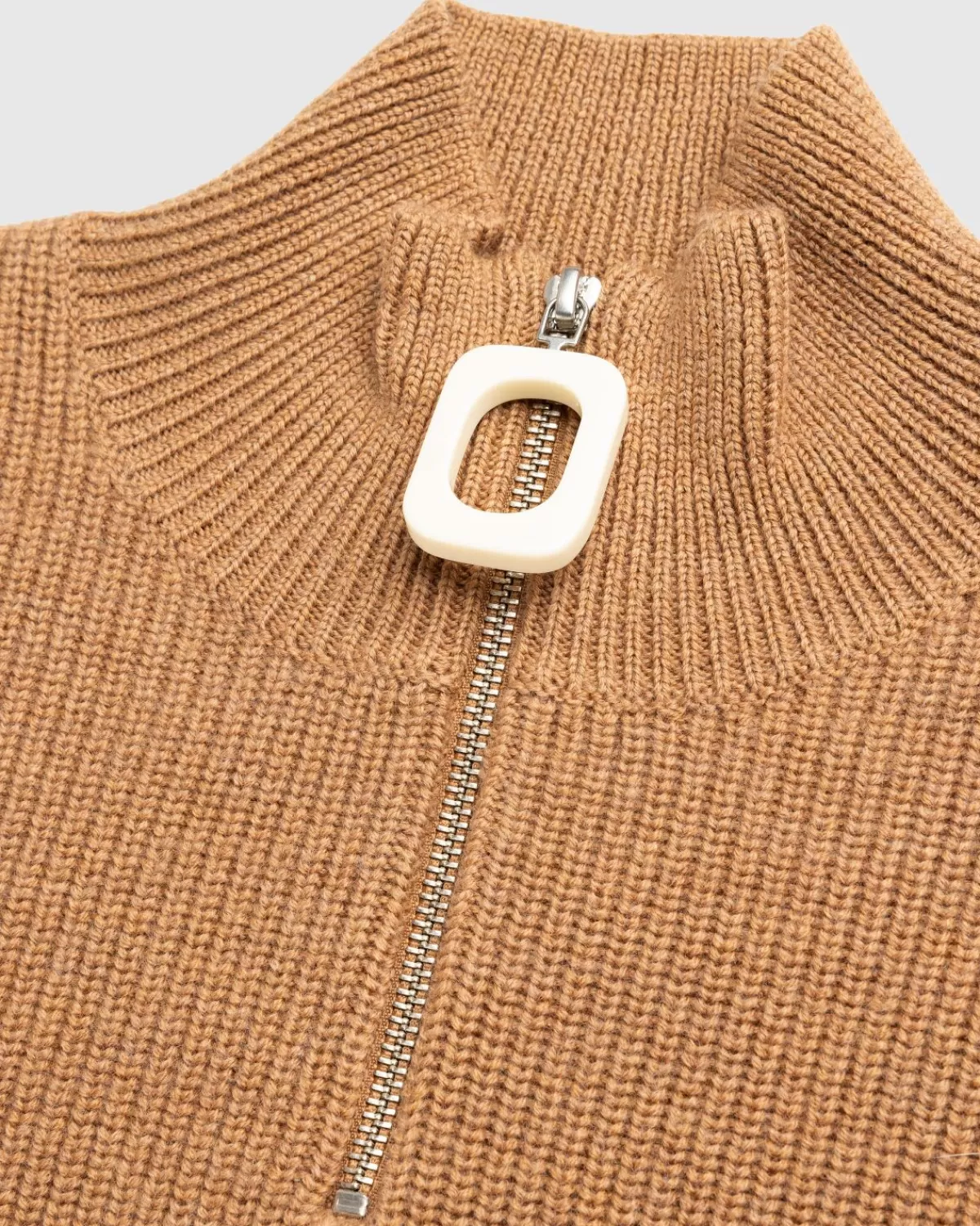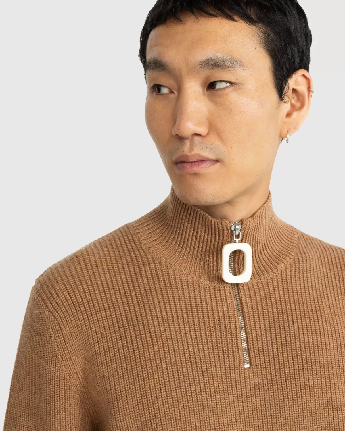 Jw Anderson Herinterpreteert Een Klassiek Silhouet Voor Zijn Nieuwste Seizoenscollectie. De Middelzware Trui Is Gemaakt Van Zachte En Soepele Merinowol En Heeft Een Hoge Hals Met Kwartritssluiting En Het Kenmerkende Oversized Treklipje Van Het Merk.