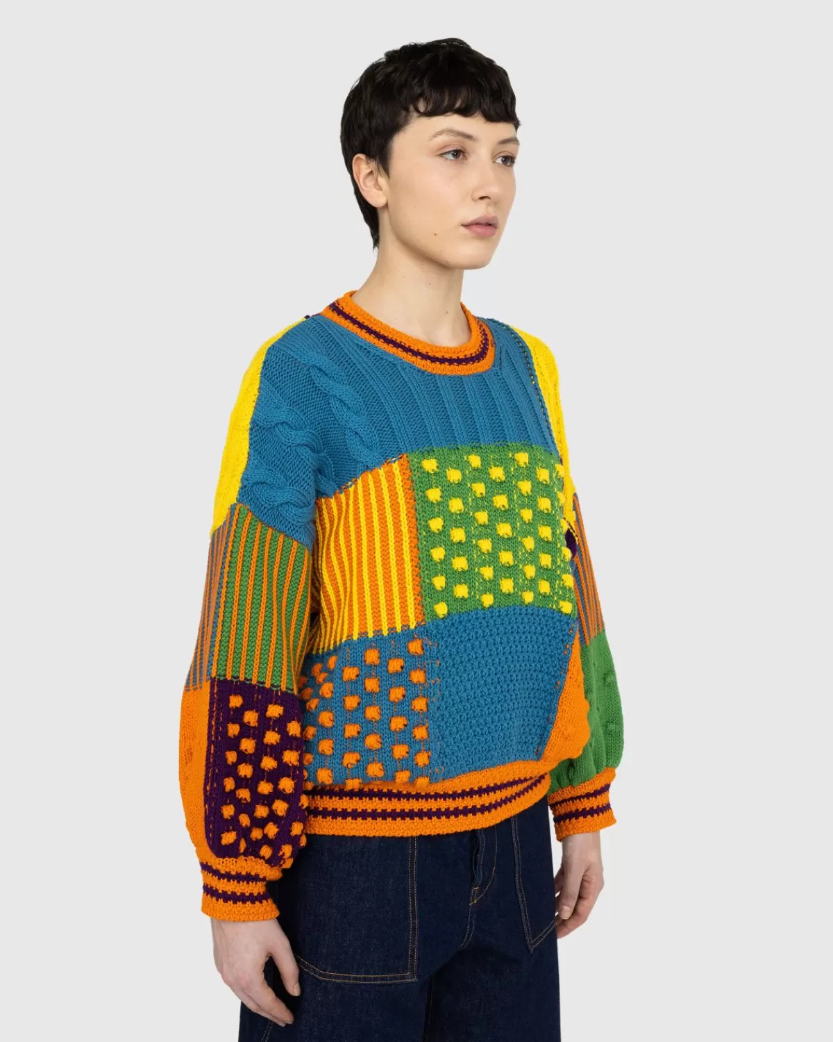 Deze Trui Heeft Een Kleurrijke Patchwork-Afwerking En Is Vervaardigd Met Verschillende Contrasterende Patronen En Texturen Die Allemaal Samenkomen Om Een Retro-Geïnspireerd Breiwerk Te Creëren. Het Heeft Een Oversized, Boxy-Pasvorm Met Verlaagde Schouders En Oranje Geribbelde Details Op De Manchetten En Halslijn. Deze Stijl Is Volledig Gemaakt Van Gots (Global Organic Textile Standard) Gecertificeerd Biologisch Katoen, Wat Betekent Dat Er Gebruik Is Gemaakt Van Milieubewuste Praktijken Zoals Waterbesparende Landbouwmethoden En Teelt In Een Omgeving Zonder Chemische Meststoffen.