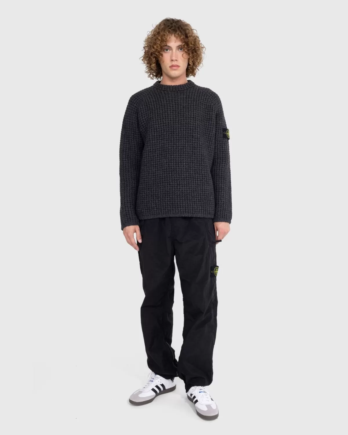 De Waffle Knit Sweater Van Stone Island Komt Dit Seizoen Uit In Een Melange Charcoal-Kleurstelling Die Moeiteloos Matchen Mogelijk Maakt. Het Kledingstuk Is Gemaakt Van 100% Scheerwol, Heeft Een Relaxte Pasvorm En Is Voorzien Van Het Iconische (Afneembare) Logobadge Van Het Merk Op De Linkermouw.