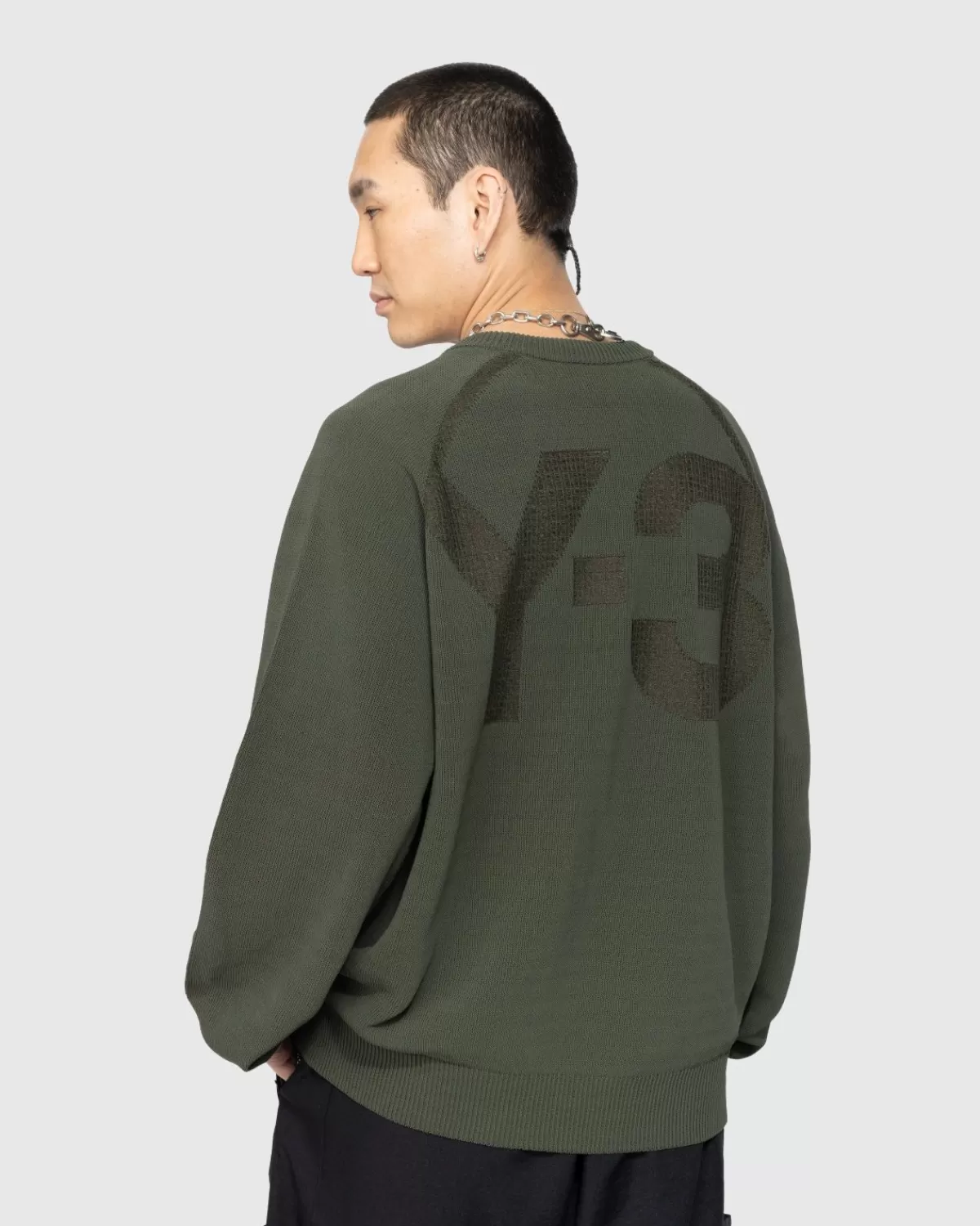 Deze Y-3 Trui Is Gebreid Van Een Zachte Katoen-Linnenmix En Heeft Een Comfortabele, Oversized Pasvorm. Het Wordt Geleverd In Een Donkergroene Kleur, Met Een Tonaal Intarsia-Logo Op De Achterkant. De Stijl Heeft Raglanmouwen En Ribgebreide Afwerkingen Bij De Ronde Hals, Manchetten En Zoom.