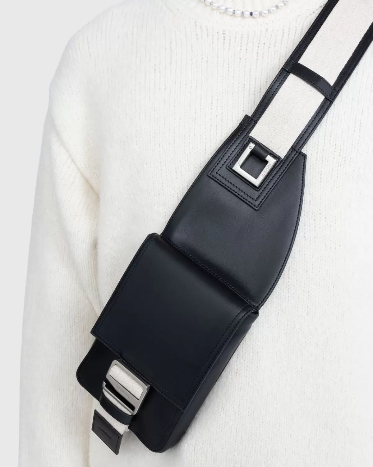 La Banane Cuerda Is Een Luxe Heuptasje Uitgevoerd In Glad Rundleer Met Volledige Katoenen Voering. Het Is Uitgerust Met Een Verstelbare Schouderband En Beschikt Over Een Magnetisch Klepvak Met Metalen Gesp, Een Zijvak Met Ritssluiting En Een Opgestikte Binnenzak. De Tas Wordt Geleverd Met Een Gegraveerde Vierkante Karabijnhaak En Is Verder Verfraaid Met Een Jacquemus-Logo In Reliëf.
