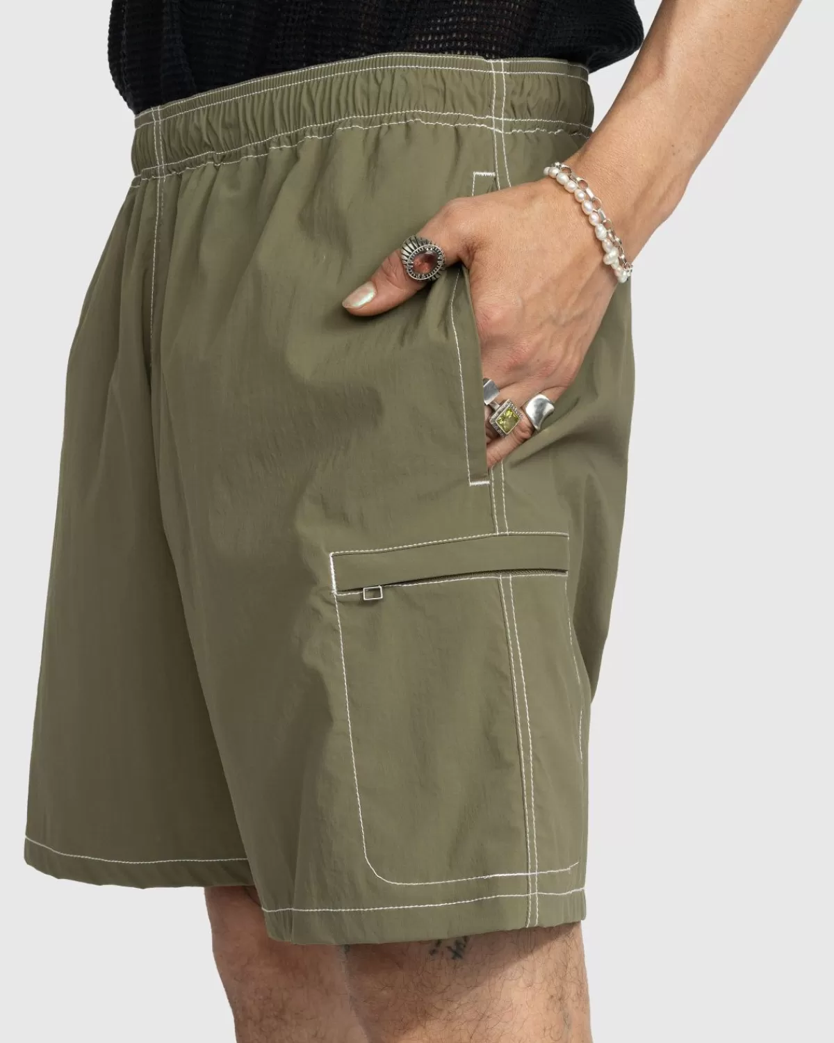 Deze Casual Halflange Short Is Gemaakt Van Een Lichte, Japanse Nylonstof Die Wordt Geaccentueerd Door Witte Contrasterende Stiksels. Op Het Linkerbeen Bevindt Zich Een Cargozak Met Ritssluiting, Terwijl Het Rechterbeen Een Achterzak Met Ritssluiting Heeft Met Highsnobiety-Vlaglabel, Die Beide Extra Draagruimte Bieden. Een Elastische Taille Met Intern Trekkoord Verbetert Het Algehele Comfort En Zorgt Ervoor Dat Je De Juiste Pasvorm Kunt Kiezen.