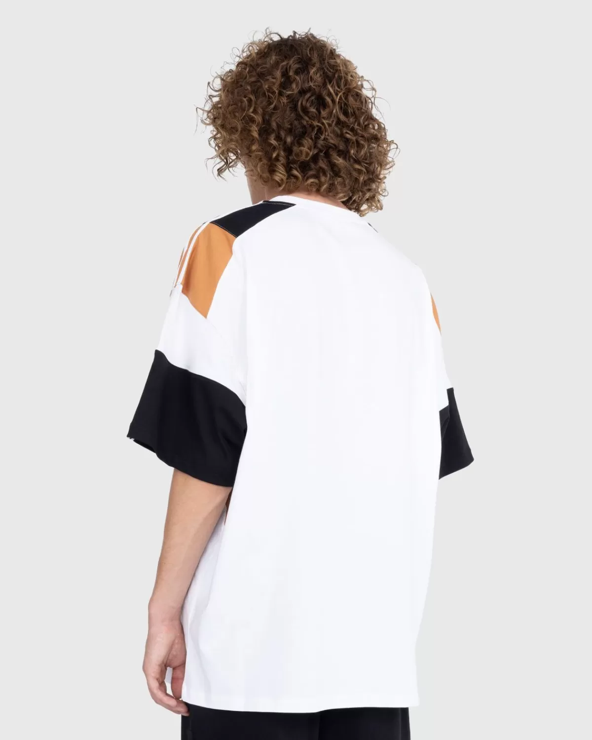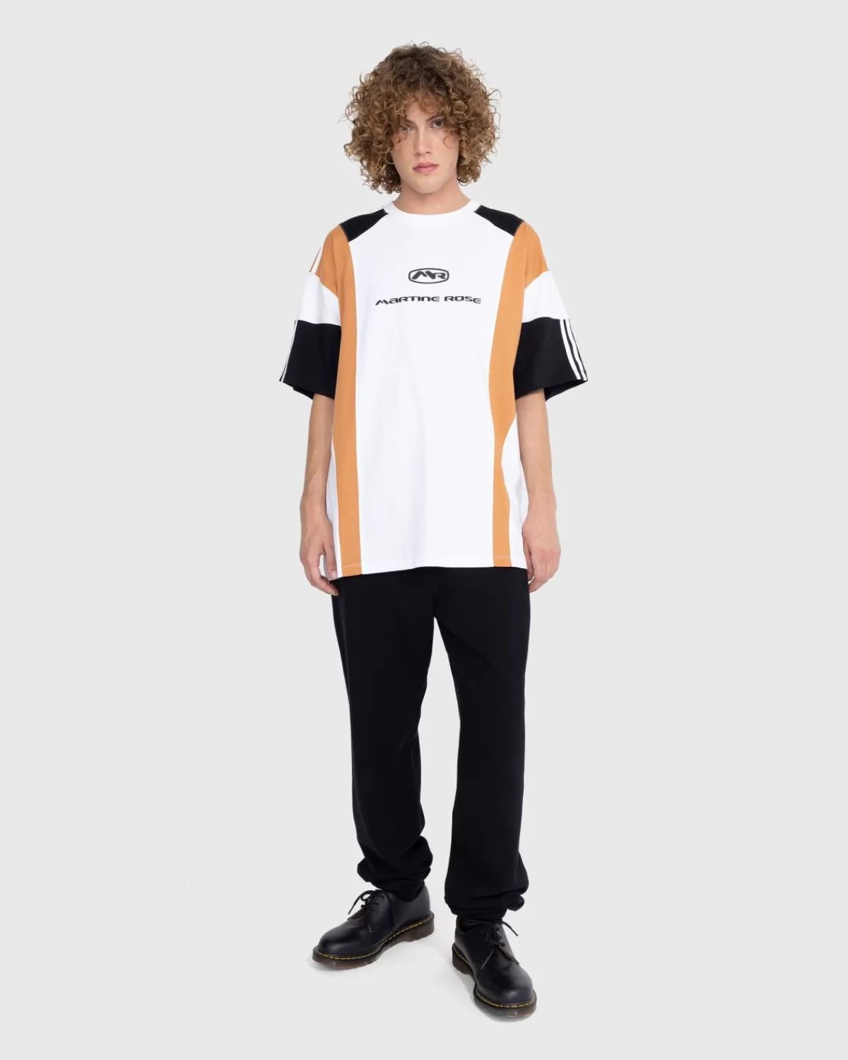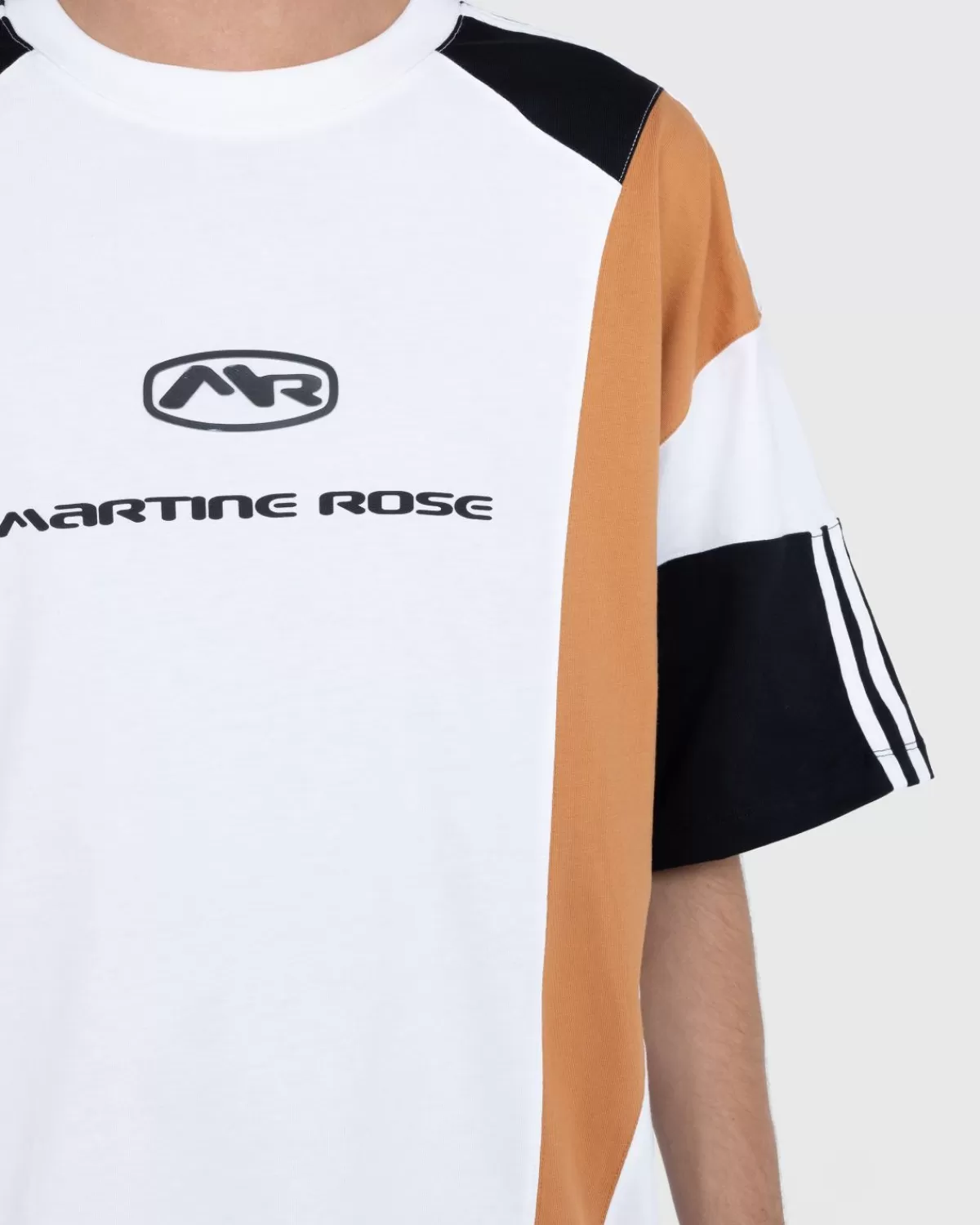 Dit Martine Rose T-Shirt Heeft Een Seizoensontwerp Met Contrasterende Zwarte En Terracotta Panelen En Gestreepte Details Op De Mouwen. Het Model Met Korte Mouwen Is Gesneden Voor Een Losse Of Oversized Pasvorm En Wordt Vervolgens Voorzien Van Een In Gelzeefdrukt Martine Rose-Logo, Verwerkt Op De Voorkant Van Het Silhouet.