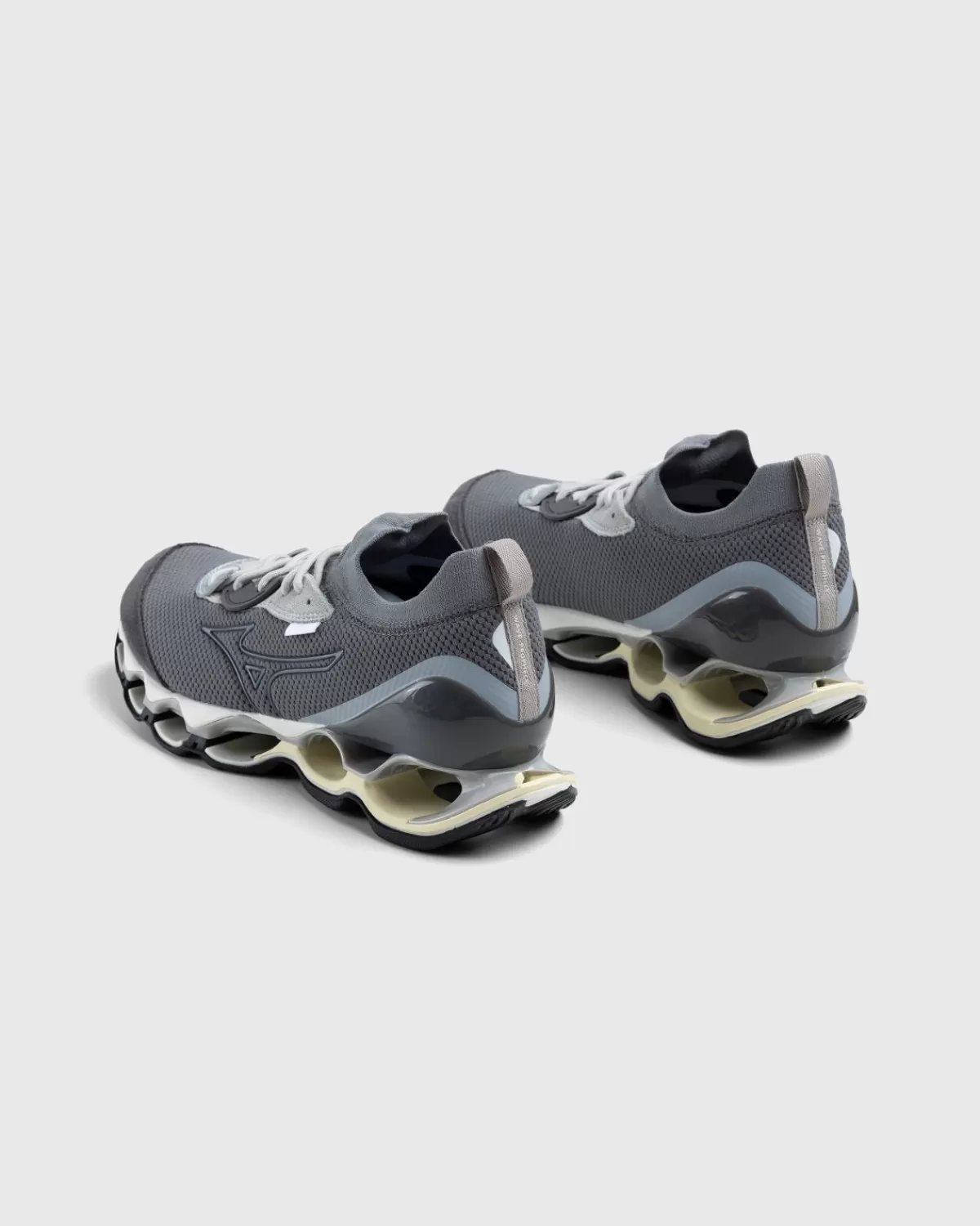 De Wave Prophecy Beta Heeft Dezelfde Opvallende Zool Als De Wave Sorayama En Is Een Eigentijds Silhouet Dat Sterk Leunt Op Een Futuristisch Ontwerp. Het Slanke Bovenwerk Van De Schoen Is Uitgevoerd In Een Lichtgewicht En Ademende Technische Mesh-Stof, Met Premium Leren Overlays Die Structuur Toevoegen En De Luxe Esthetiek Versterken. Hieronder Trekt De Tussenzool Met Dubbele Platen Het Grootste Deel Van De Aandacht Met Zijn Opvallende Golvende Ontwerp. Langs De Zijkant Is De Vetersneaker Verfraaid Met Een Mizuno-Logoapplicatie Om De Look Compleet Te Maken.