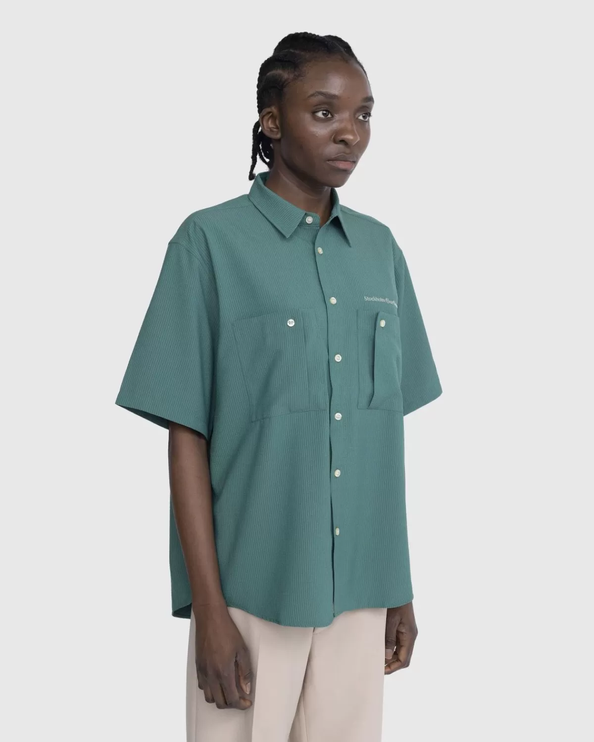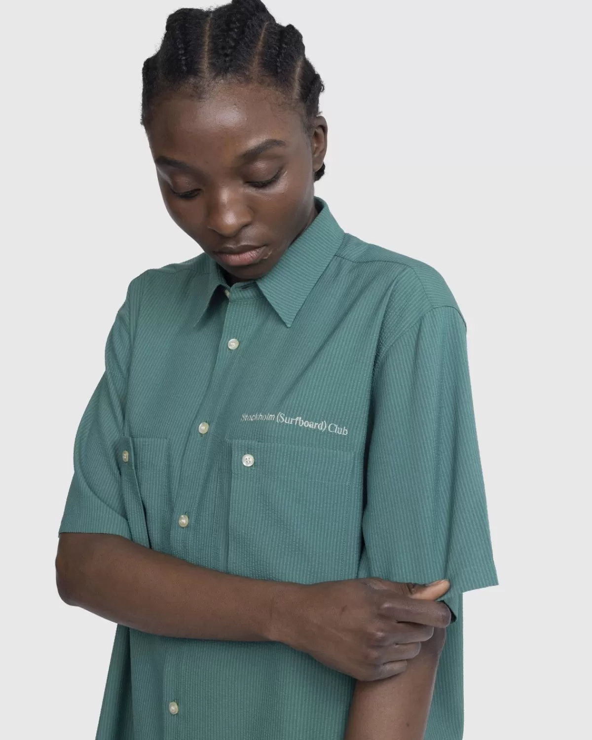 Stockholm Surfboard Club Vernieuwt Seersucker-Stijlen Voor Het Warme Weerseizoen, Met Stukken Zoals Deze Knoopsluiting Met Korte Mouwen. Het Kledingstuk Is Gemaakt Van Polyester En Heeft Een Subtiel Gestreept Patroon En Twee Zakken Met Knopen Op De Borst. Op De Voorkant Is Een Geborduurd Logo Verwerkt Om Het Silhouet Minimaal Te Benadrukken.
