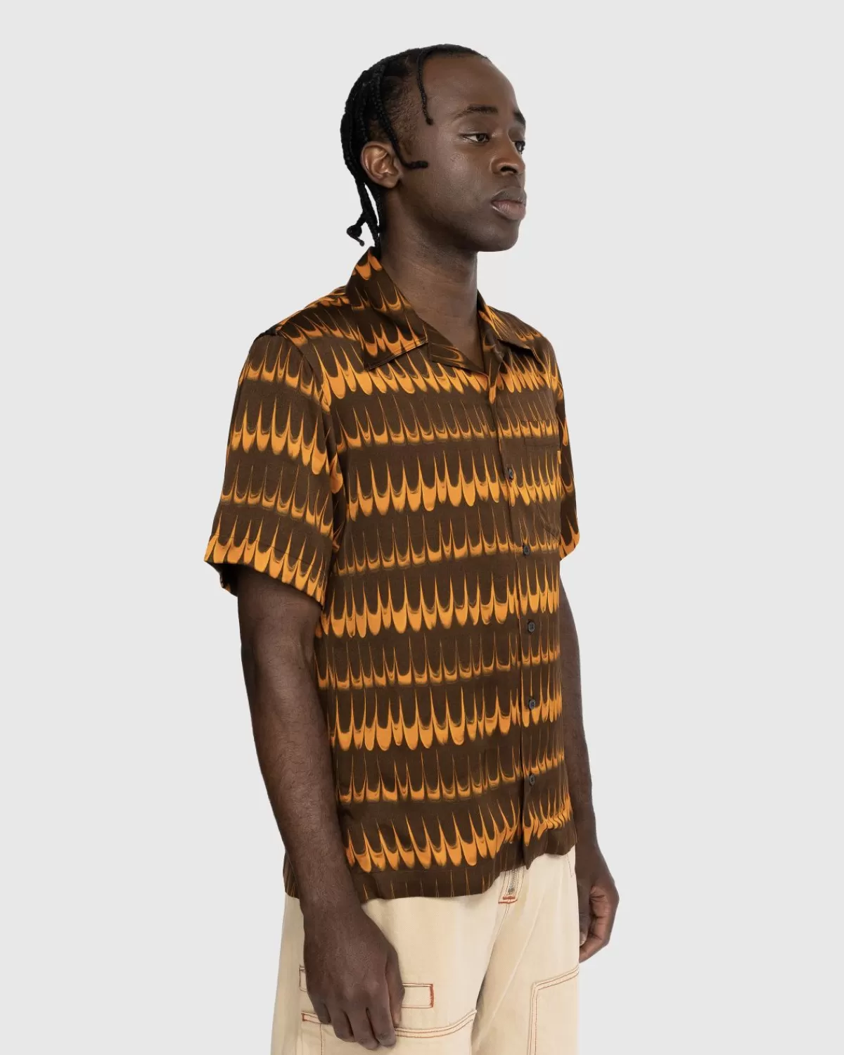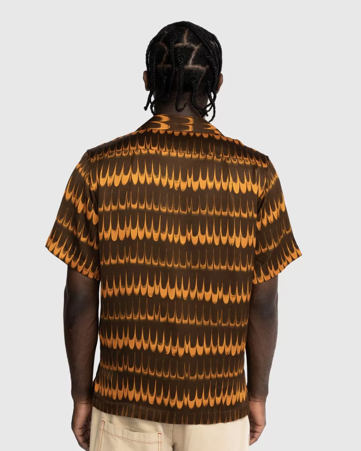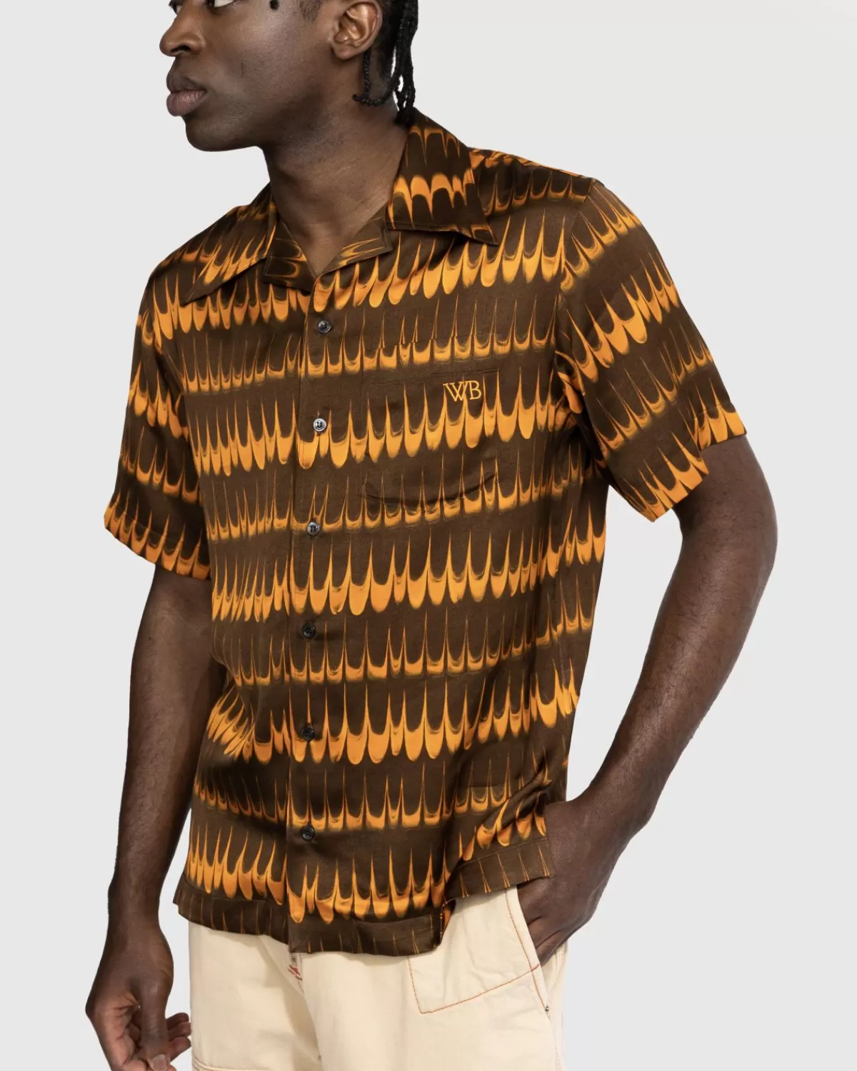 Het Rhythm Shirt Grijpt Terug Naar Tientallen Jaren Geleden Met Een Leuk All-Over Patroon. Het Button-Down-Shirt Met Korte Mouwen Is Gemaakt Voor Een Losse Pasvorm En Is Gemaakt Van Lichtgewicht Viscose-Satijn. Het Heeft Een Gespreide Kraag En Een Enkele Borstzak Met Een Geborduurd Wales Bonner-Logo.