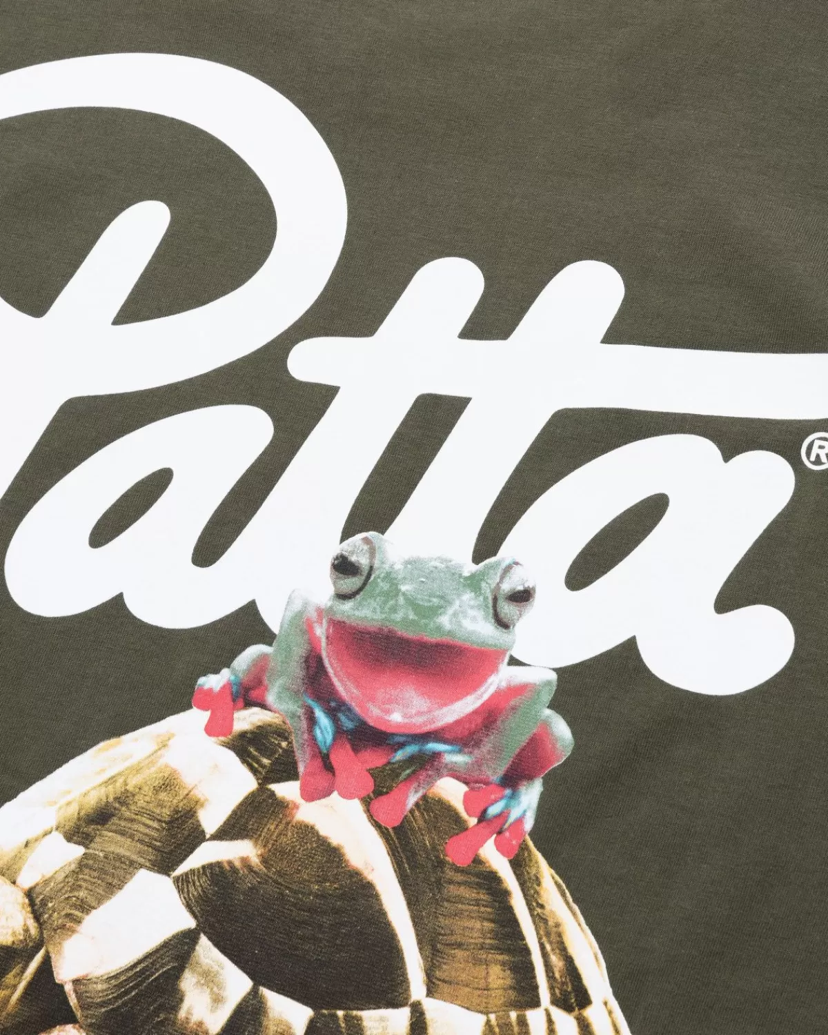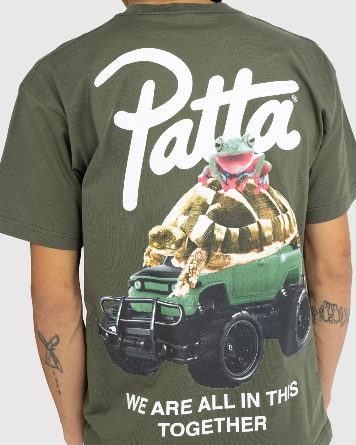 Patta’S Animal T-Shirt Herhaalt De Kernwaarden Van Het Merk: Gemeenschap En Is Gemaakt Van 230 Gsm Katoen. Op Het Zware T-Shirt Zijn Een Paar Vrolijke Dieren Afgebeeld Die Bovenop Een Terreinwagen Zitten, Bedrukt Op De Achterkant Met Het Kenmerkende Scriptlogo Van Het Merk Op De Borst.