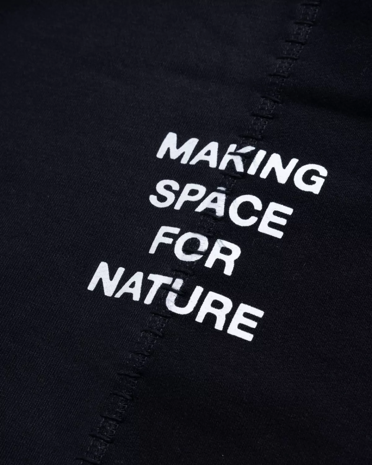 De Artisan Nature Hoodie Van Space Available Is Gemaakt Van Upcycled Katoen Afkomstig Van Kledingfabrieken, Met Plantaardig Geverfde, Met De Hand Gestikte Naden. Het Is Versierd Met Berichten Over Het Maken Van Ruimte Voor De Natuur, Terwijl Het Tegelijkertijd Traditionele Hoodie-Ontwerpelementen Bevat, Waaronder Een Vaste Capuchon, Ribgebreide Randen En Een Kangoeroezak. Het Swinglabel Van Het Kledingstuk Is Gemaakt Van Gerecycled Plastic En Kan Worden Hergebruikt Als Onderzetter Of Als Decoratief Bureauobject.