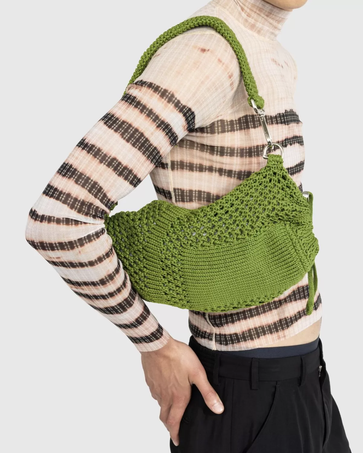 De 24H Hobo Sack Is Gemaakt Van Met De Hand Gehaakt Egyptisch Katoen In Italië En Bevat Praktische Details Zoals Een Metalen Koordsluiting, Een Ingebouwd Vak Met Ritssluiting En Een Metalen Karabijnhaak Aan De Sleutelhanger Die Aan De Riem Is Bevestigd. Het Italiaanse Label Ssu Maakt Gebruik Van Technische Uitrusting En Uniformen En Herschept Praktische Vormen Van Handgemaakte Breisels En Haakwerk. Door Een Nieuwe Context Te Geven Aan Traditionele Breitechnieken, Is Het Gespecialiseerd In Tassen En Accessoires Zoals Deze Gebreide Zak.