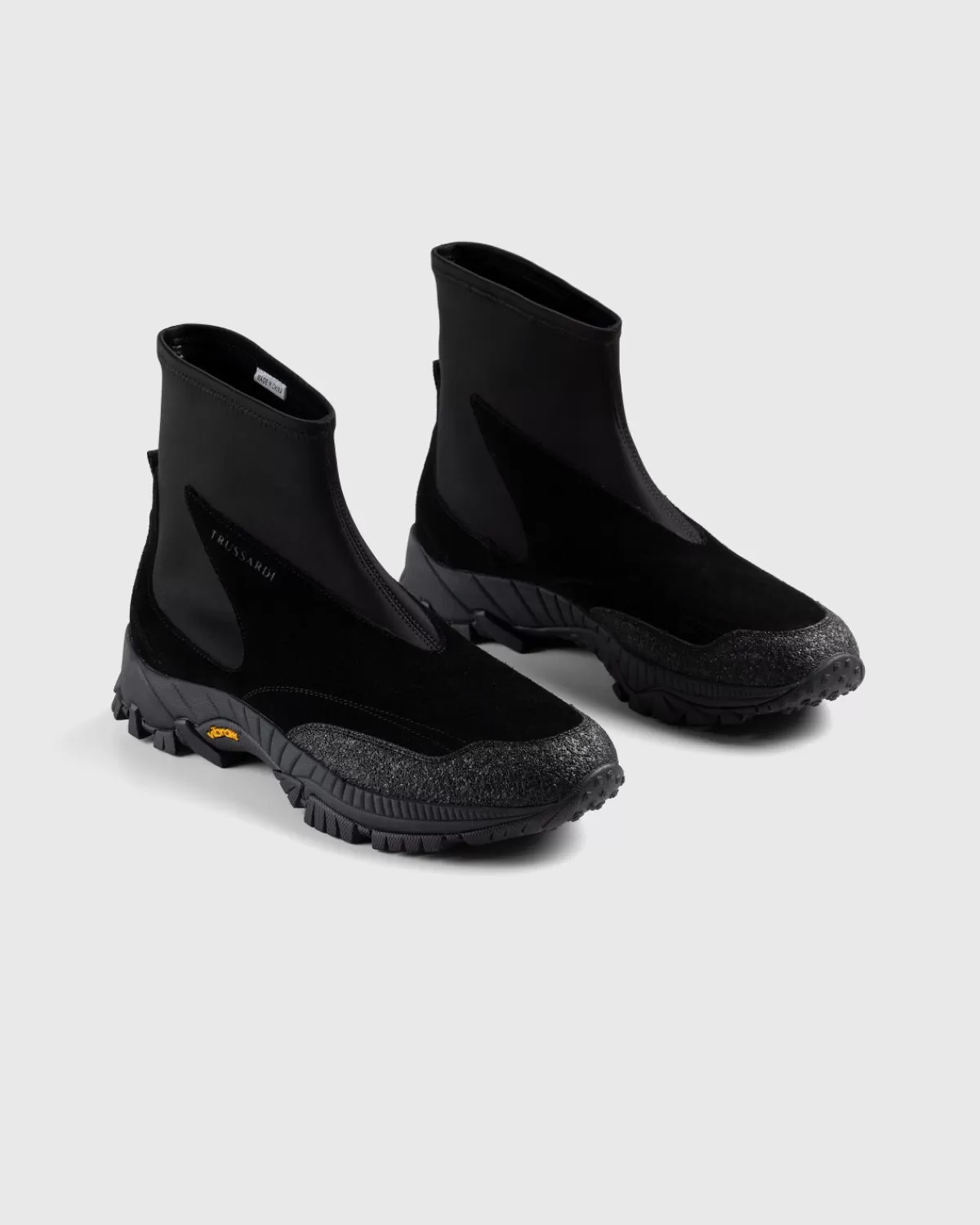 De Neo Sneaker Heeft Een Futuristisch Trussardi-Ontwerp En Biedt Een Comfortabele, Sokachtige Pasvorm. De Sneaker Komt Uit In Een Onopvallende Zwarte Kleurstelling En Is Voornamelijk Uitgevoerd In Polyester Over Het Bovenwerk, Met Gladde Suède Overlays. Hieronder Vind Je Een Dikke Vibram-Zool Die Zorgt Voor Optimale Grip Op Diverse Ondergronden, Doordat Het Model Is Afgewerkt Met Contrasterende Trussardi-Logoletters Op De Zijkant.