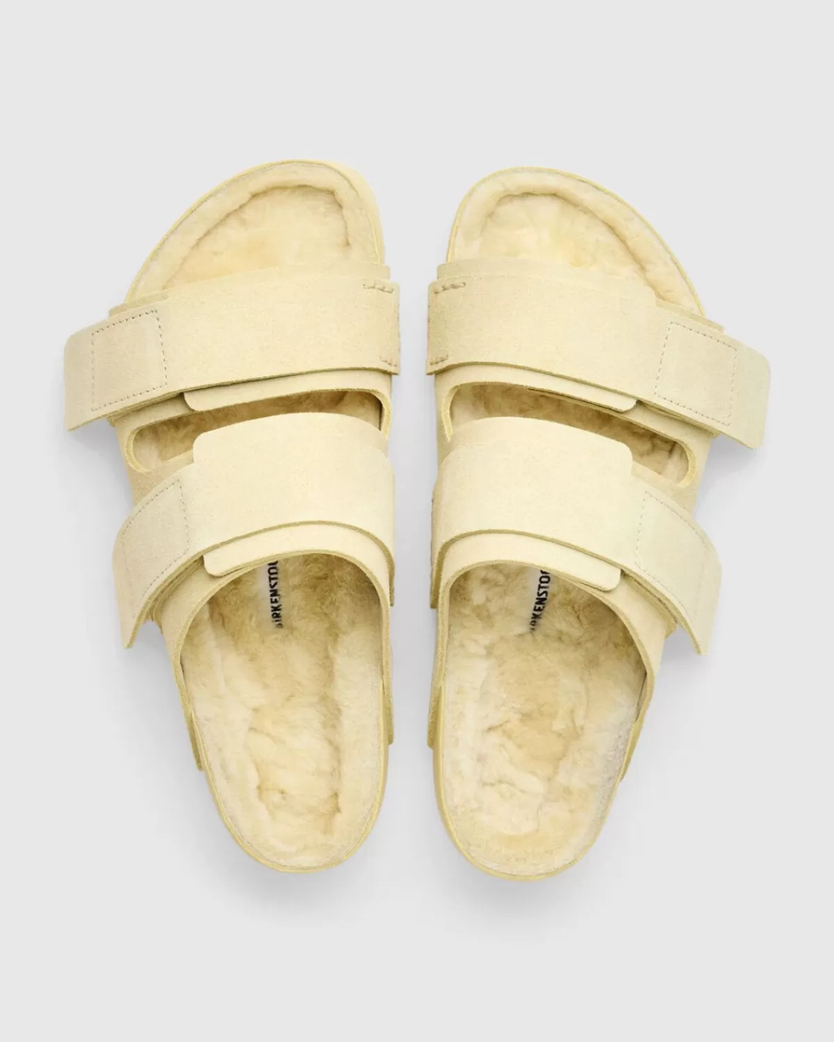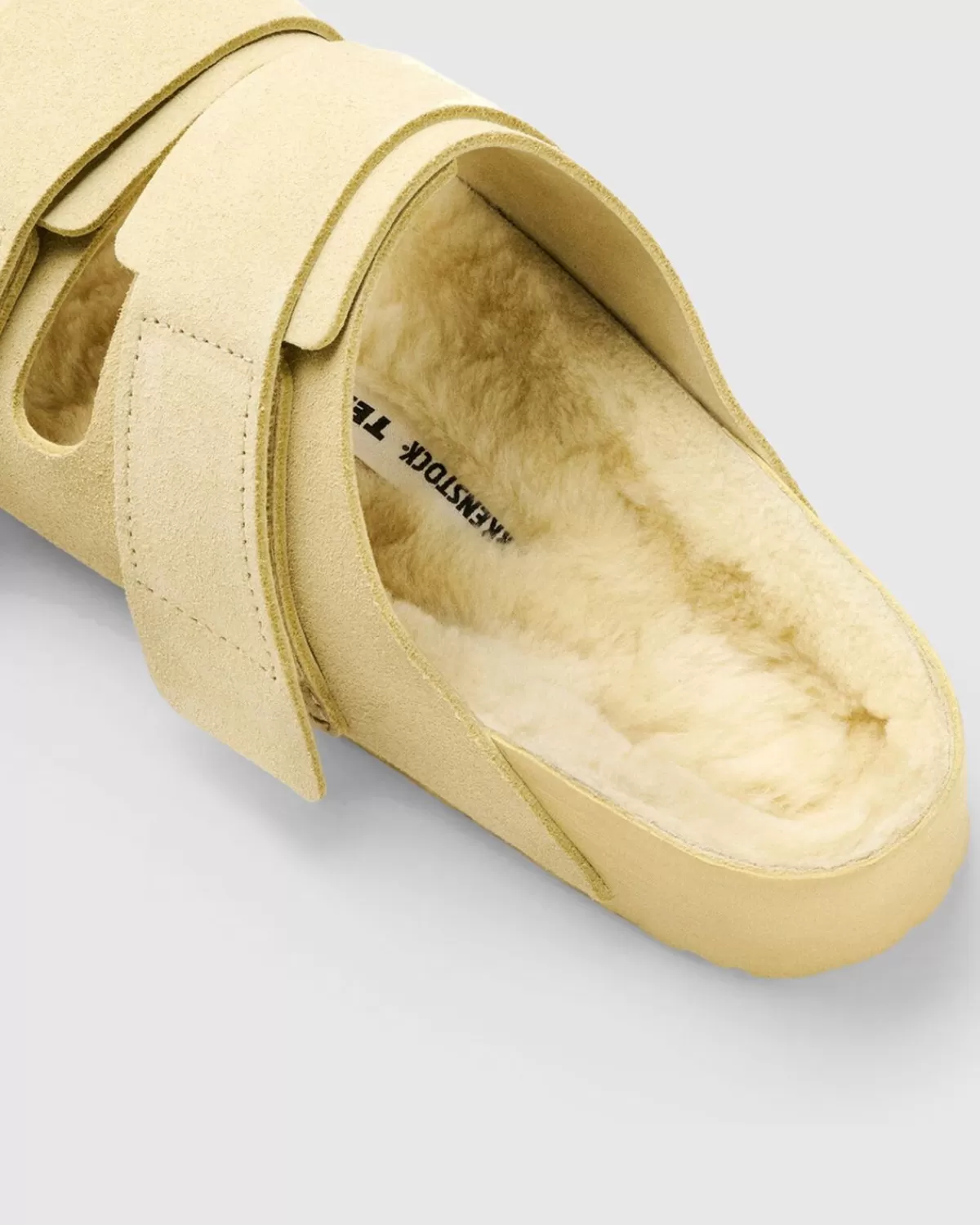 Voor Hun Eerste Samenwerking Werken Birkenstock En Tekla Samen Voor Een Collectie Bestaande Uit Klassieke Silhouetten In Subtiele En Verzadigde Kleurstellingen. De Legendarische Uji Met Open Neus Krijgt Een Knusse Update, Gedetailleerd Met Een Voering Van Schapenvacht Over Het Kurken Voetbed En Een Gladde Nappaleren Hielafdekking. Cazador-Suède Bedekt De Buitenkant In Een Neutrale, Lichtgele Tint, Terwijl Tonale, Met De Hand Gestikte Details De Look Compleet Maken.