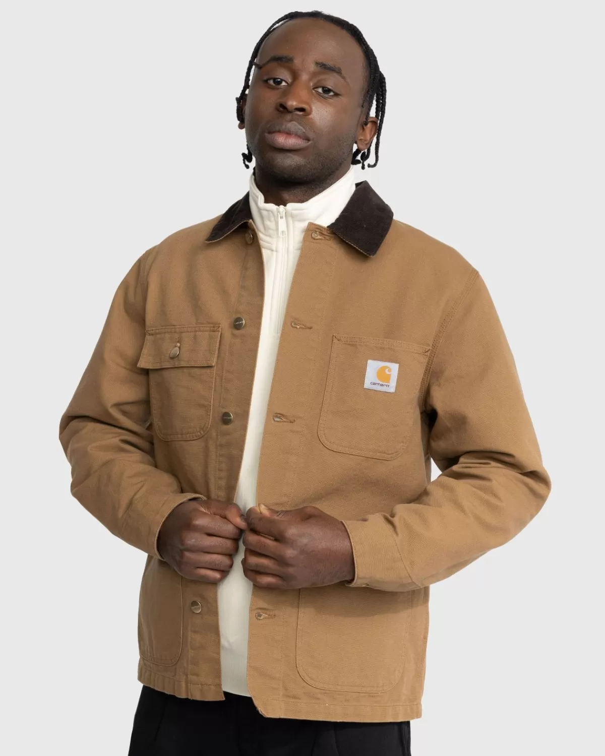 De Michigan Is Een Klassiek Karweijassilhouet En Is Gemaakt Van Carhartt’S 12Oz Biologisch Katoenen Dearborn-Canvas. Het Kledingstuk Is Ongevoerd, Waardoor Het Iets Lichter En Ademender Is. Het Heeft Een Kraag Van Corduroy, Een Gepersonaliseerde Knoopsluiting, Verstelbare Manchetten Met Knopen En Opgestikte Zakken Aan De Voorkant Voor Een Tastbare Touch. Een Geweven Vierkant Logolabel Is Op De Voorkant Verwerkt Om Het Ontwerp Compleet Te Maken.
