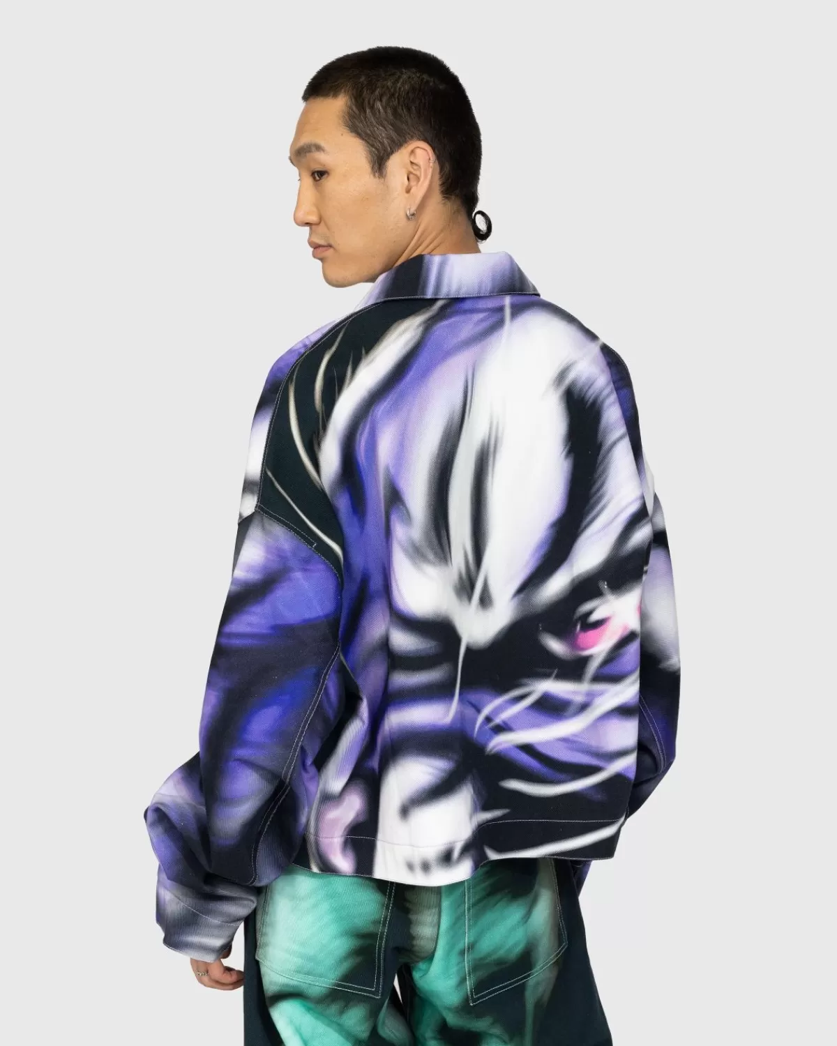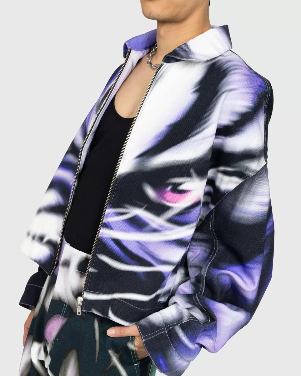 Met Een Smaakvol Oog Voor Unieke Graphics En Esthetiek Is De Gelijknamige Lijn Van Gerrit Jacob Snel Gestegen Onder De Bloeiende Ontwerpers Van Deze Generatie. Het Merk Biedt Verschillende Silhouetten Uit Zijn Confectiecollecties, Maakt Gebruik Van Beelden En Motieven Uit Het Duitse Erfgoed Van De Ontwerper En Herschept Deze In Levendige Collecties Die Kitsch Combineren Met Hedendaagse Luxe. Het Bedrukte Spijkerjack, Een Essentieel Onderdeel Uit De Tweede Collectie Van Het Merk, Is Hier Te Zien In Een Reeks Paarse, Zwarte En Witte Tinten Met Een Metgezel Met Bakkebaarden, Klaar Voor Actie.