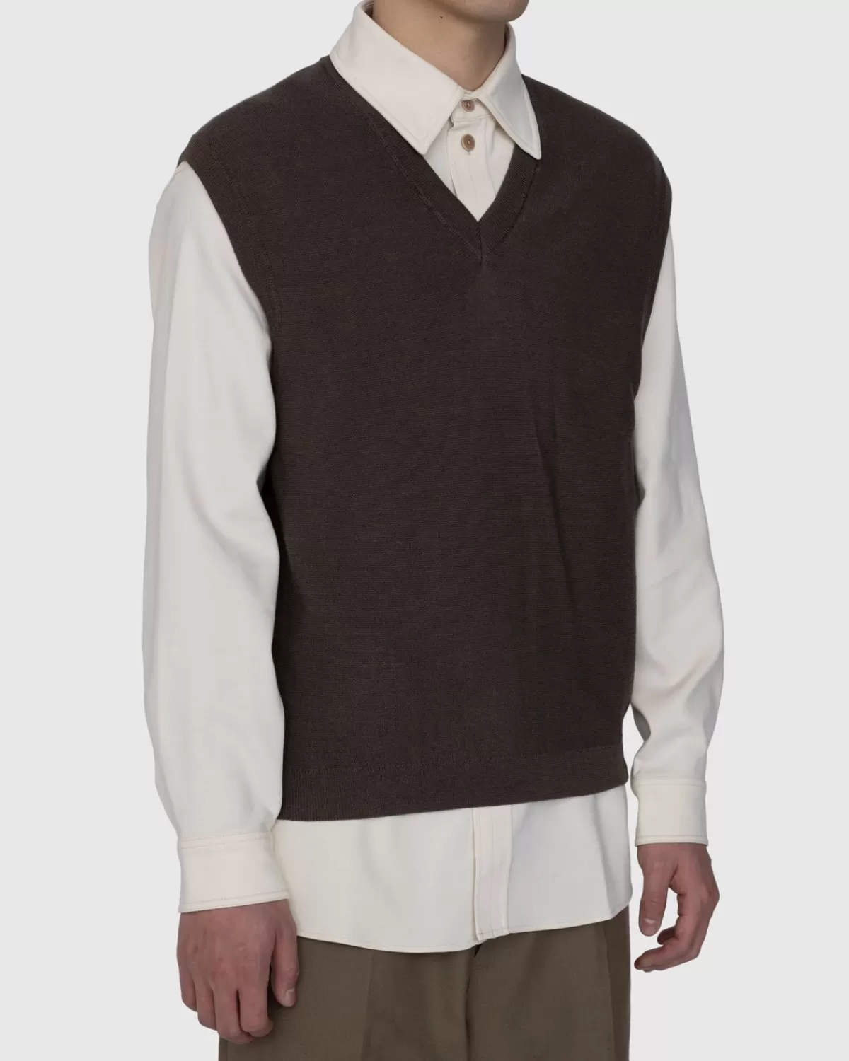 Het Sweatervest Is Op Grote Schaal Terug. Vraag Het Maar Aan Lemaire, Die Met Een Nieuw Tijdloos Ontwerp Komt Als Onderdeel Van De Nieuwste Seizoenscollectie. Het Vest Met V-Hals Is In Portugal Gebreid Van Een Zachte Merinomix En Heeft Een Licht Gemêleerde Uitstraling Met Geribde Details.