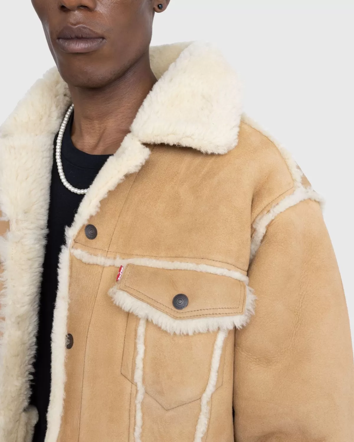 Het Shearling Trucker Jacket Is Een Eigentijdse Update Van Een Klassieke Amerikaanse Bovenkledingstijl En Is Gemaakt Van Premium Schapenleer Met Een Voering Van Schapenvacht. Het Beschikt Over Een Traditionele Kraag, Knoopsluiting Aan De Voorkant En Knoopmanchetten En Zoom. Op De Borst En Zijkanten Zijn Zakken Verwerkt En Op De Linkerborstzak Is Een Klein Logolabel Bevestigd Om Het Kledingstuk Subtiel Te Markeren.