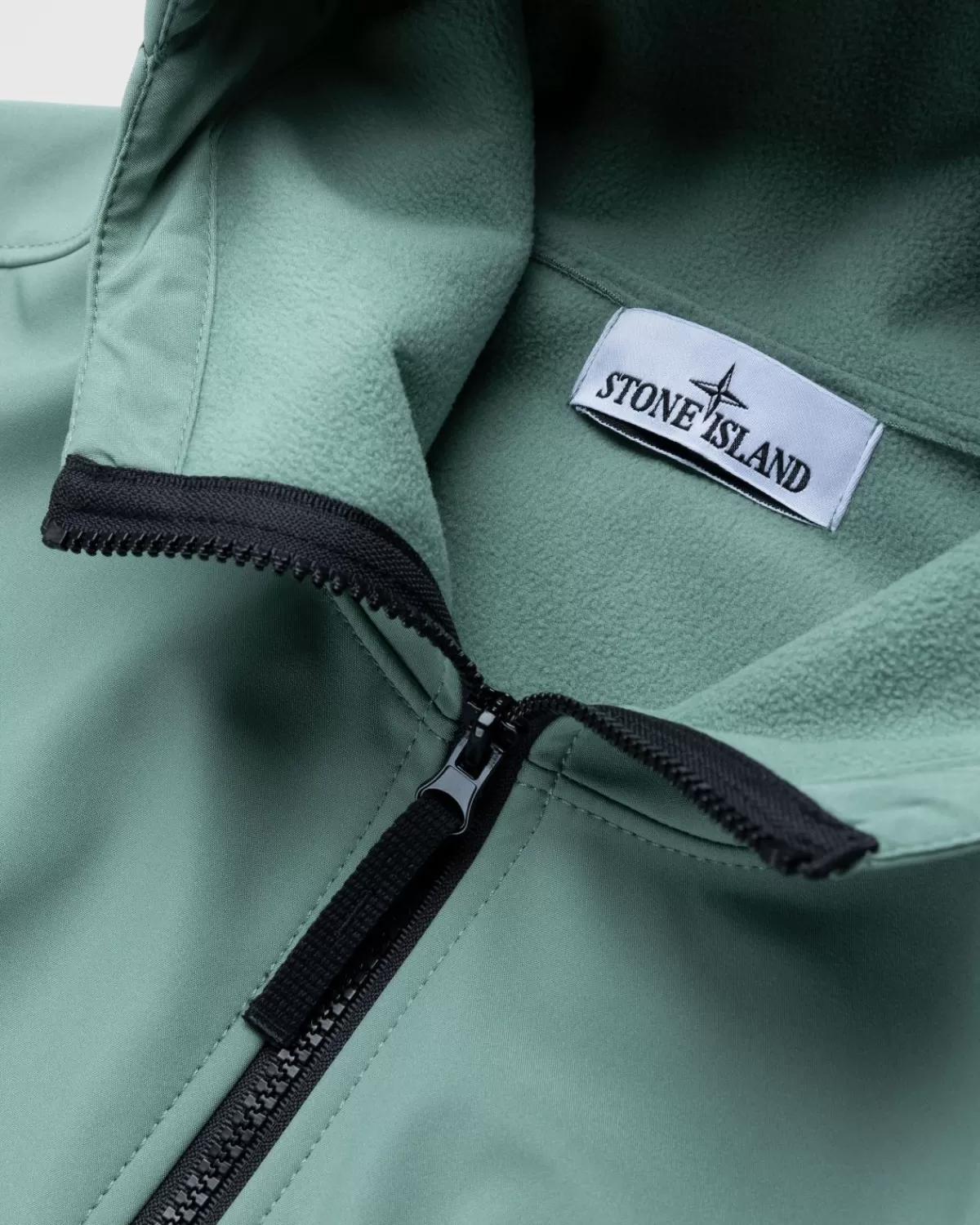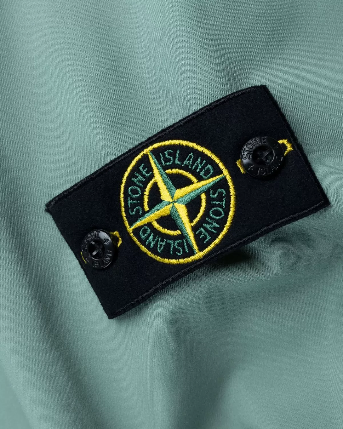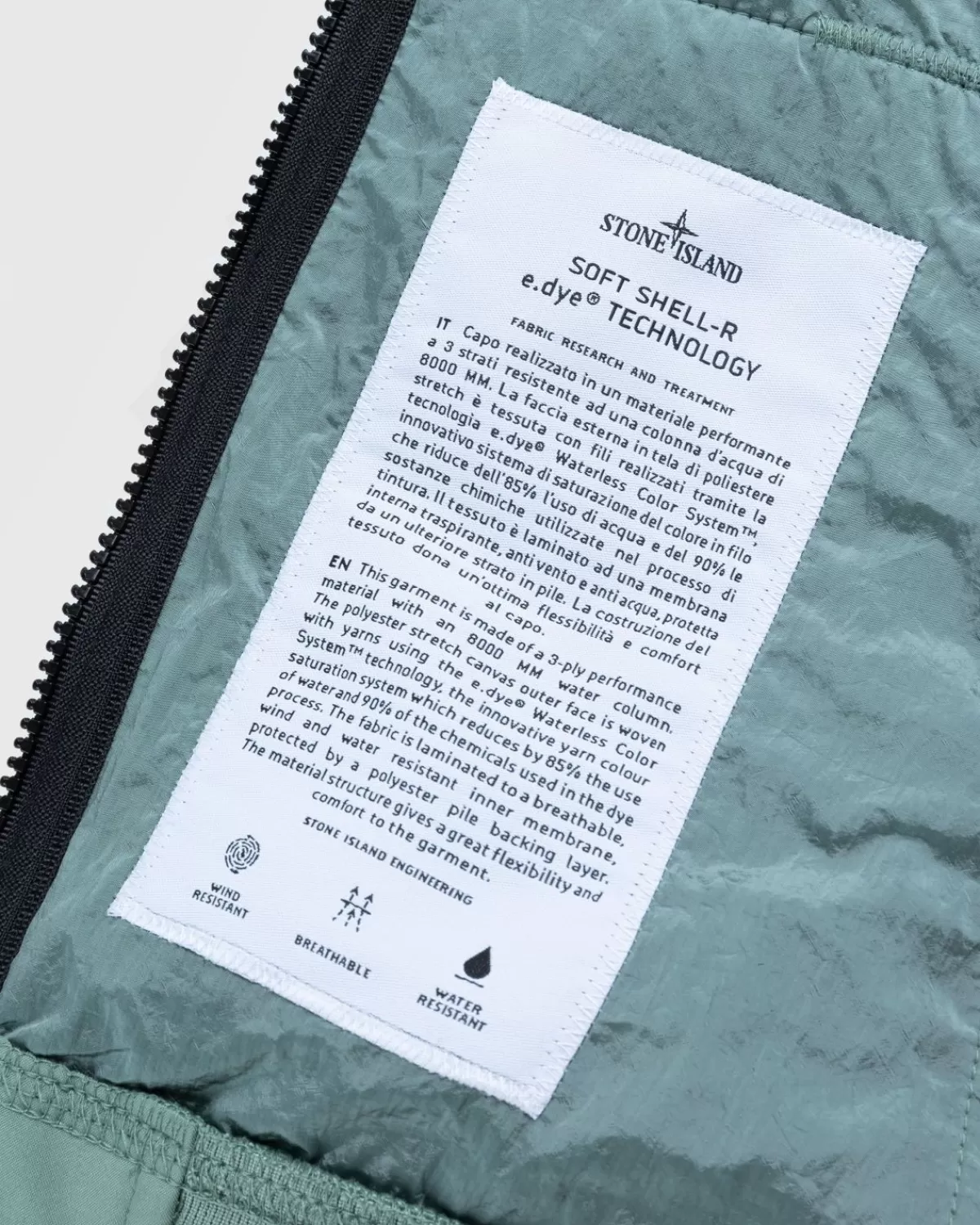 Het Soft Shell Jack Met Capuchon Is Een Lichtgewicht Bovenkledingstijl, Uitgevoerd In Drielaags Prestatiemateriaal Met Een Waterkolom Van 8000 Mm. De Buitenkant Van Polyester Stretchcanvas Van Het Kledingstuk Is Geweven Met Garens Met Behulp Van E.Dye Waterless Colour System-Technologie, Een Innovatief Garenkleurverzadigingssysteem, Om Het Die Kenmerkende Stone Island-Afwerking Te Geven. De Stof Wordt Vervolgens Gelamineerd Op Een Ademend, Water- En Winddicht Binnenmembraan, Omdat De Binnenmateriaalstructuur Zorgt Voor Meer Flexibiliteit En Comfort.