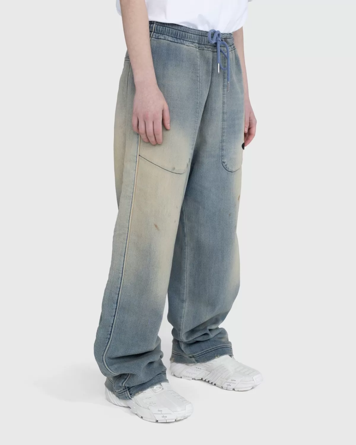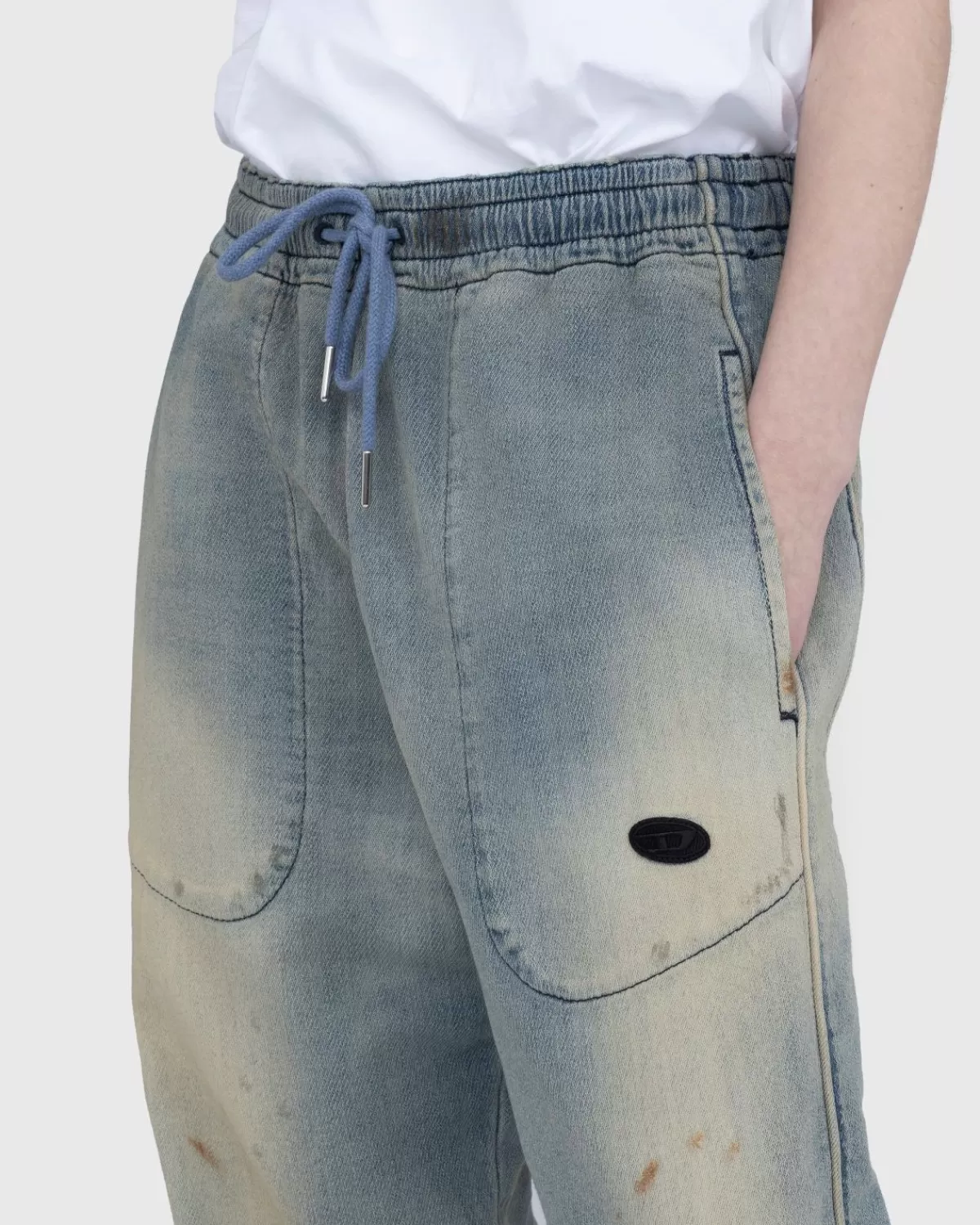 De D-Martians Is Deels Een Trainingsbroek, Deels Denim, En Is Een Unisex-Stijl Met Een Lichtblauwe Wassing, Medium Behandeld Voor Een Authentieke Vintage Look. Het Silhouet Is Los Gesneden Met Rechte Pijpen, Voorzien Van Een Elastische Taille En Een Verstelbaar Trekkoord Voor Optimaal Comfort. Aan De Voorkant Van Het Paar Zijn Grote Zakken Geïmplementeerd, Met Aan De Achterkant Een Enkele Paspelzak. Het Ovale D-Logo Van Het Merk Is Op De Voorkant Aangebracht Om Het Ontwerp Subtiel Te Markeren.