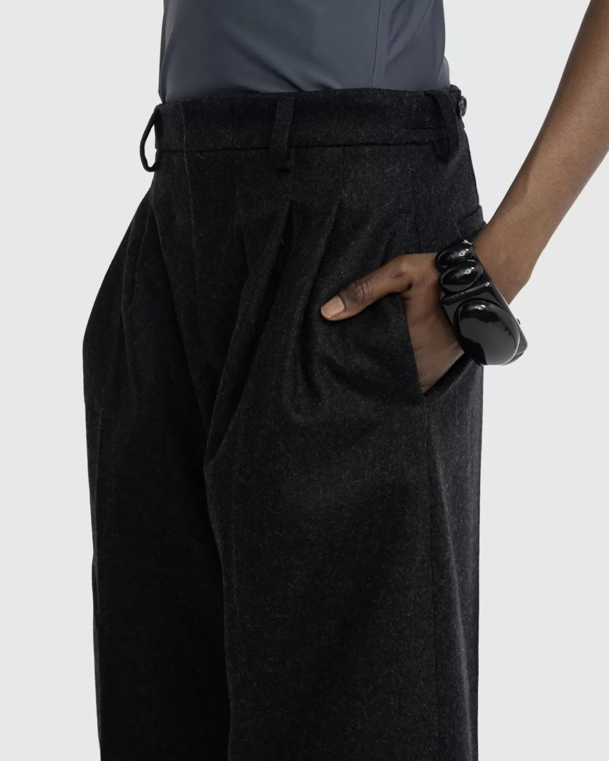 De Felted Wool Suit Pants Is Opgenomen In De Retro-Futuristische Cyber-Collectie Van Jean Paul Gaultier, Die Bestaat Uit Polariserende Confectiestijlen Die Verwijzen Naar De Iconische Archieven Uit De Jaren 90 Van Het Huis. Zoals De Naam Al Doet Vermoeden, Is Het Paar Voornamelijk Gemaakt Van Wol, Met Een Wijde Snit En Een Lage Taille. De Donkergrijze Stijl Is Gemaakt Met Plooien Aan De Voorkant, Riemlussen, Zijverstellers En Een Klassiek Ontwerp Met Vier Zakken.