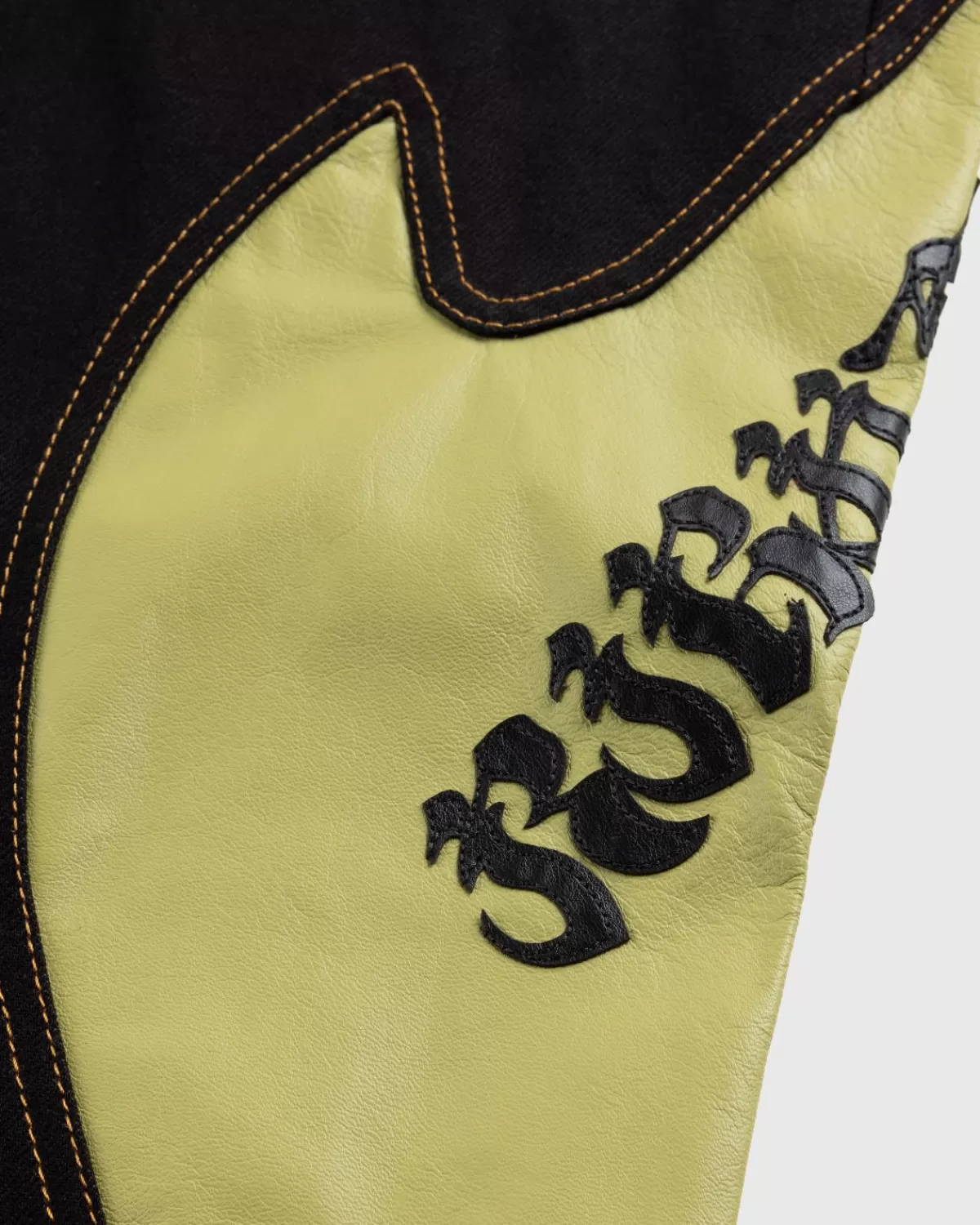 De Rider Pant Is Een Kenmerkende Kusikohc-Stijl. Dit Specifieke Paar Wordt Geleverd In Een Overwegend Zwarte Kleurstelling, Gemaakt Van Katoen Met Olijfkleurige Leren Inzetstukken. De Broek Heeft Een Middelhoge Pasvorm Met Rechte Pijpen En Is Gemaakt In Een Traditionele Five-Pocket-Stijl. Extra Details Zijn Onder Meer Een Knoopsluiting, Een Ritssluiting En Riemlussen In De Taille. Het Paar Is Afgewerkt Met Contrasterend Borduursel Op De Pijp.