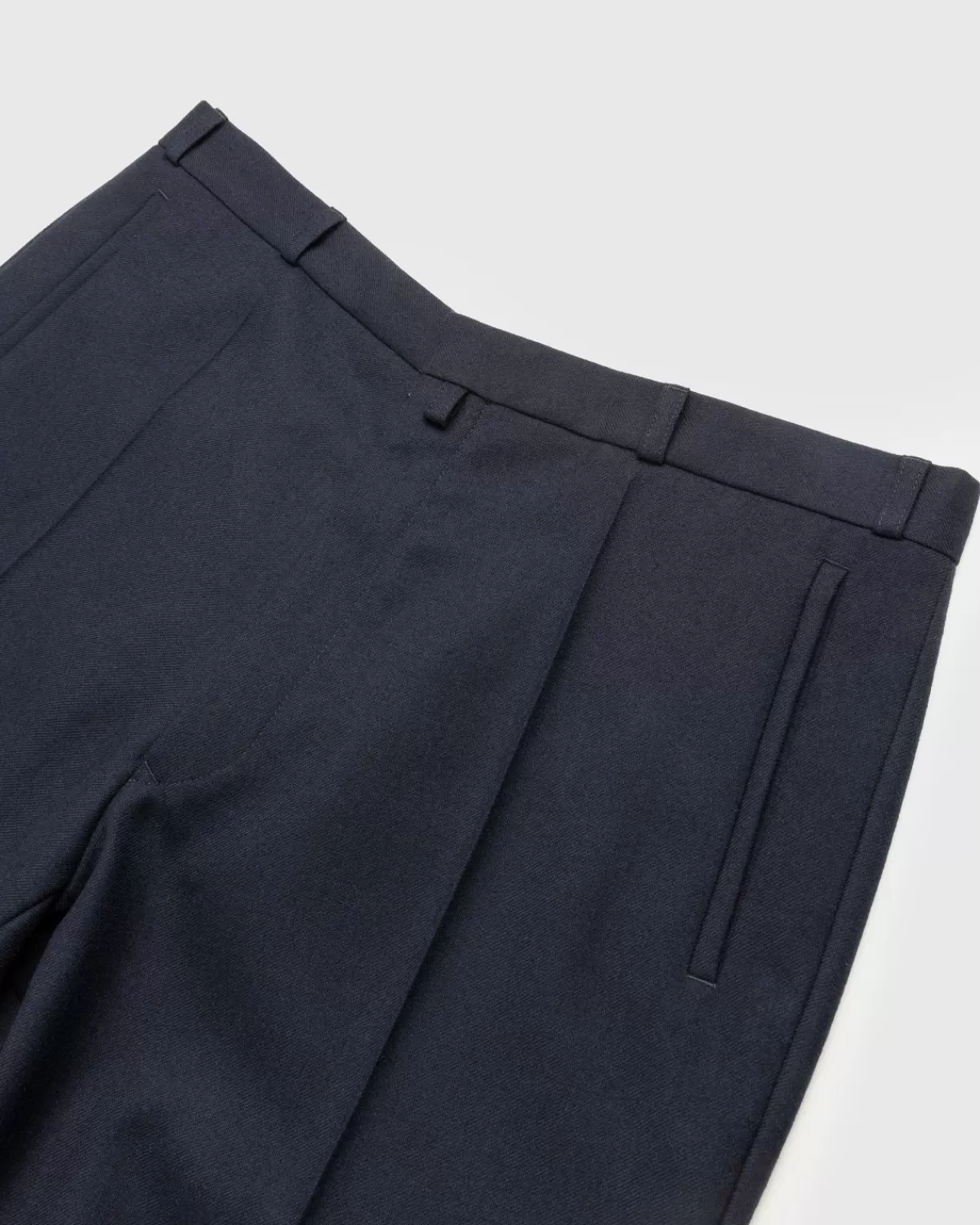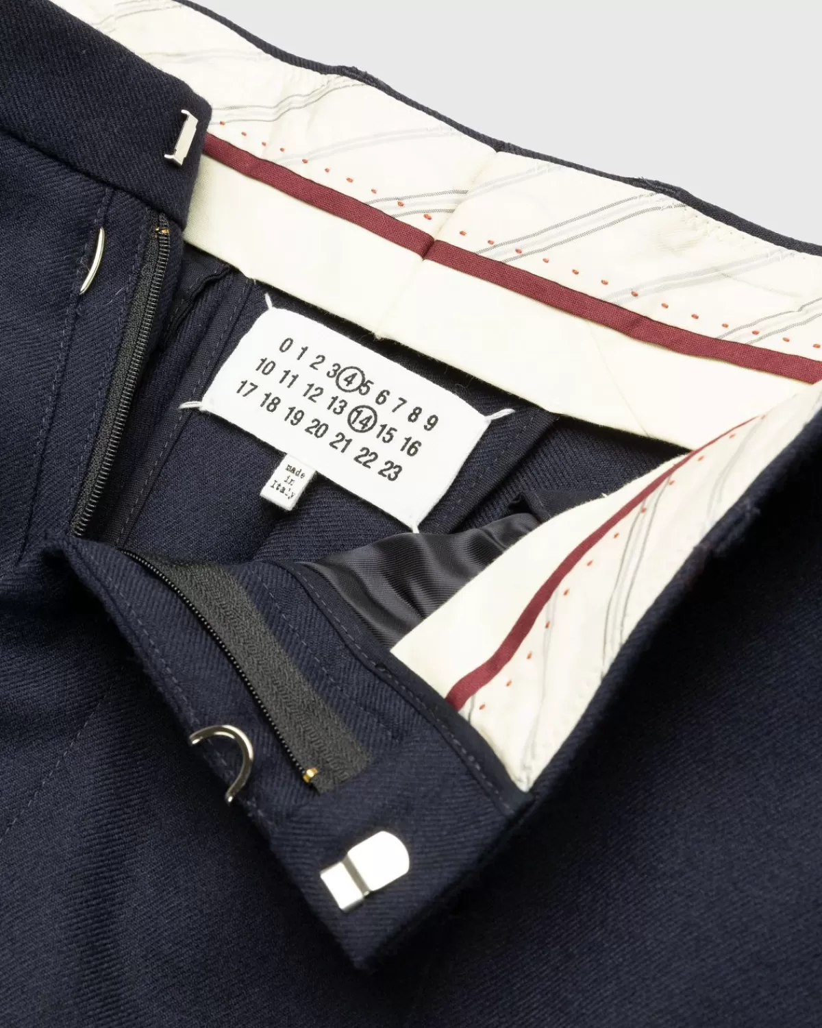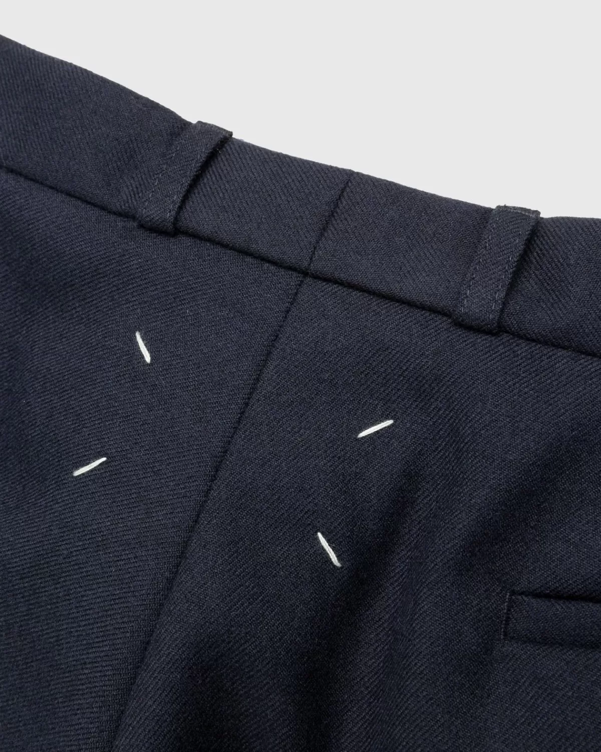 Een Goede Marineblauwe Broek Is Een Veelzijdige Musthave Voor Elke Garderobe. Deze Geplooide Stijl Van Maison Margiela Is Gemaakt Van Wollen Twill, Met Omgeslagen Zomen En De Haak- En Oogsluiting Van Het Huis. Dankzij De Riemlussen Kun Je Het Met Of Zonder Riem Dragen, Want Het Model Is Afgewerkt Met De Iconische Margiela-Naam Met Vier Steken Aan De Achterkant. Houd Deze Jarenlang Bij De Hand Voor Al Die Semi-Formele En Formele Gelegenheden.