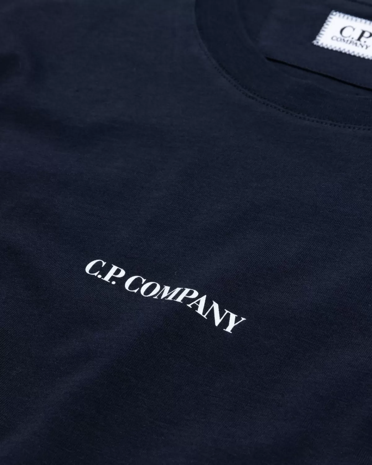 Het Compact Logo T-Shirt, Een Basisstijl Van Cp Company, Is Vervaardigd Van De 30/1 Katoenen Jersey Van Het Merk Voor Een Zeer Ademende, Middelzware Pasvorm. Het Heeft Een Traditionele, Ribgebreide Ronde Hals En Is Voorzien Van Een Klein Logo Dat Aan De Voorkant En In Het Midden Naar Voren Komt.