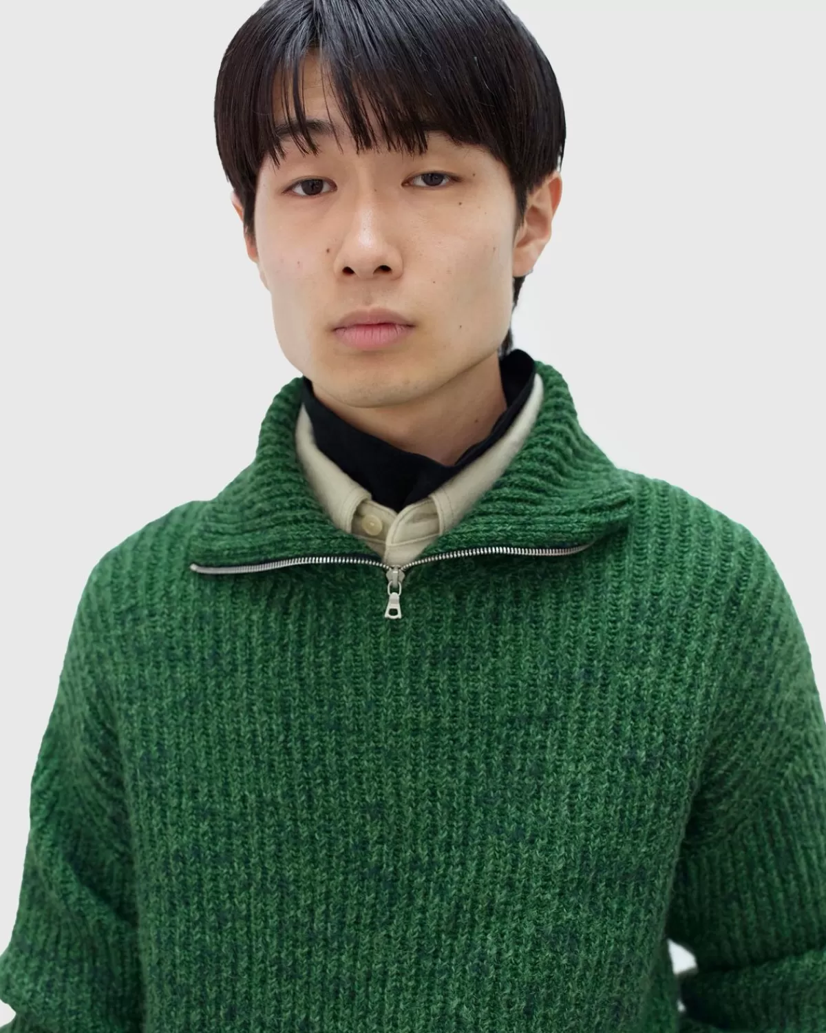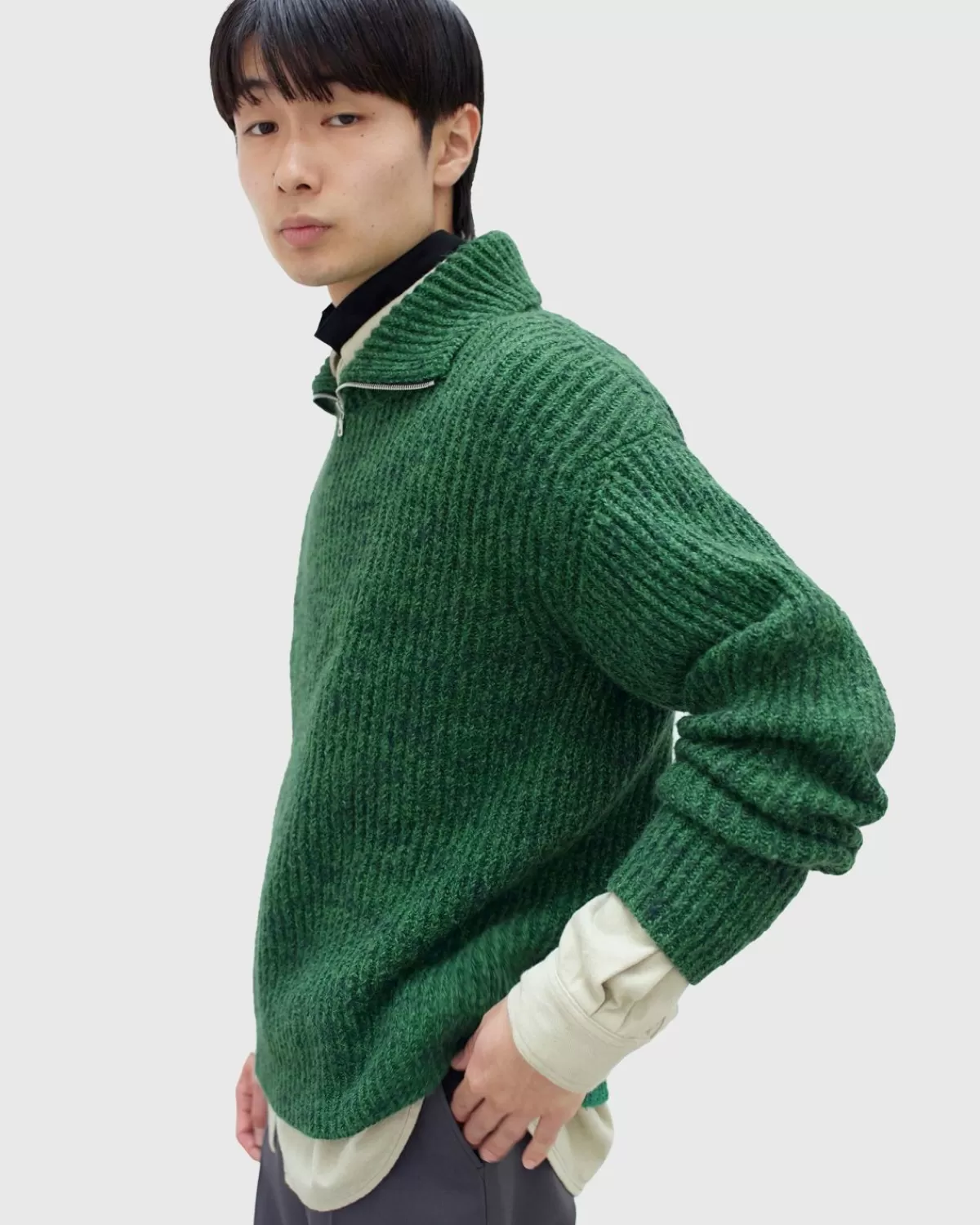 De Stof Van Deze Trui Is Gemaakt Door Ultrafijn Wollen Slub-Garen Te Combineren Met Een Gedraaid Garen Van Franse Merino En Baby-Alpaca En Blijft Zowel Licht Als Volumineus. Met Een Laag Geribd Breisel En Een Kraag Met Ritssluiting Zijn Dit Soort Topstukken In De Garderobe, Gemaakt Met Deskundig Vakmanschap En Fijne Materialen, De Specialiteit Van Auralee Geworden.