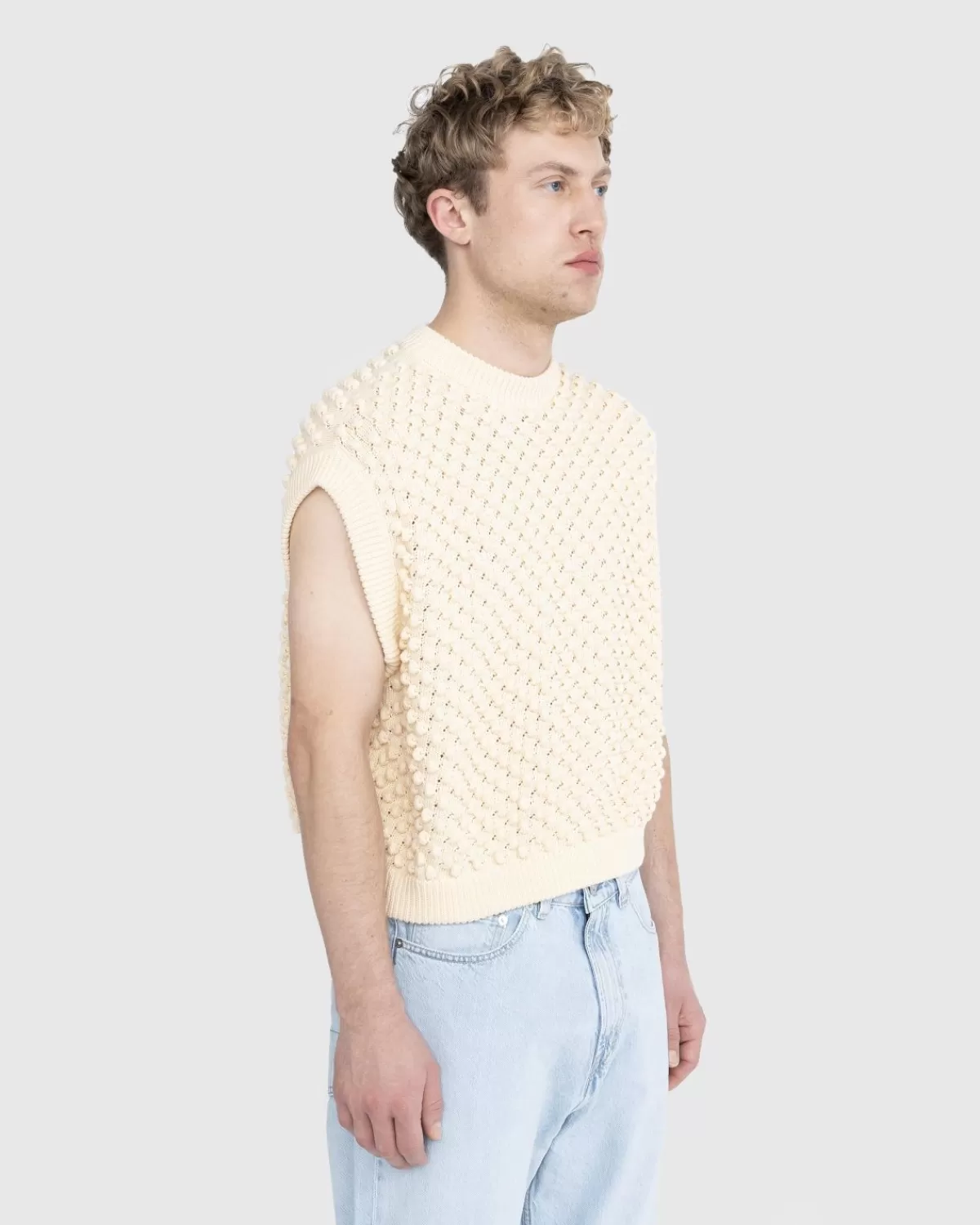 De Knit Gilet Is Een Kenmerkende Stijl Van Bonsai, Hier Aangeboden In Een Neutrale Ivoorkleur Die Gemakkelijk Te Combineren Is. Het Mouwloze Kledingstuk Is Gemaakt Van 100% Katoen En Heeft Een Ingewikkelde 3D-Gebreide Constructie Die Een Semi-Doorzichtige Look Creëert Die Geschikt Is Voor Laagjes. Details Zijn Onder Meer Dikke Geribde Boorden Aan De Ronde Hals, Manchetten En Zoom, Terwijl Het Kledingstuk Minimaal Is Voorzien Van Een Klein Logolabel Aan De Onderkant Van De Zoom. De Bodywarmer Valt Normaal Qua Maat, Maar Is Oversized Gesneden Voor Meer Draagcomfort.
