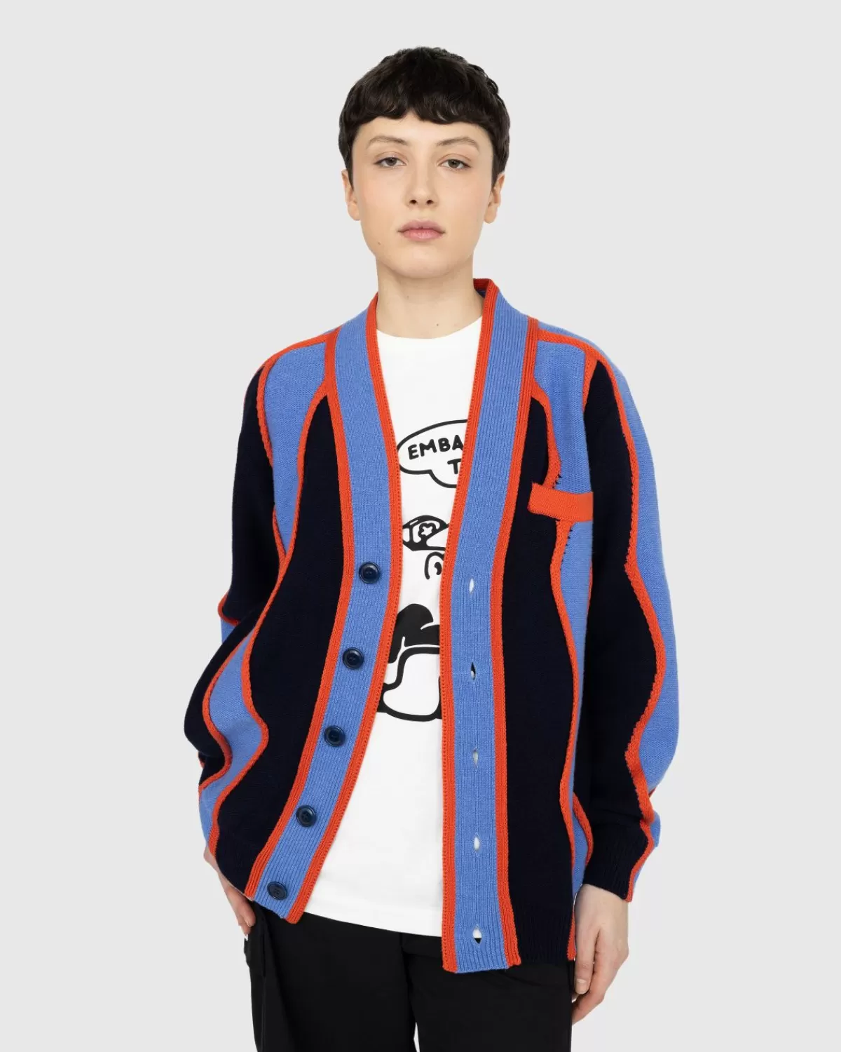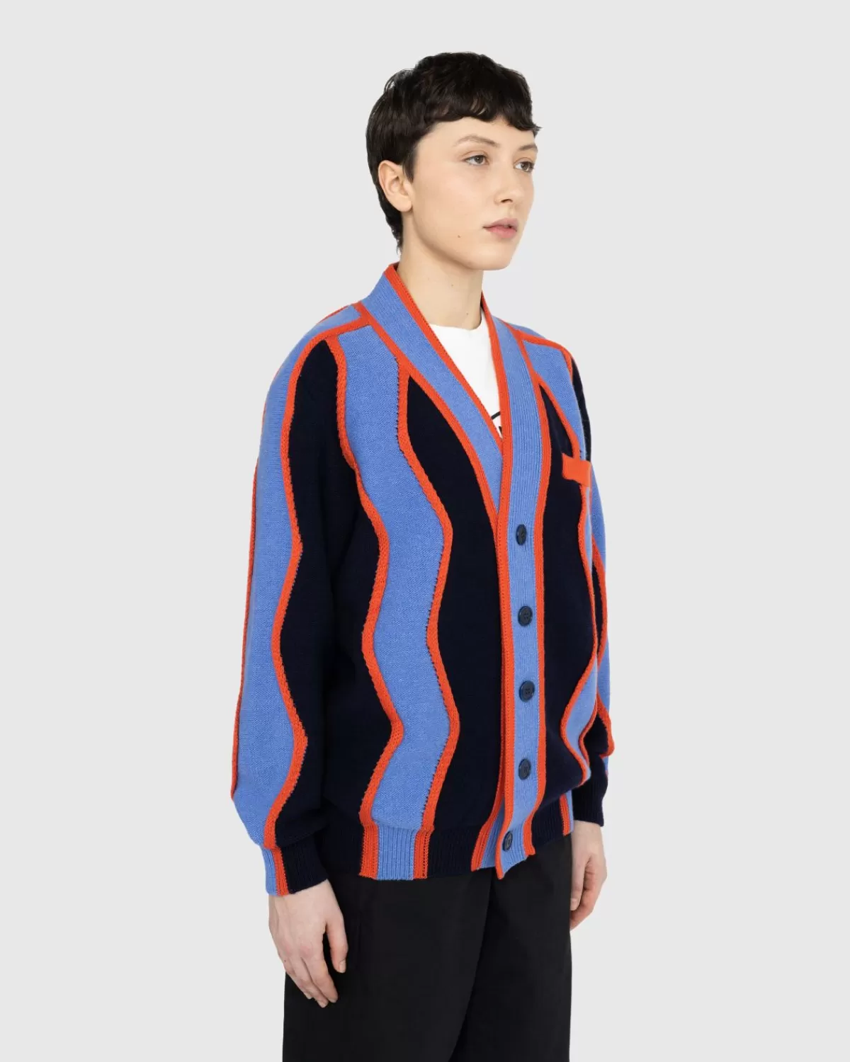 Een Kleurrijk Breiwerk Afkomstig Van Het Parijse Luxehuis Kenzo. Het Rode, Paarse En Zwarte Golvende Streeppatroon Is Geïnspireerd Op Een Print Uit De Jaren 80. De Opvallende, Retrostijl Wordt Geaccentueerd Door Zwarte Knopen, Een Contrasterende Rode Zak Op De Linkerborst En Een ‘Kenzo Paris’-Label Aan De Achterkant. Dit Alles Wordt Aangeboden In Een Boxy-Snit Die Het Op De Jaren 80 Geïnspireerde Ontwerp Verder Actualiseert.