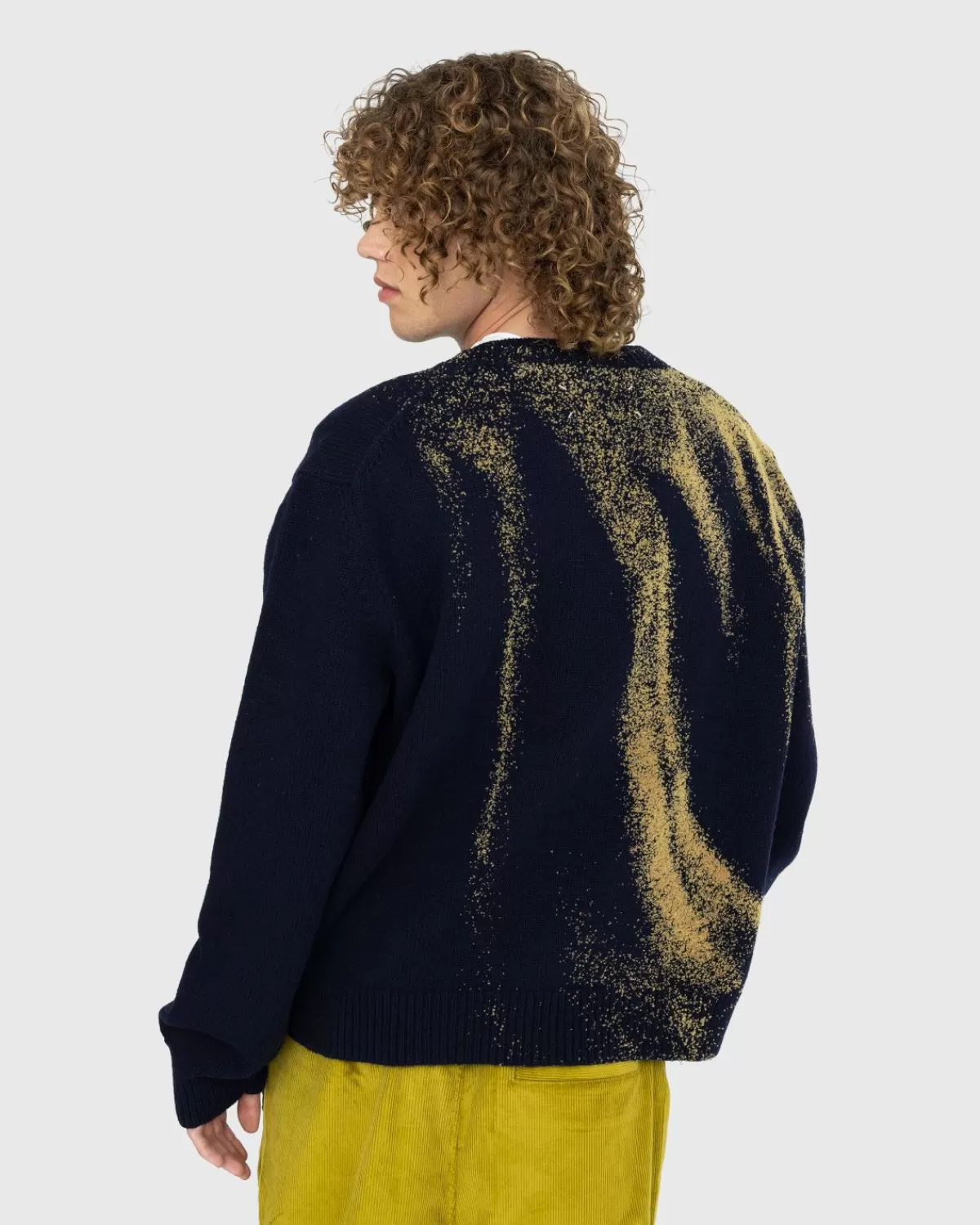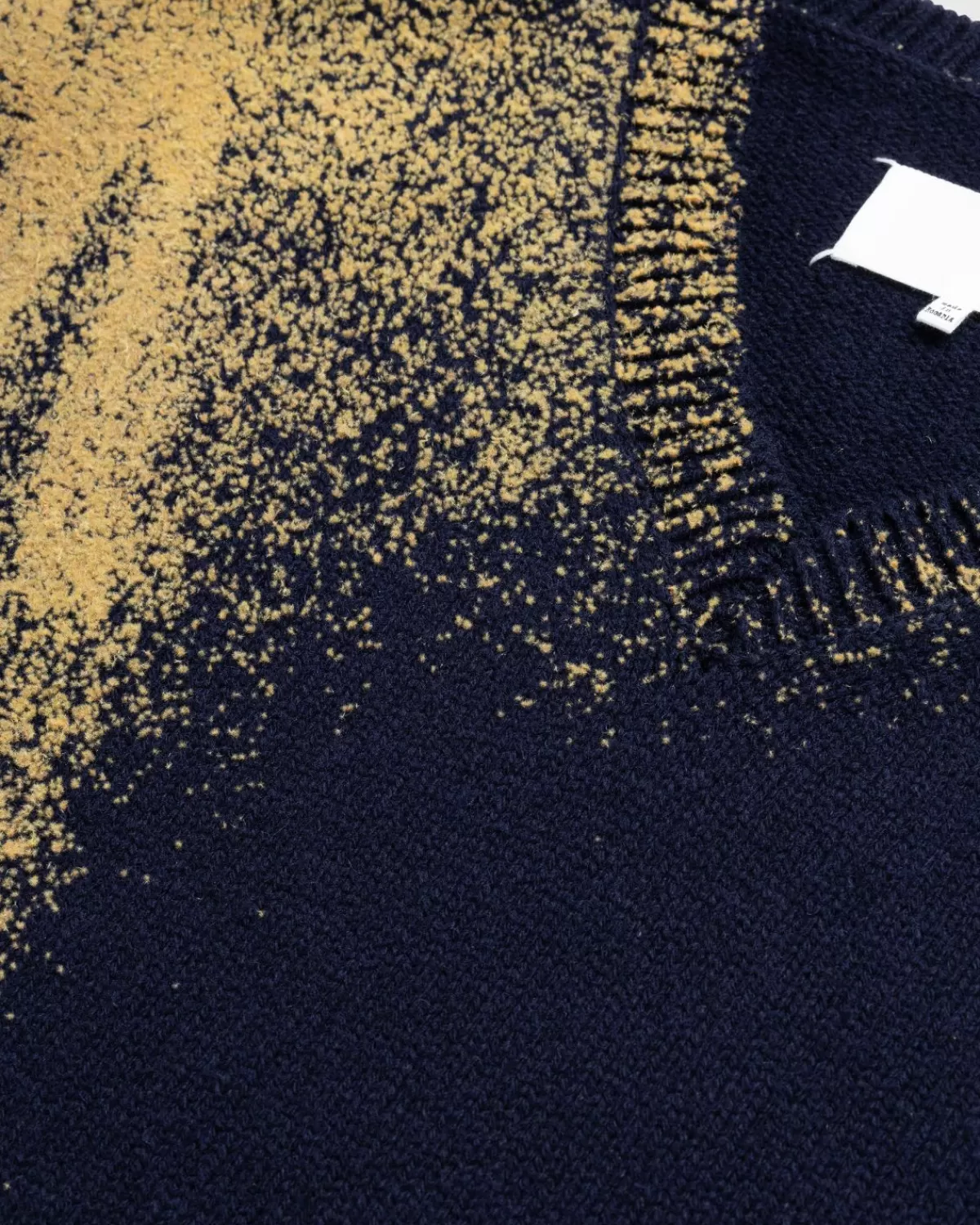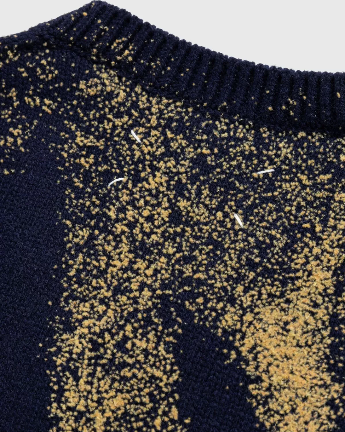 Deze Maison Margiela Trui Met V-Hals Trekt De Aandacht Met Een Opvallend Spettereffect. Het Loszittende Kledingstuk Is Gemaakt Van 100% Wol En Is Gedetailleerd Met Geribde Boorden En Subtiel Gemerkt Met De Iconische Naam Met Vier Steken Van Het Modehuis Op De Achterkant Van De Nek.