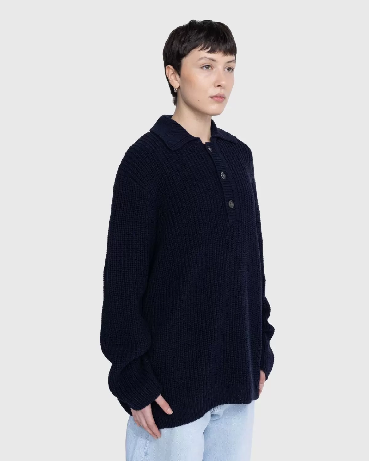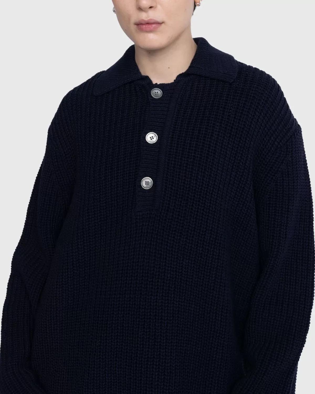 Dit Ontwerp Van Our Legacy Geeft Een Draai Aan Een Klassieke Gebreide Stijl En Heeft Een Oversized Pasvorm Voor Optimaal Comfort. De Natuurlijke Kenmerken Van Het Garen Zijn Gemaakt Van Een Geribbeld Breisel Van Zwaar Italiaans Katoen En Zorgen Ervoor Dat De Vorm Van De Trui Zich In De Loop Van De Tijd Zal Aanpassen Aan De Drager. De Polokraag Heeft Drie Parelmoeren Knopen En Een Gebreide Kraag Met Punt.