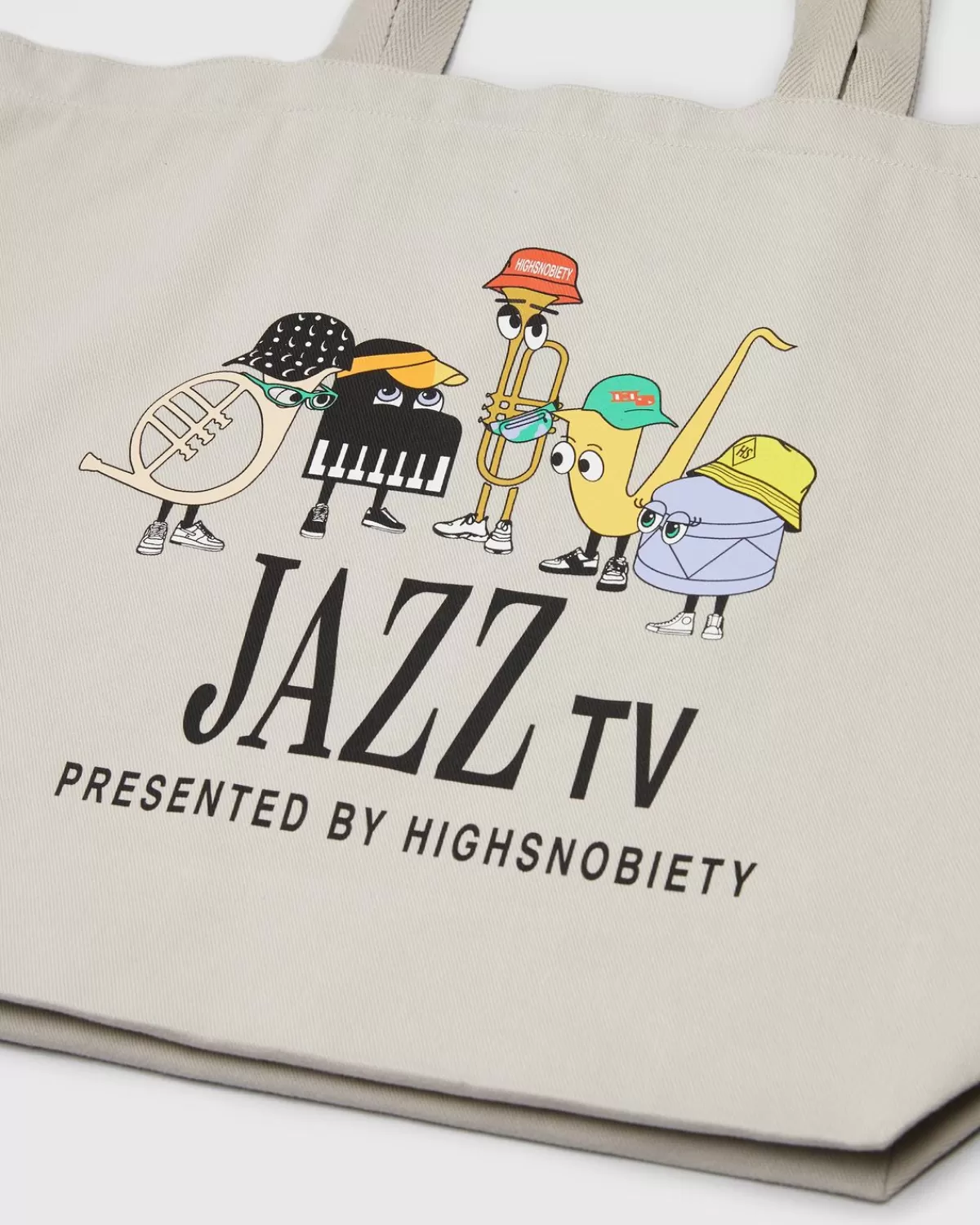 Deze Beige Draagtas Is In Portugal Geproduceerd Van 100 Procent Katoen En Ontworpen In Berlijn. De Grafische Kenmerken Zijn Het Jazz Tv Ensemble, Bedacht Door Highsnobiety.
