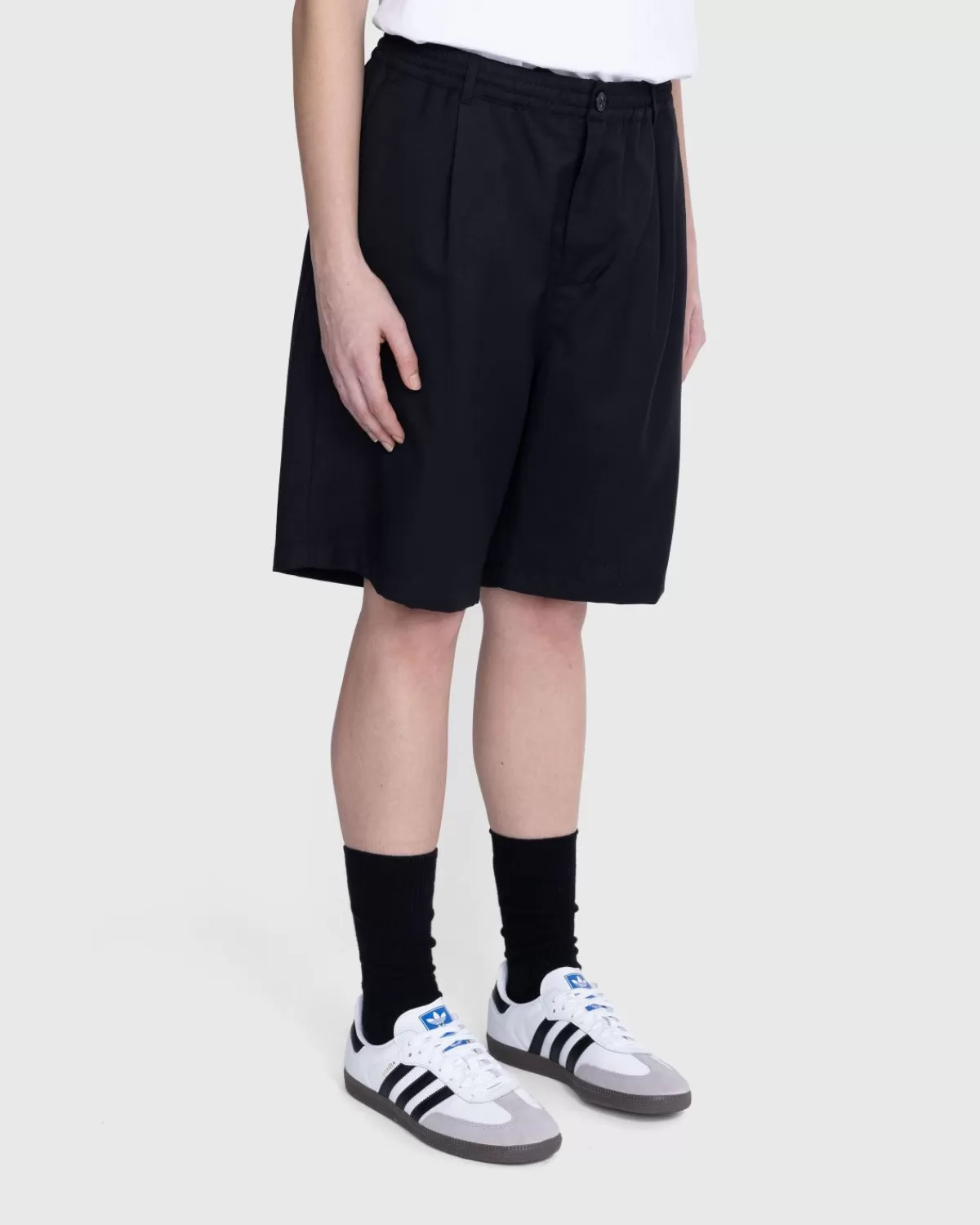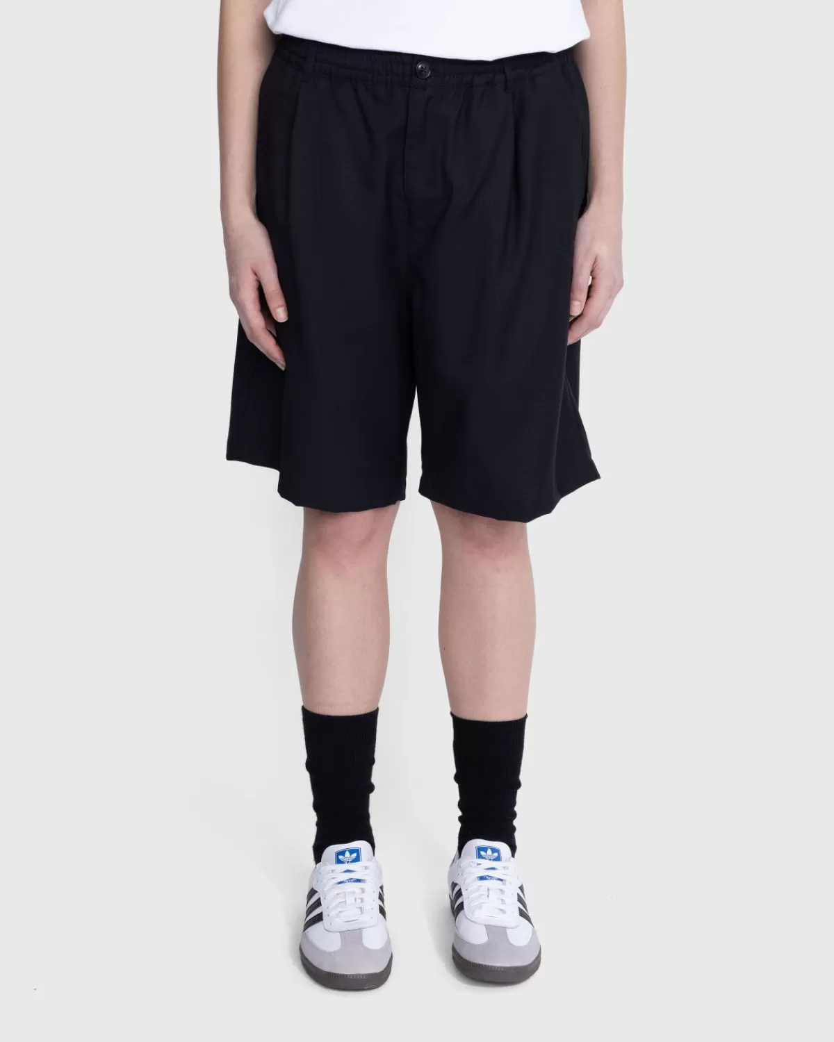 Deze Short Is Gemaakt Van Een Lichtgewicht, Tropische Wolmix En Biedt Een Meer Formele Beenmode Voor De Warmste Maanden. Ze Hebben Een Relaxte, Wijde Pasvorm, Geplooide Details En Een Elastische Taille Voor Extra Comfort. De Short Heeft Twee Schuine Steekzakken Aan De Voorzijde En Twee Achterzakken. Er Is Ook Een Bijpassende Jas En Broek Verkrijgbaar Bij Highsnobiety.