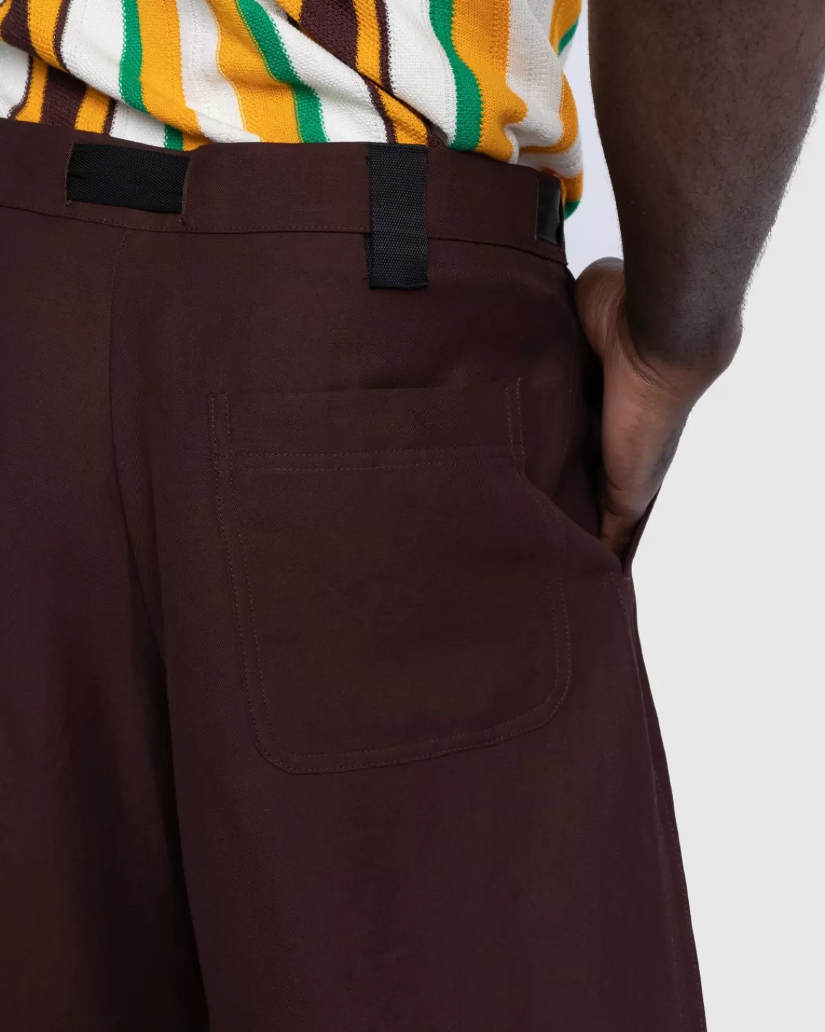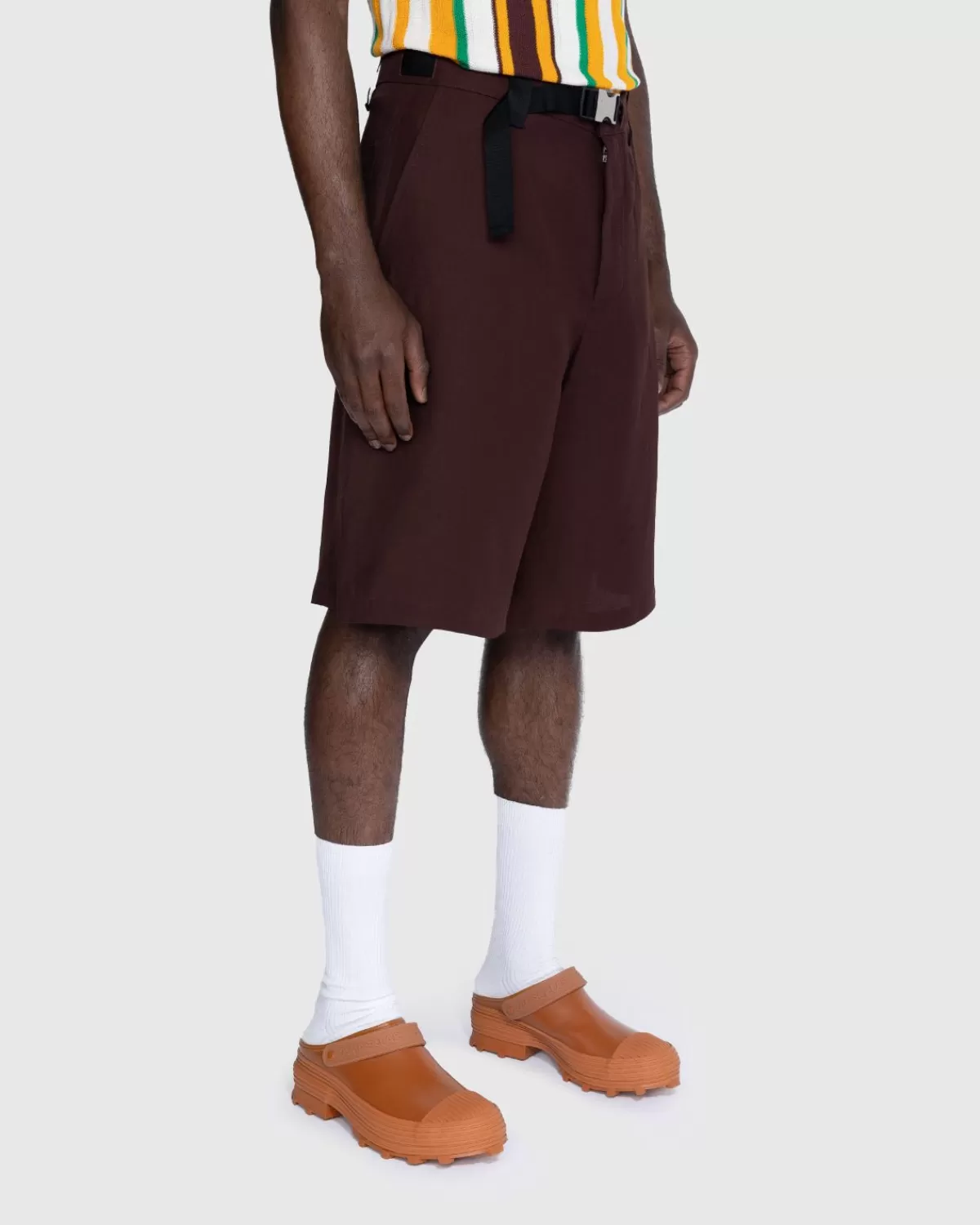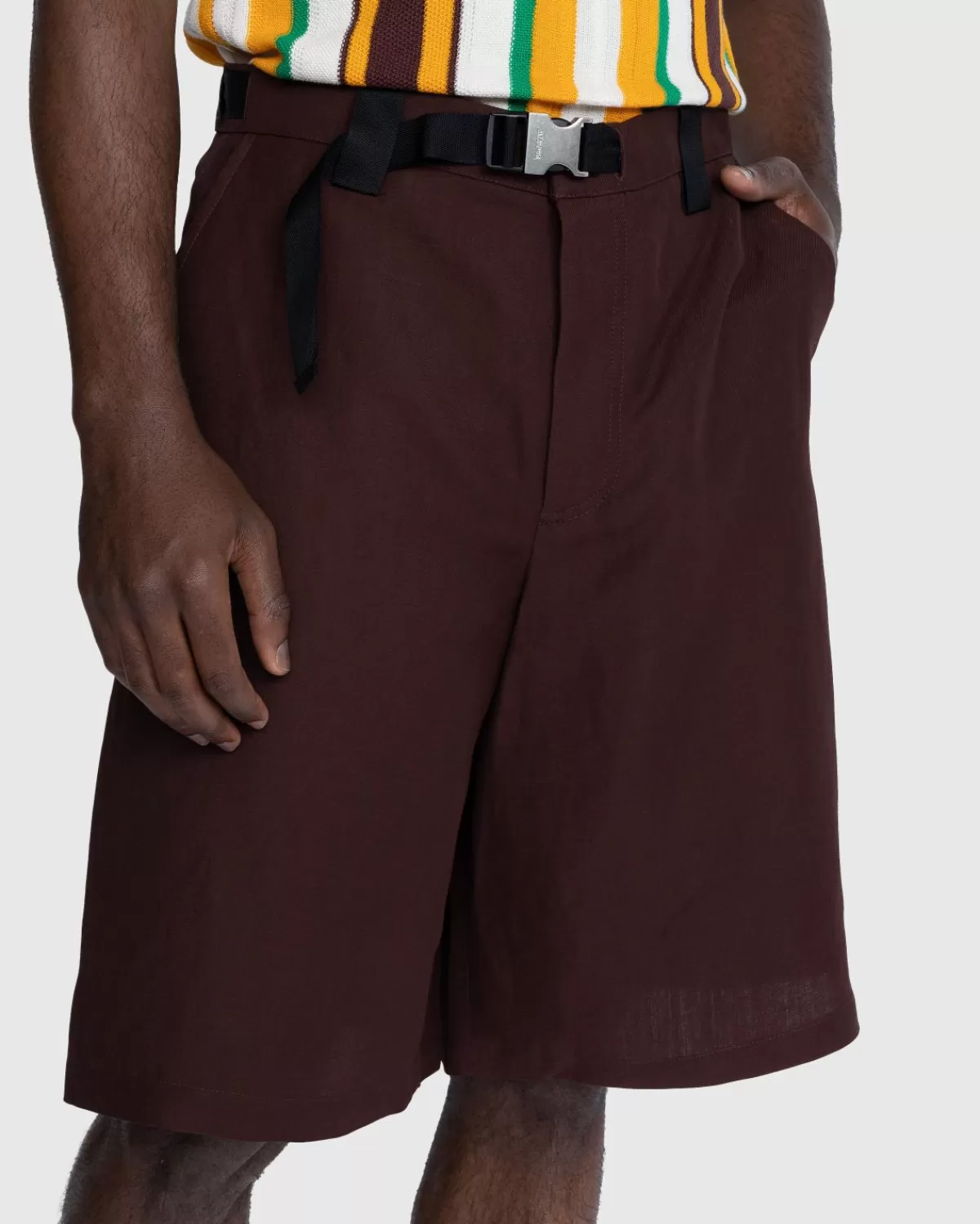 Le Short Meio Is In Een Oversized Pasvorm Gemaakt Van Soepele Keperviscose. Het Model Heeft Een Verborgen Ritssluiting, Riemlussen, Een Zichtbaar Trekkoord In De Taille En Een Contrasterende Nylon Riem Met Een Gegraveerde Metalen Clip. Functionele Zakken Zijn Zowel Aan De Zijkanten Als Aan De Achterkant Verwerkt Om Het Ontwerp Compleet Te Maken.